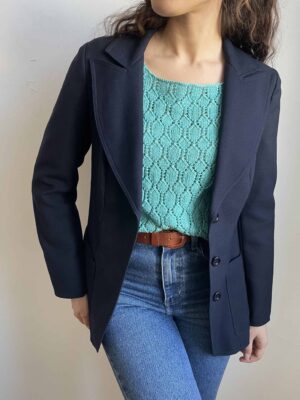 Elegante blazer vintage in lana blu notte e collo in velluto