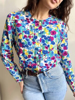 Camicia blusa vintage con scollo rotondo a fiori colorati
