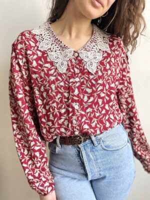 Camicia vintage 100% viscosa rossa a fiori e colletto crochet