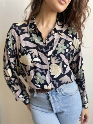 Camicia vintage 100% viscosa blu scuro con fiori stilizzati pastello