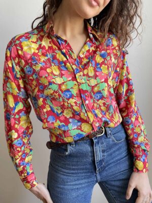 Camicia vintage 100% seta rosso acceso a fiori colorati