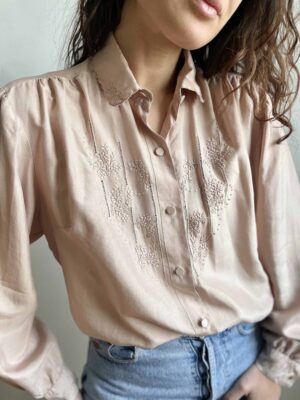 Camicia vintage 100% seta rosa antico con ricami maniche a sbuffo