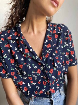 Camicetta vintage francese in viscosa nera a fiori rossi e bianchi