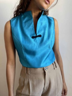 Camicetta vintage asiatica 100% seta grezza cangiante azzurra