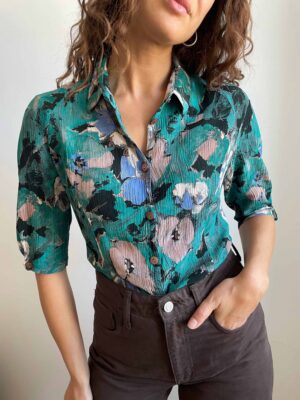 Camicetta vintage mezza manica 100% viscosa verde e marrone