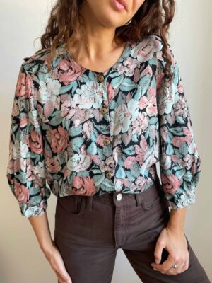 Camicia vintage manica tre quarti in viscosa a fiori rosa e azzurri