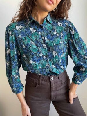Camicia vintage 100% viscosa fiori blu e verdi manica a tre quarti