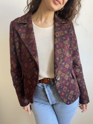 Giacca vintage in tessuto tapestry colorato con martingala sul retro
