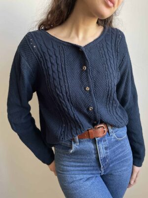 Cardigan traforato vintage giallo pastello con bottoni in tessuto