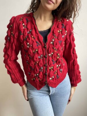 Raro cardigan tirolese 100% lana rossa con ricami a fiori