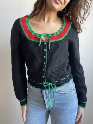 Cardigan vintage tirolese in lana nero con nastri verdi