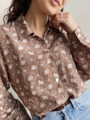 Camicia vintage 100% seta marrone chiaro a fiori e madreperle