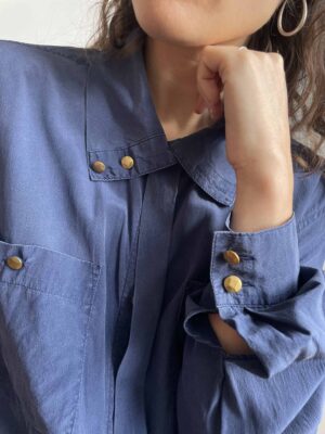 Camicia vintage in 100% seta blu con bottoni dorati e collo lupetto