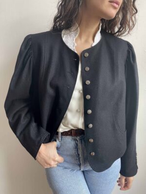 Giacca vintage tirolese 100% lana nera crop e maniche a sbuffo