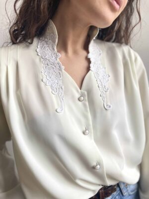 Camicia vintage tirolese misto cotone bianco con pizzo e ruches