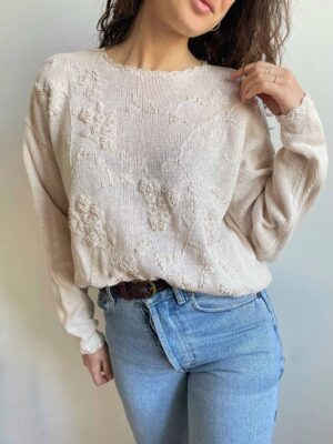 Maglione vintage beige in cotone e pregiata ramia ricamata