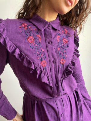 Abito lungo chemisier 100% viscosa viola e ricami a fiori