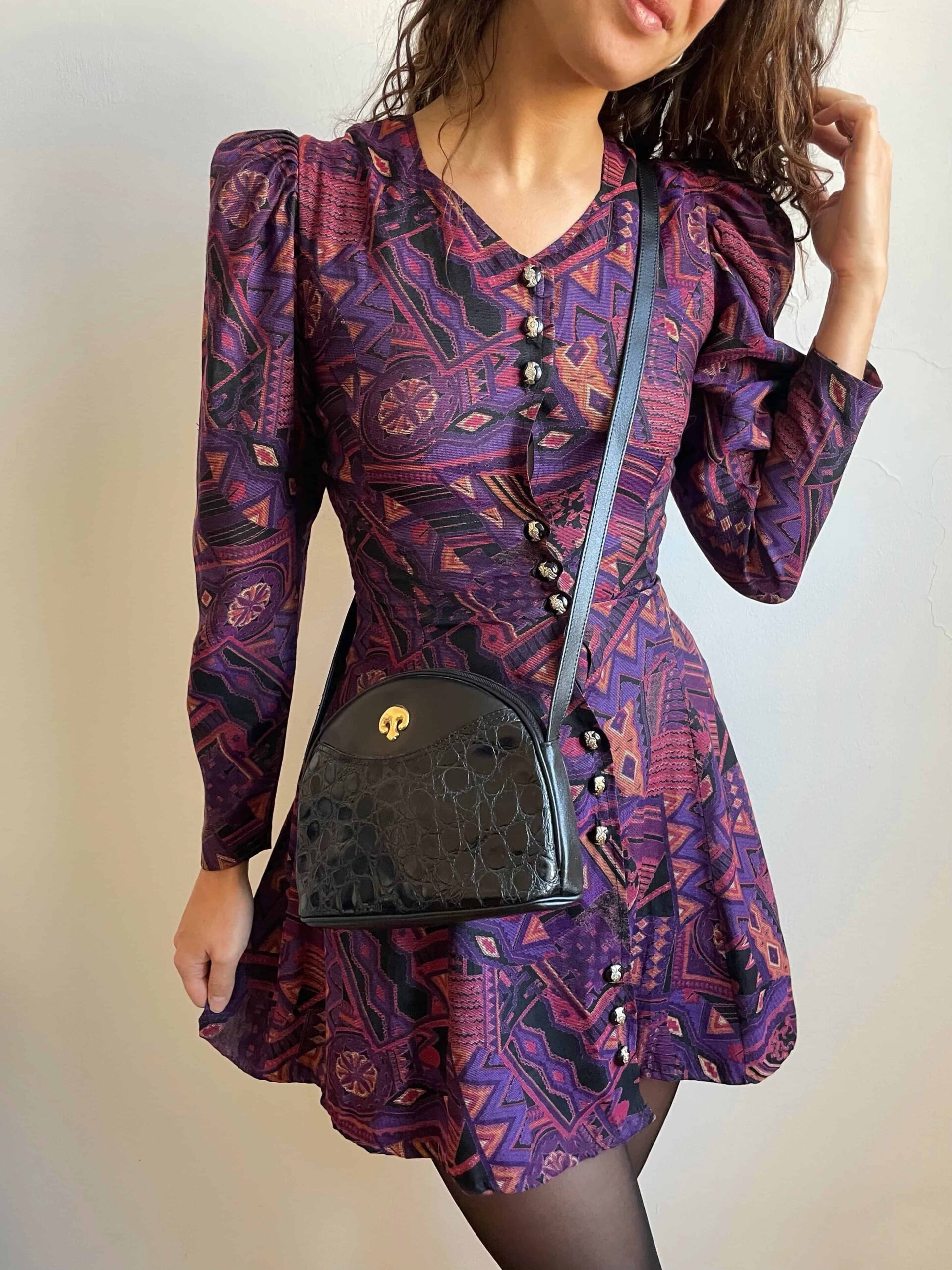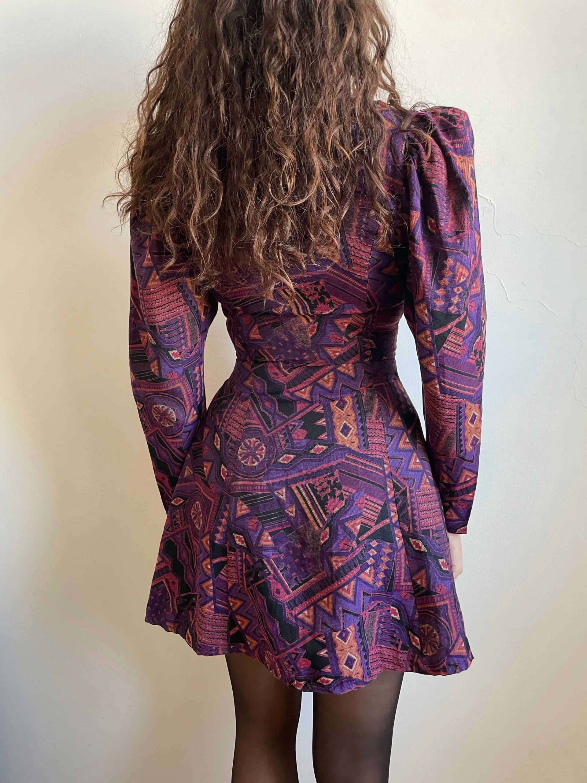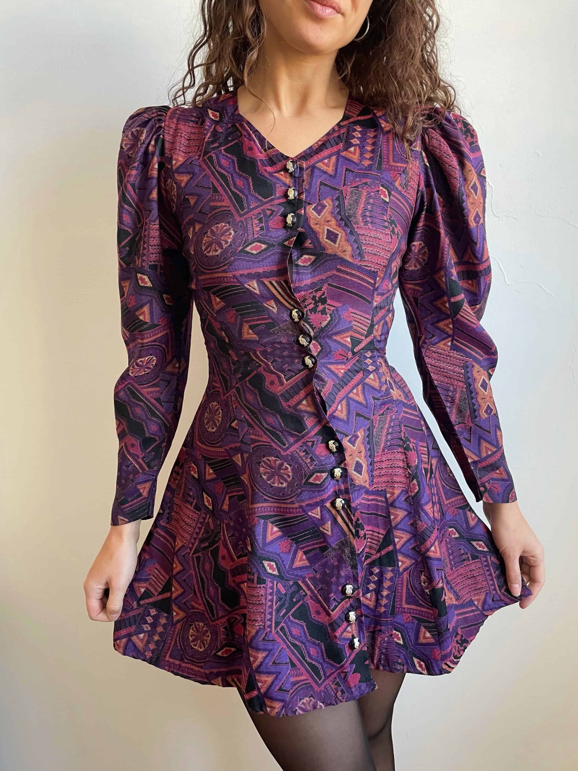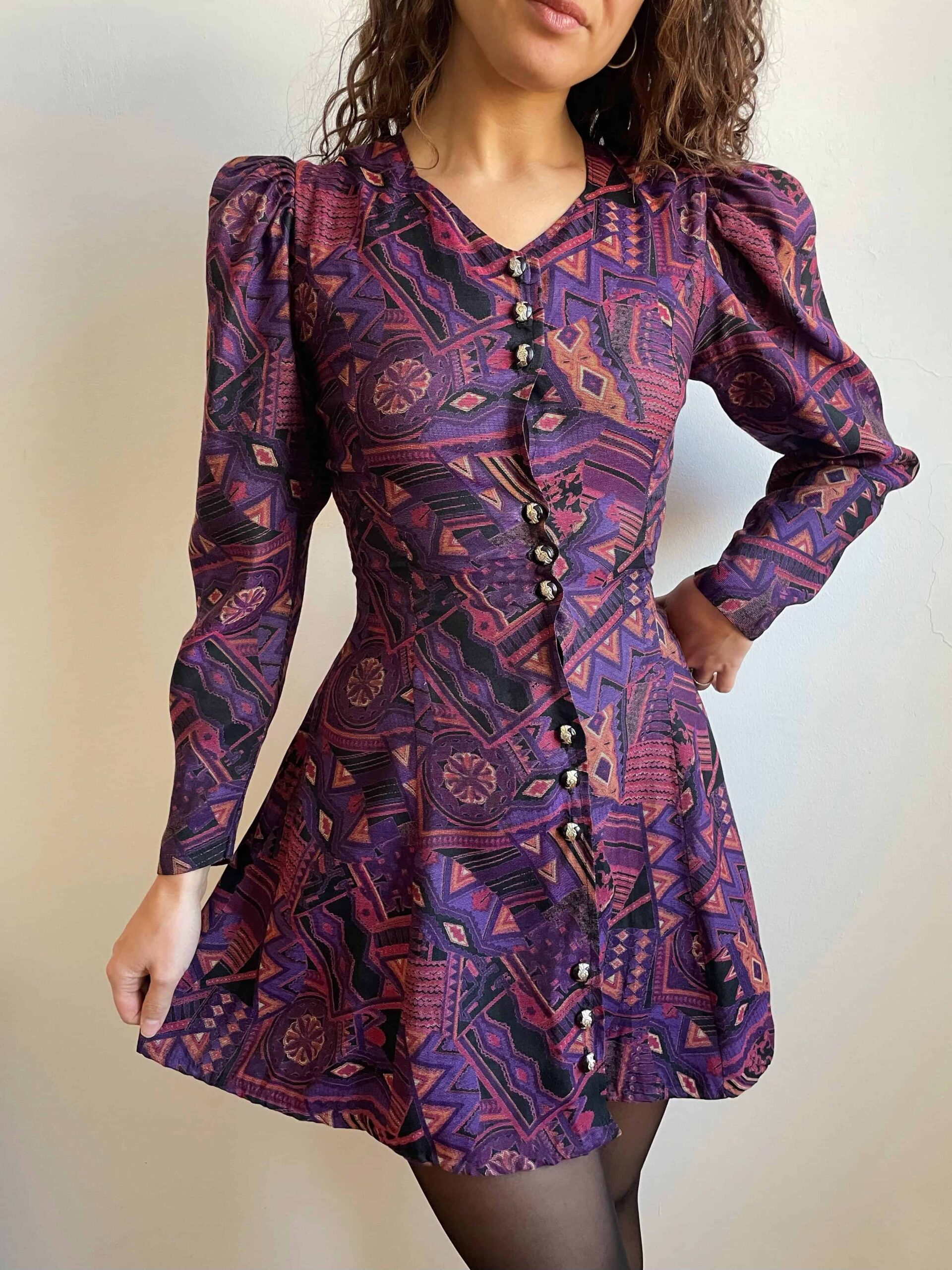 Splendido abito vintage made in Corea con fantasia etnica sui toni del viola e nero. Bellissima fattura con maniche lunghe a sbuffo, scollo a cuore, bottoni con dettagli dorati raggruppati a tre, molto sfiancata in vita e poi minigonna svasata. La composizione non è presente, sembrerebbe una viscosa abbastanza spessa, adatta a questa stagione. Rara taglia XS/38 perché la vita è molto stretta. Fate riferimento alle misure confrontandole con quelle di un vostro abito: