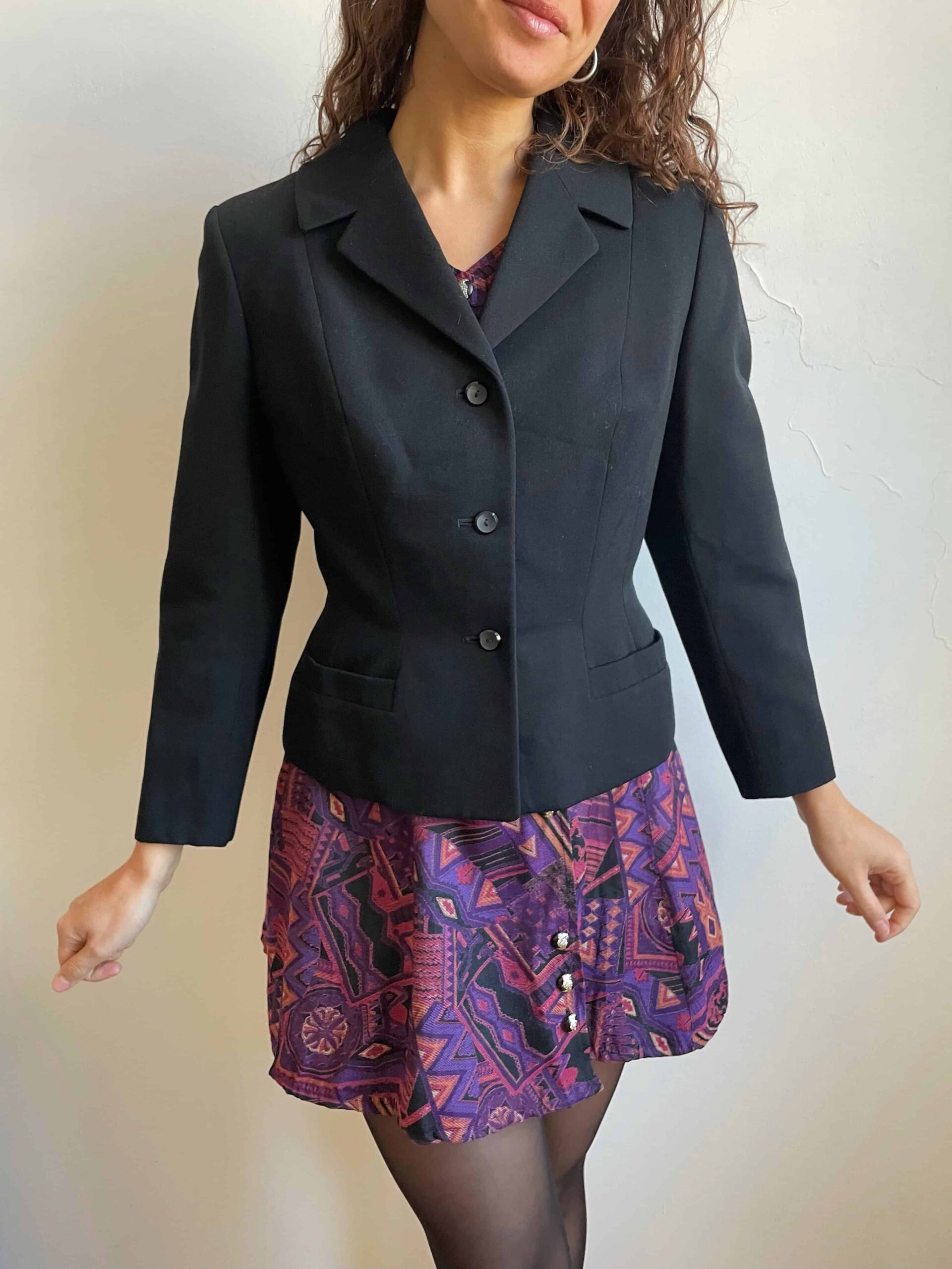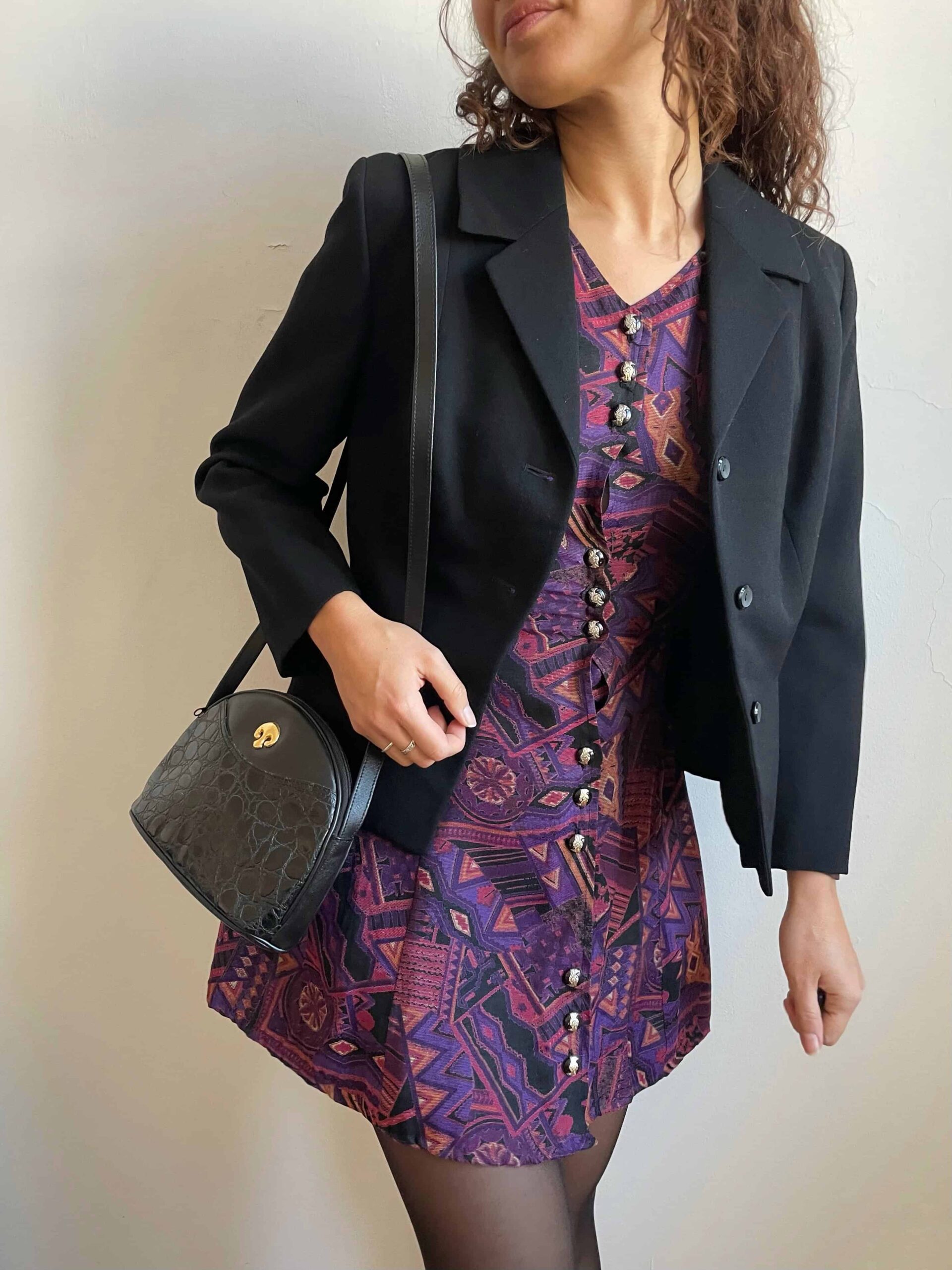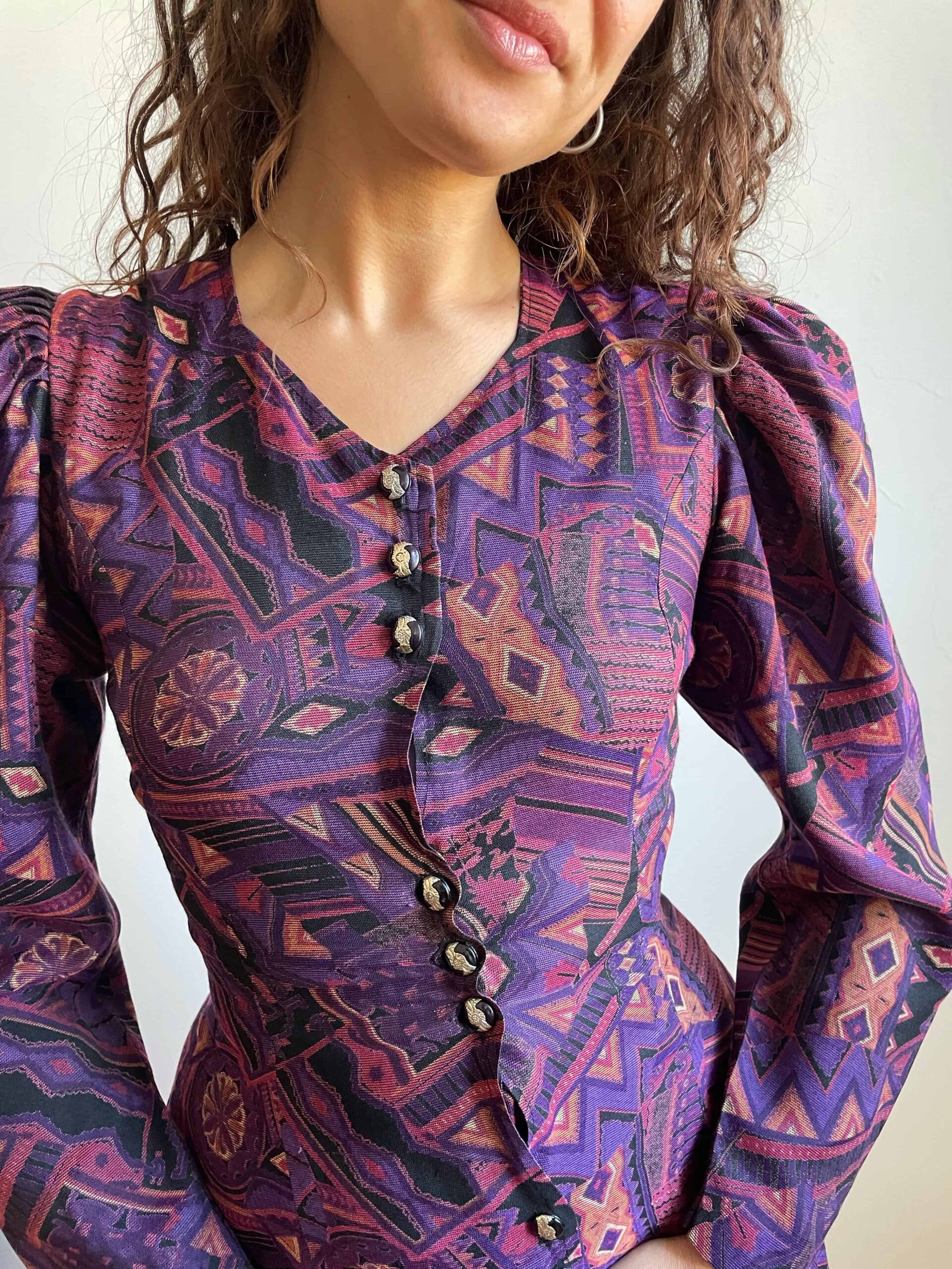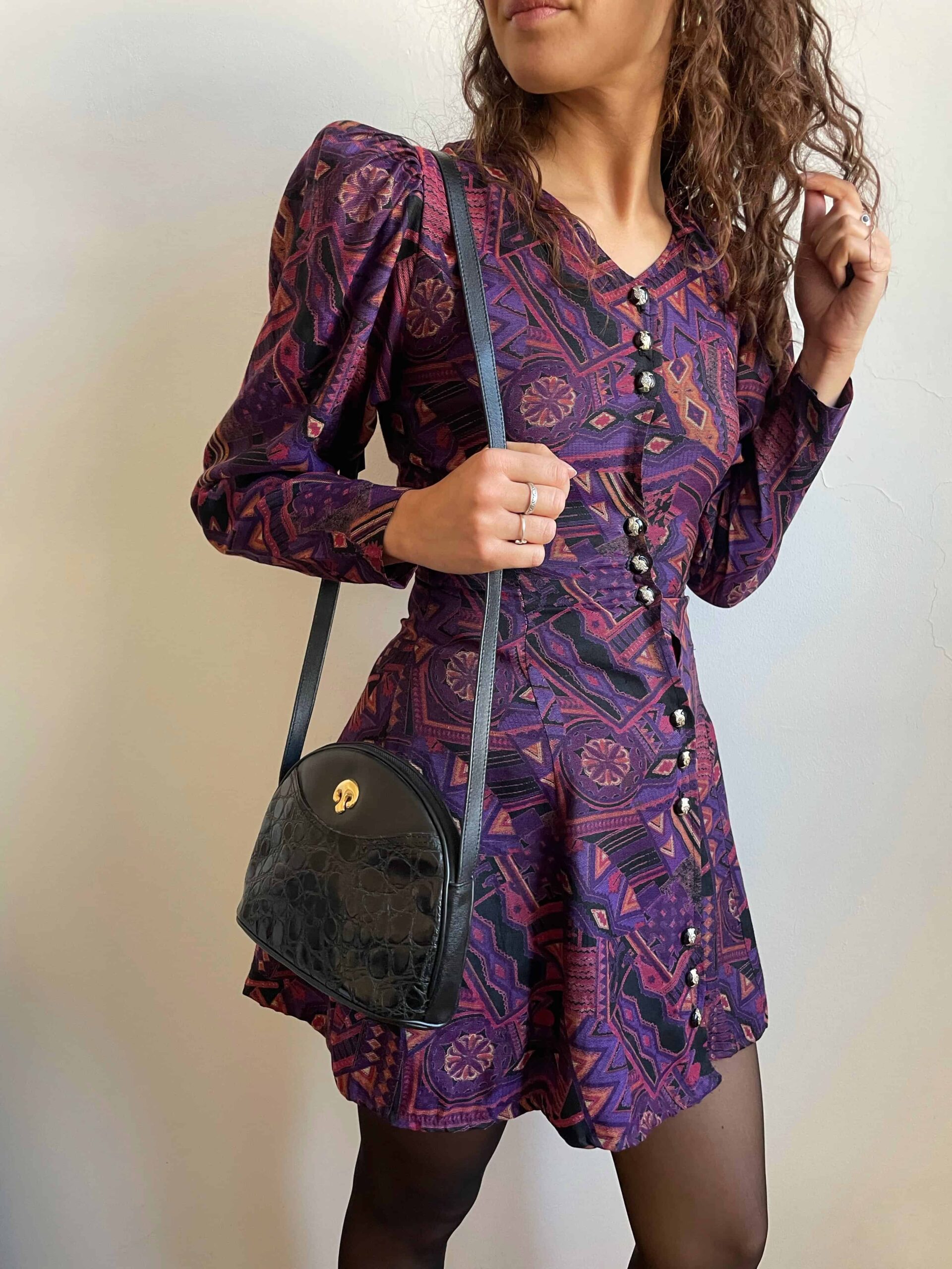 Splendido abito vintage made in Corea con fantasia etnica sui toni del viola e nero. Bellissima fattura con maniche lunghe a sbuffo, scollo a cuore, bottoni con dettagli dorati raggruppati a tre, molto sfiancata in vita e poi minigonna svasata. La composizione non è presente, sembrerebbe una viscosa abbastanza spessa, adatta a questa stagione. Rara taglia XS/38 perché la vita è molto stretta. Fate riferimento alle misure confrontandole con quelle di un vostro abito: