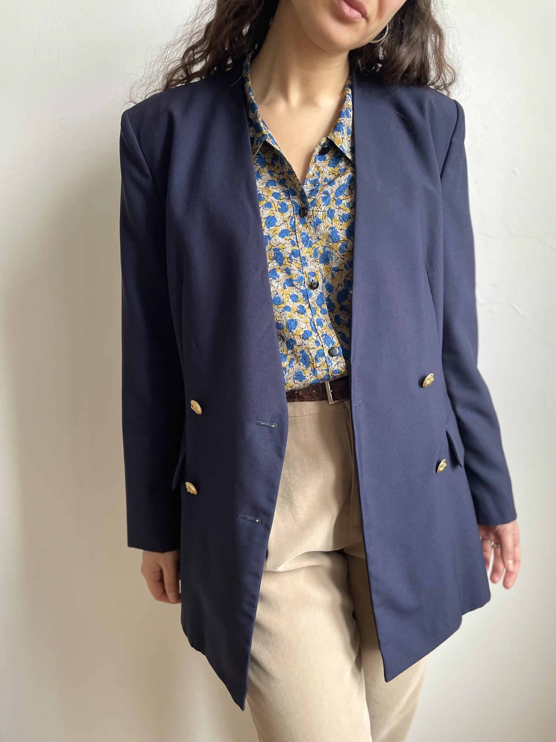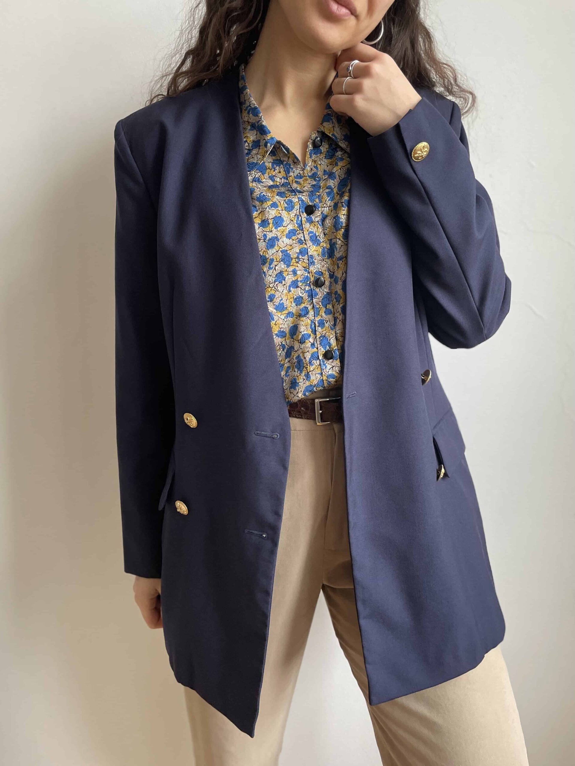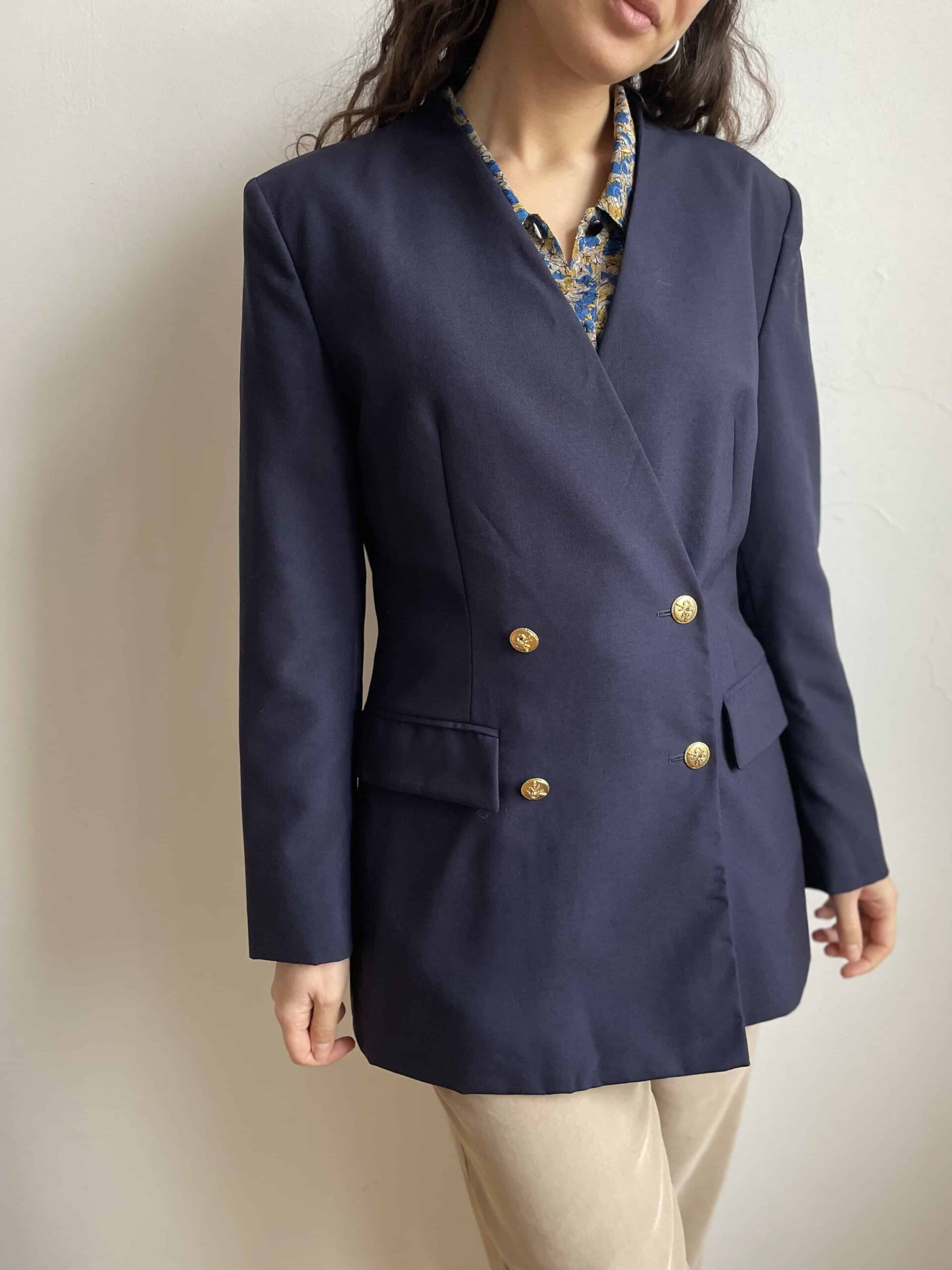 Bellissimo ed elegante blazer lungo/giacca vintage color blu notte. Bellissima fattura, con chiusura doppiopetto formata da bottoni dorati con un fiocco inciso. Bottoni anche sui polsini. Senza colletto, questa lunghezza lo rende ideale anche da indossare sopra ad abiti corti o minigonna. Tessuto di qualità, medio peso, adatto anche all’imminente primavera in 50% lana e 50% viscosa. Dotato di fodera interna. Bellissima vestibilità un po’ sfiancato in vita, eleganza senza tempo. Taglia indicativa 42. Fate riferimento alle misure confrontandole con quelle di un vostro blazer: