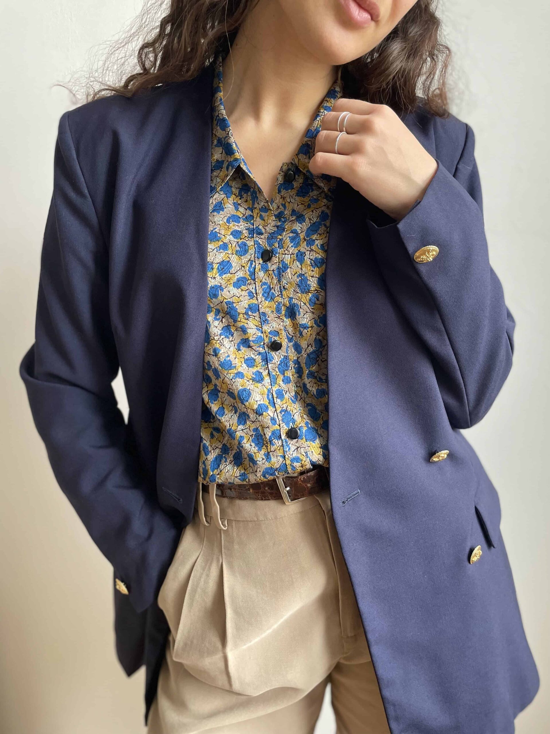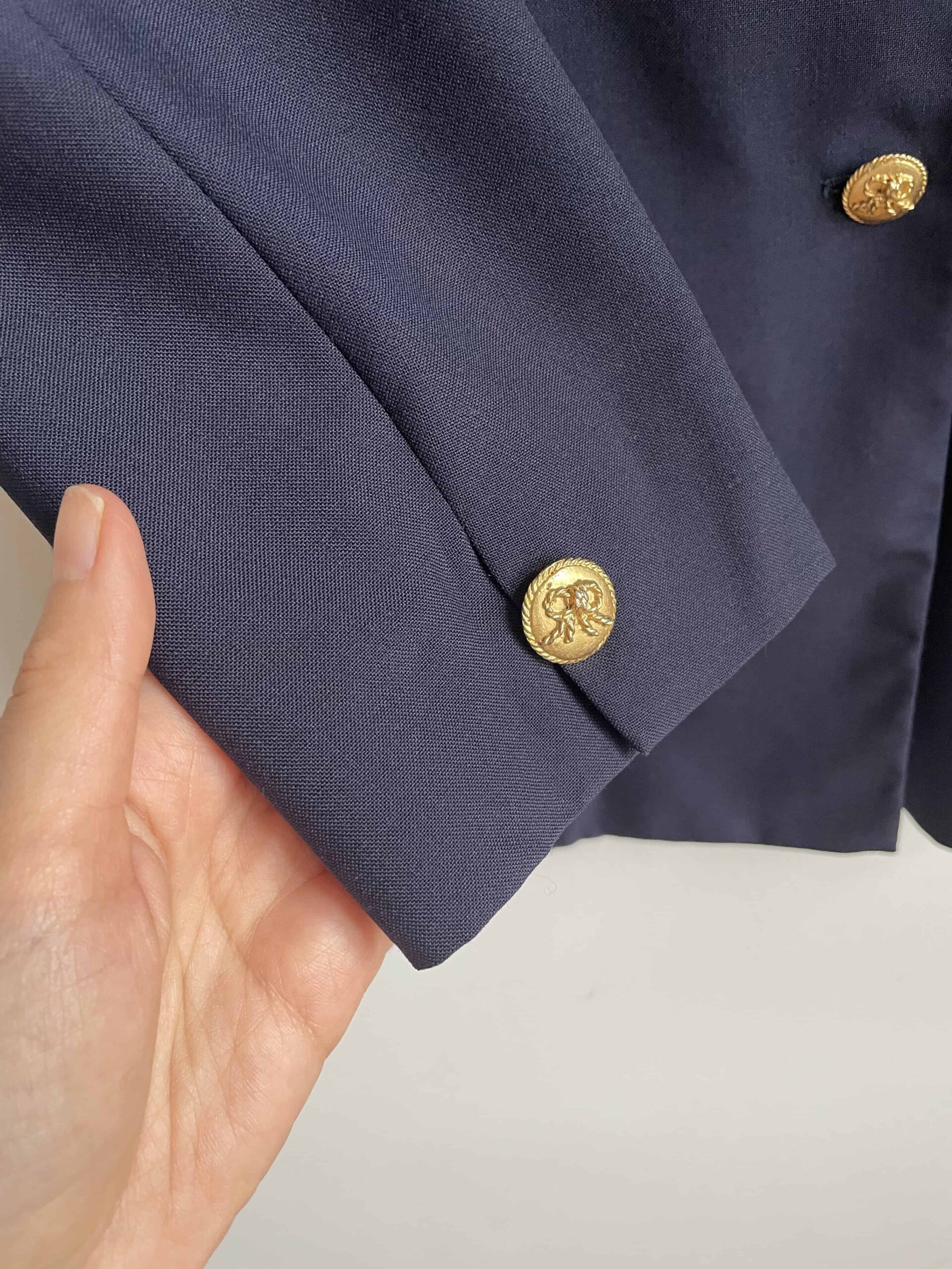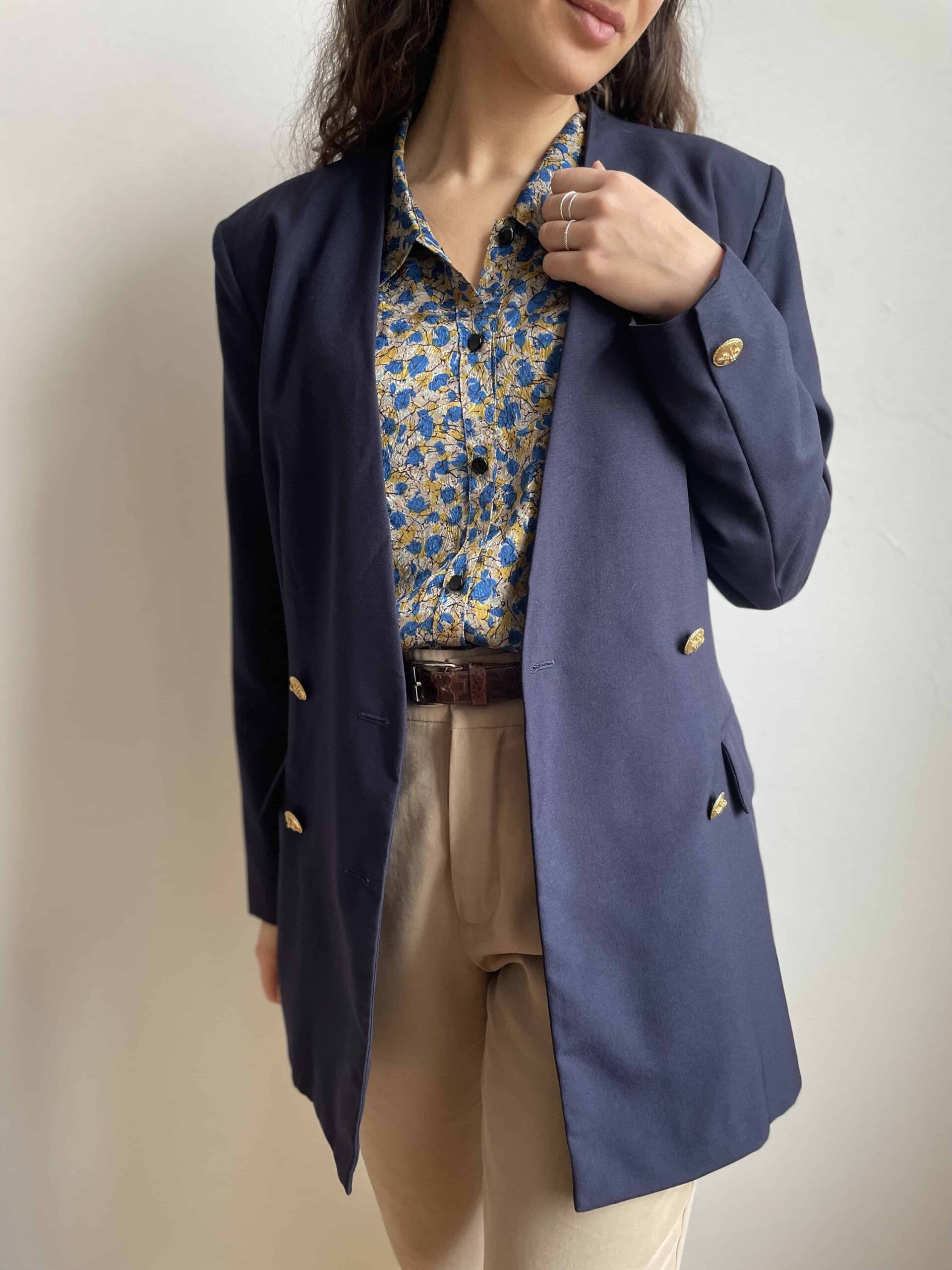 Bellissimo ed elegante blazer lungo/giacca vintage color blu notte. Bellissima fattura, con chiusura doppiopetto formata da bottoni dorati con un fiocco inciso. Bottoni anche sui polsini. Senza colletto, questa lunghezza lo rende ideale anche da indossare sopra ad abiti corti o minigonna. Tessuto di qualità, medio peso, adatto anche all’imminente primavera in 50% lana e 50% viscosa. Dotato di fodera interna. Bellissima vestibilità un po’ sfiancato in vita, eleganza senza tempo. Taglia indicativa 42. Fate riferimento alle misure confrontandole con quelle di un vostro blazer: