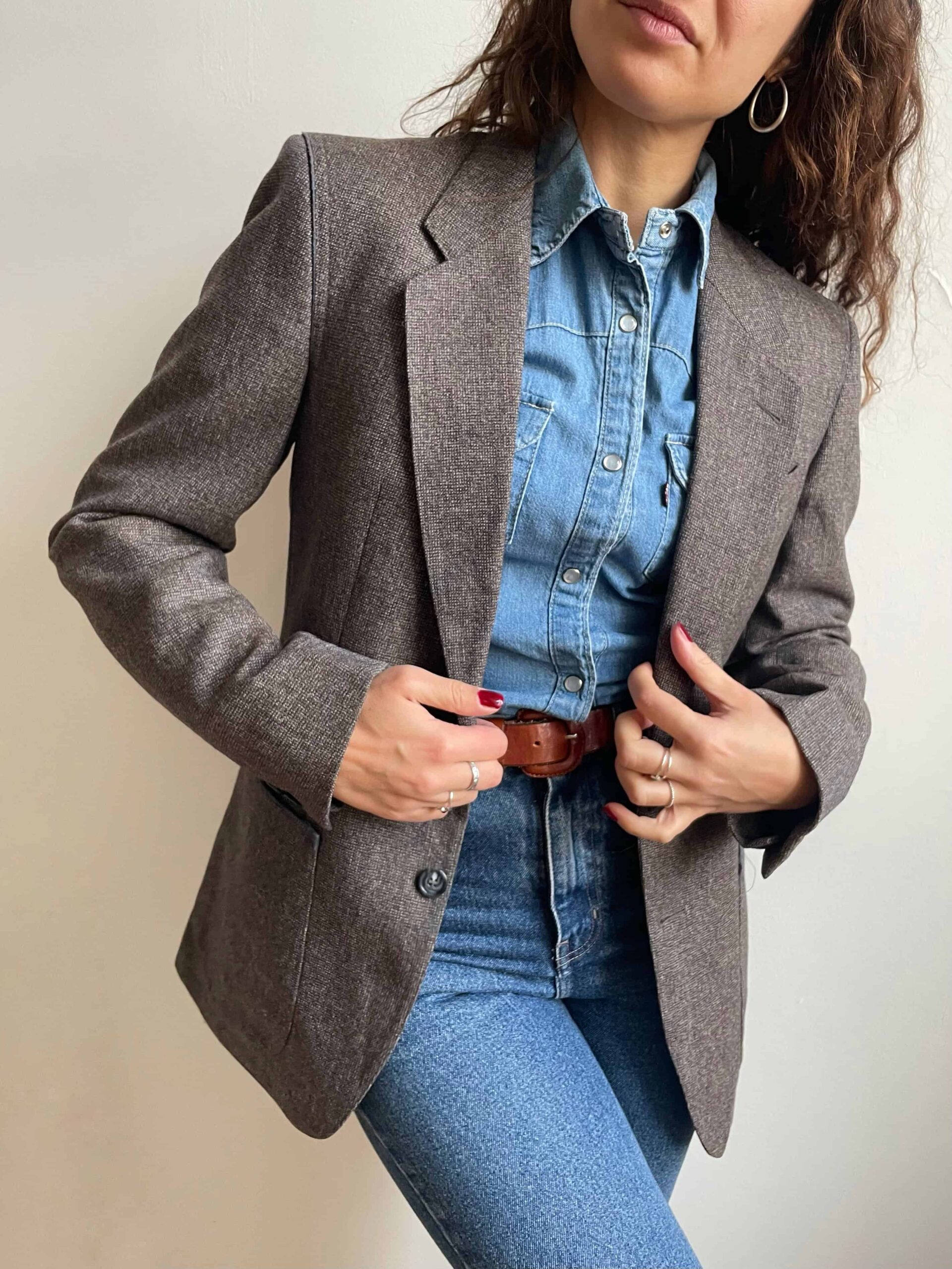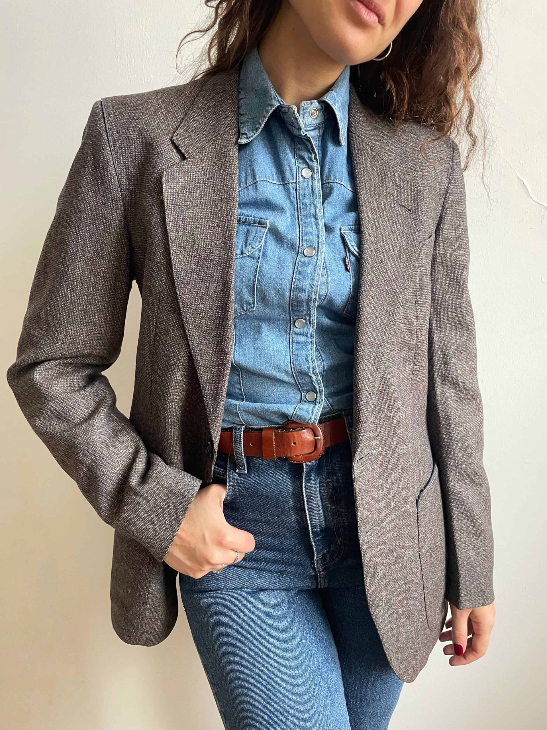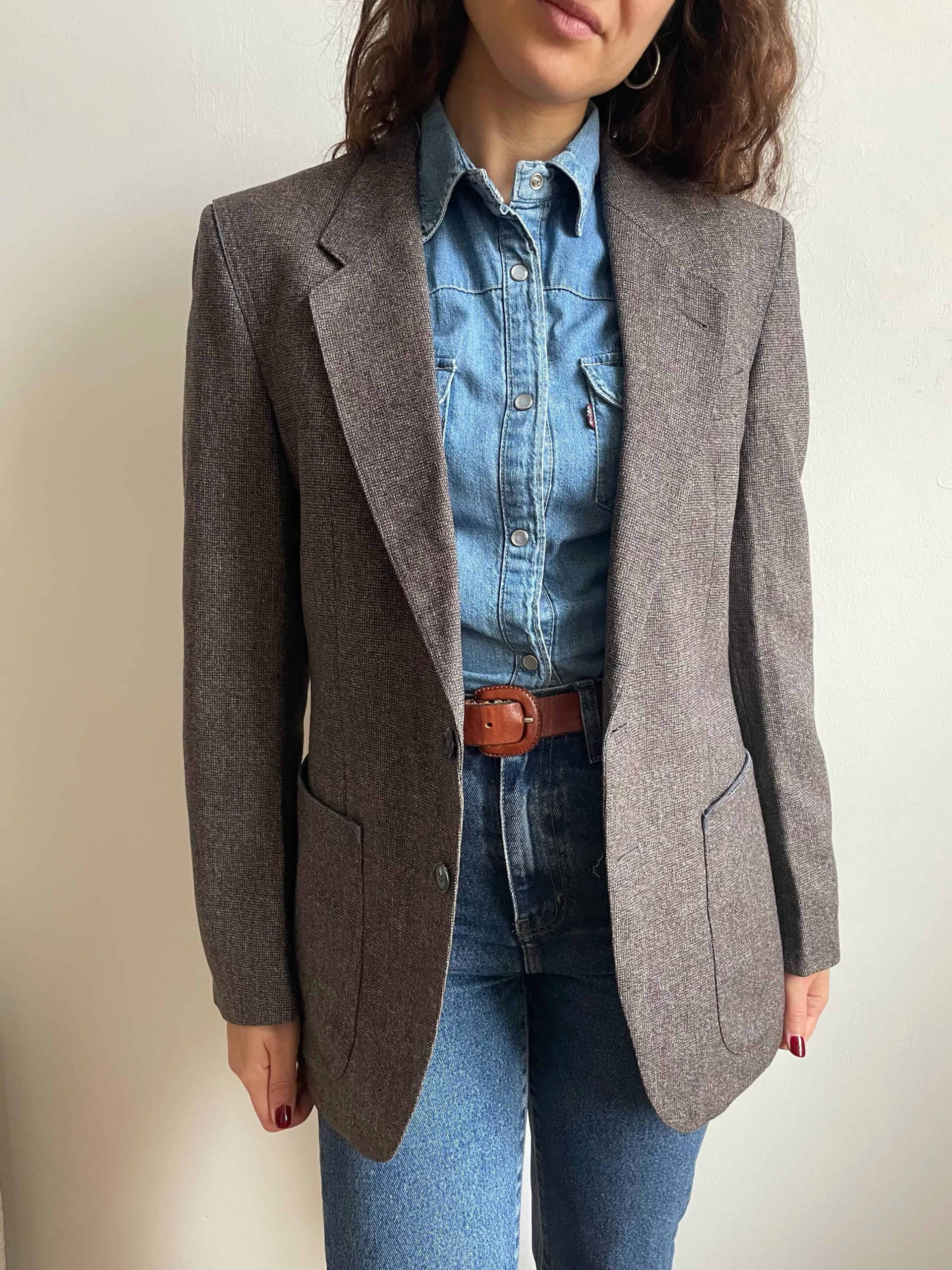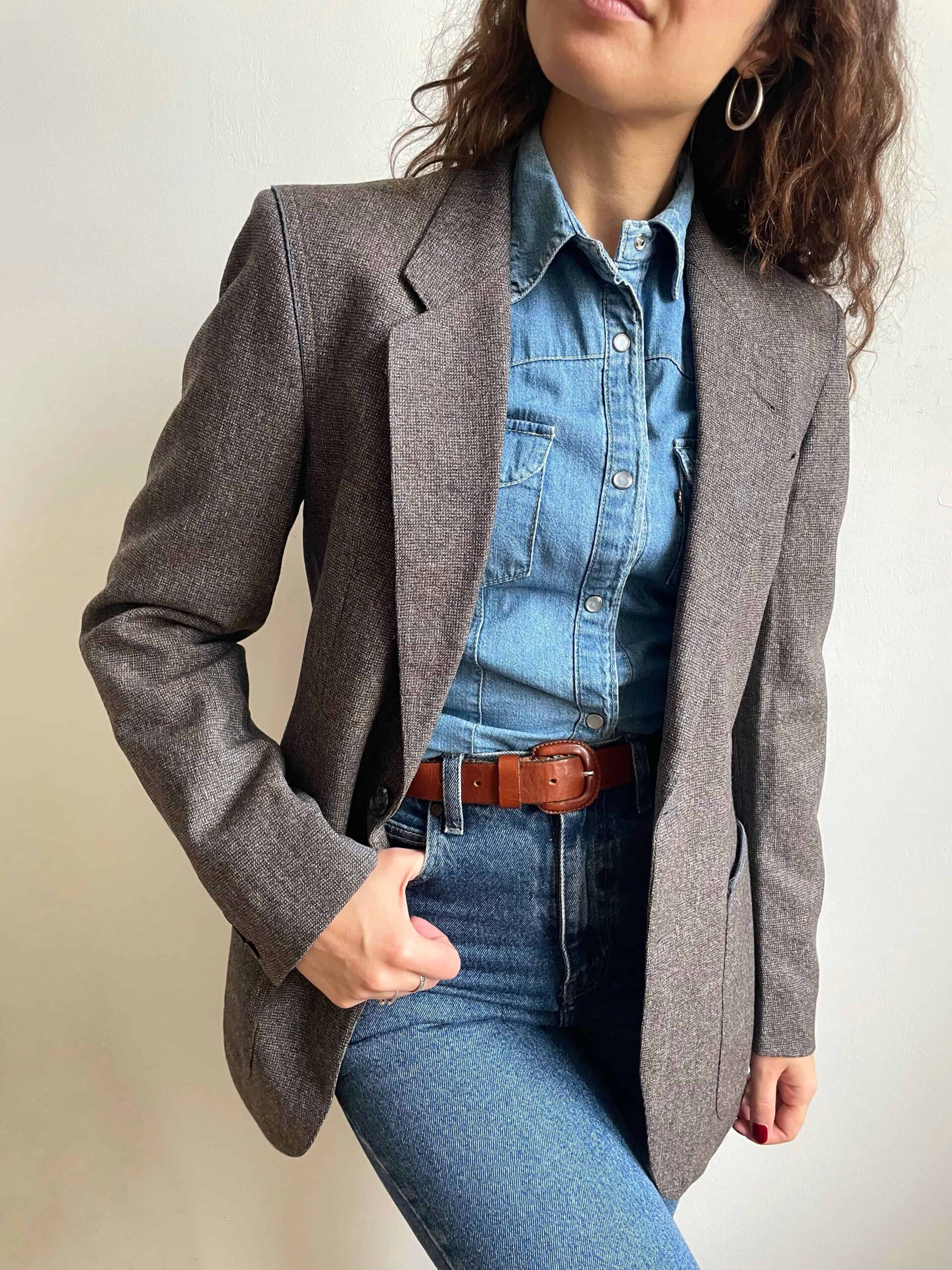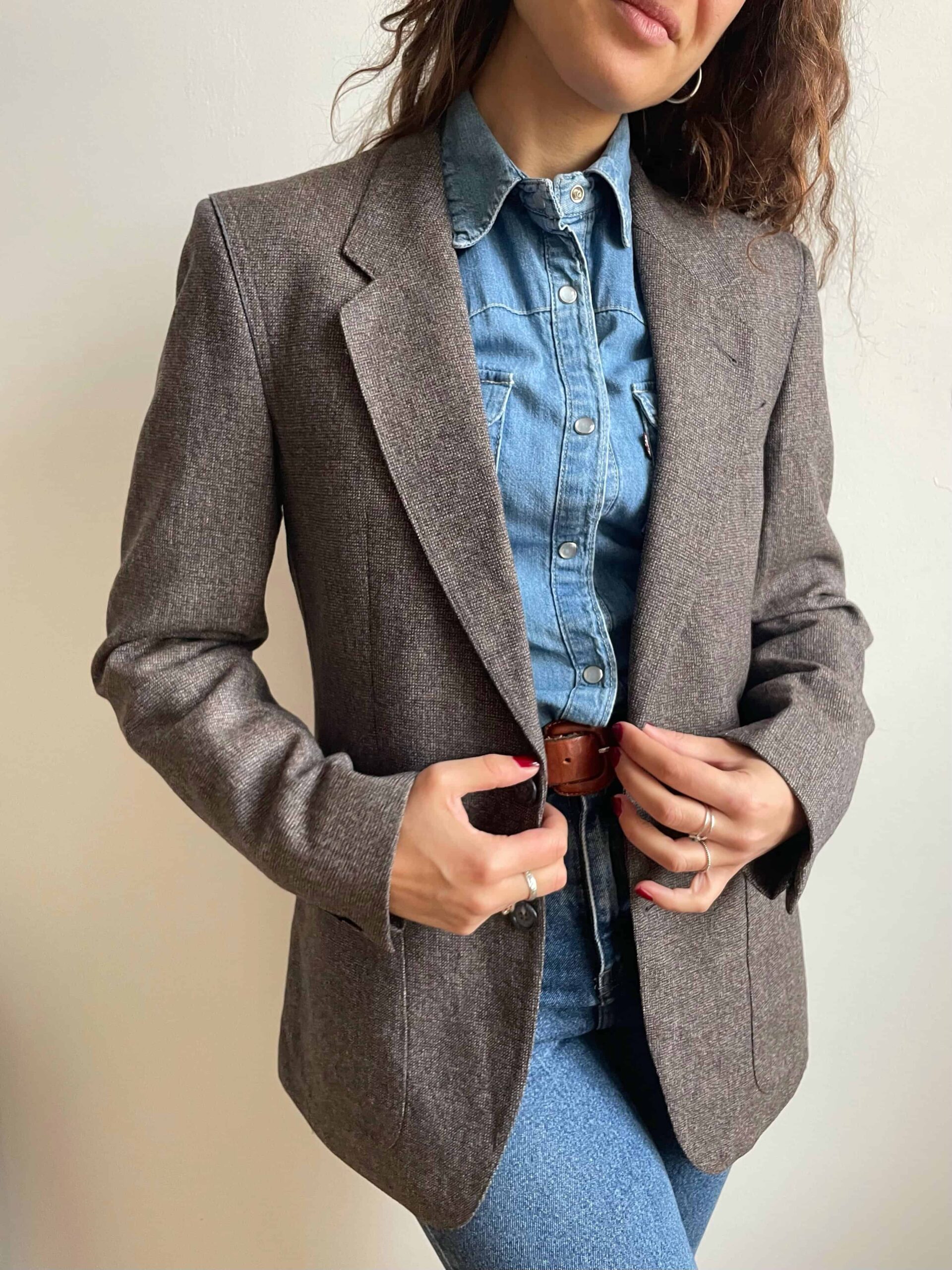 Blazer vintage 100% lana grigio e profili celesti