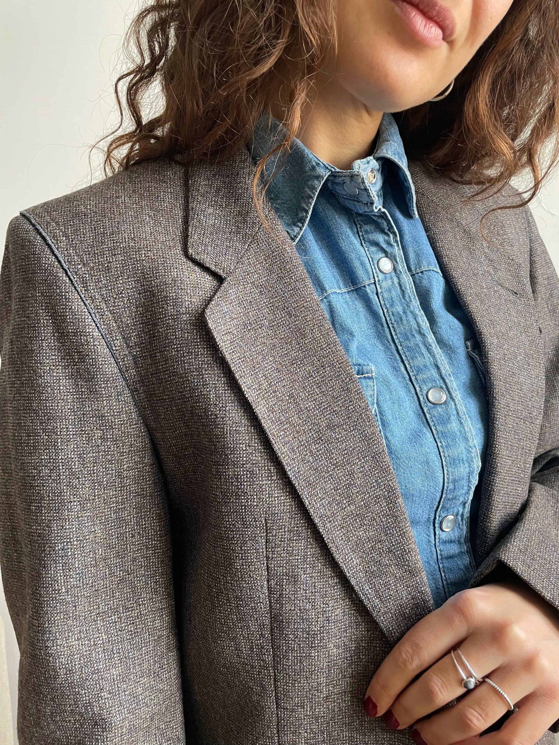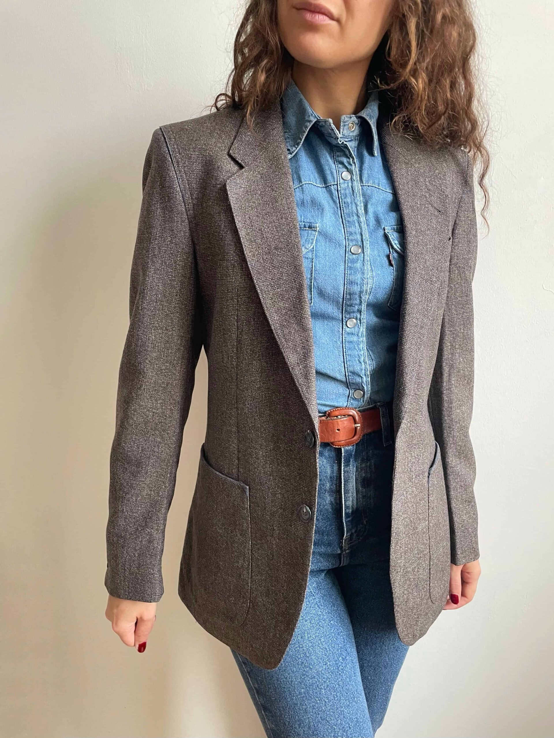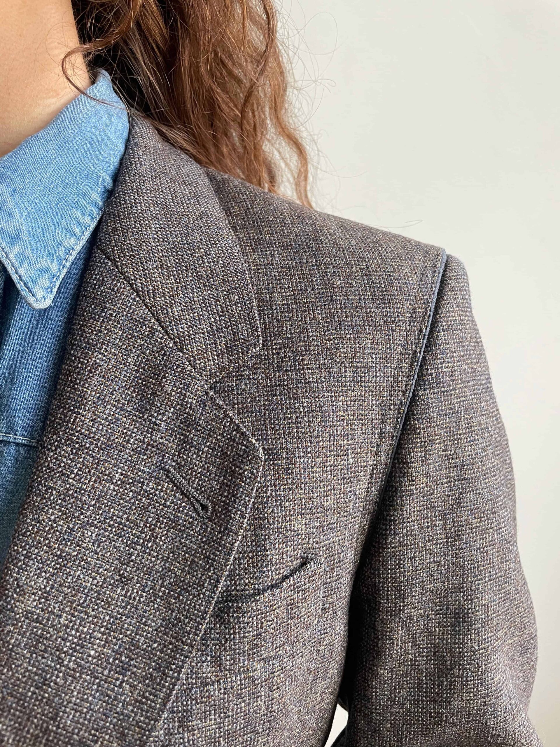 Blazer vintage in pregiata composizione 100% lana. Tessuto a piccolissimi quadratini sui toni del grigio e celeste (in ultima foto vedete bene il tessuto). Il blazer è originario da uomo, ma ha una bellissima vestibilità da donna. È rifinito molto bene con profili ricamati celesti, sui bordi delle tasche e sulle spalle. Fodera interna celeste. Tre bottoncini su ogni polsino. Taglia indicativa 42 abbondante, tenuto aperto veste anche una 44. Fate riferimento alle misure confortandole con quelle di un vostro blazer (misure prese sul blazer chiuso/abbottonato):