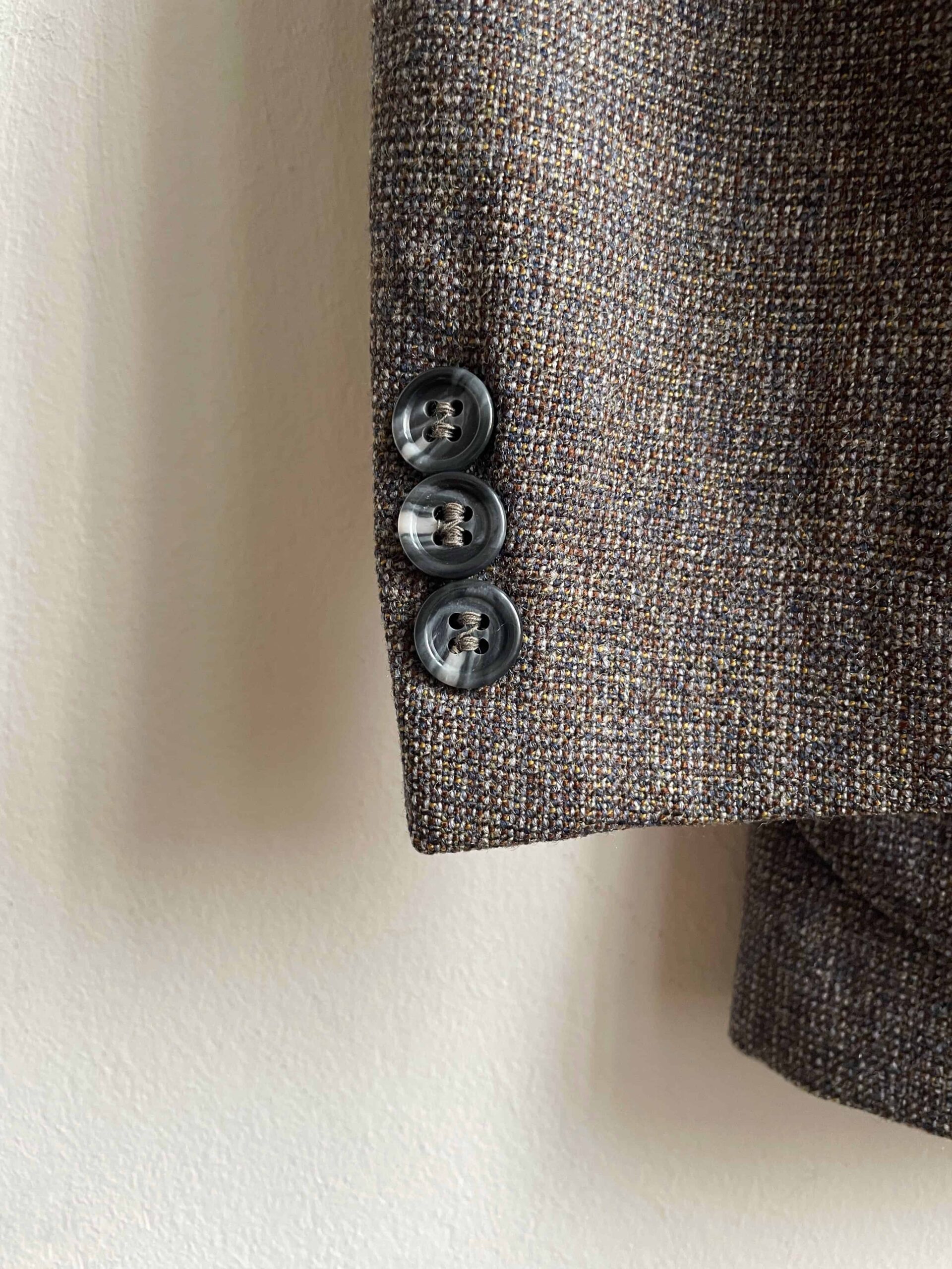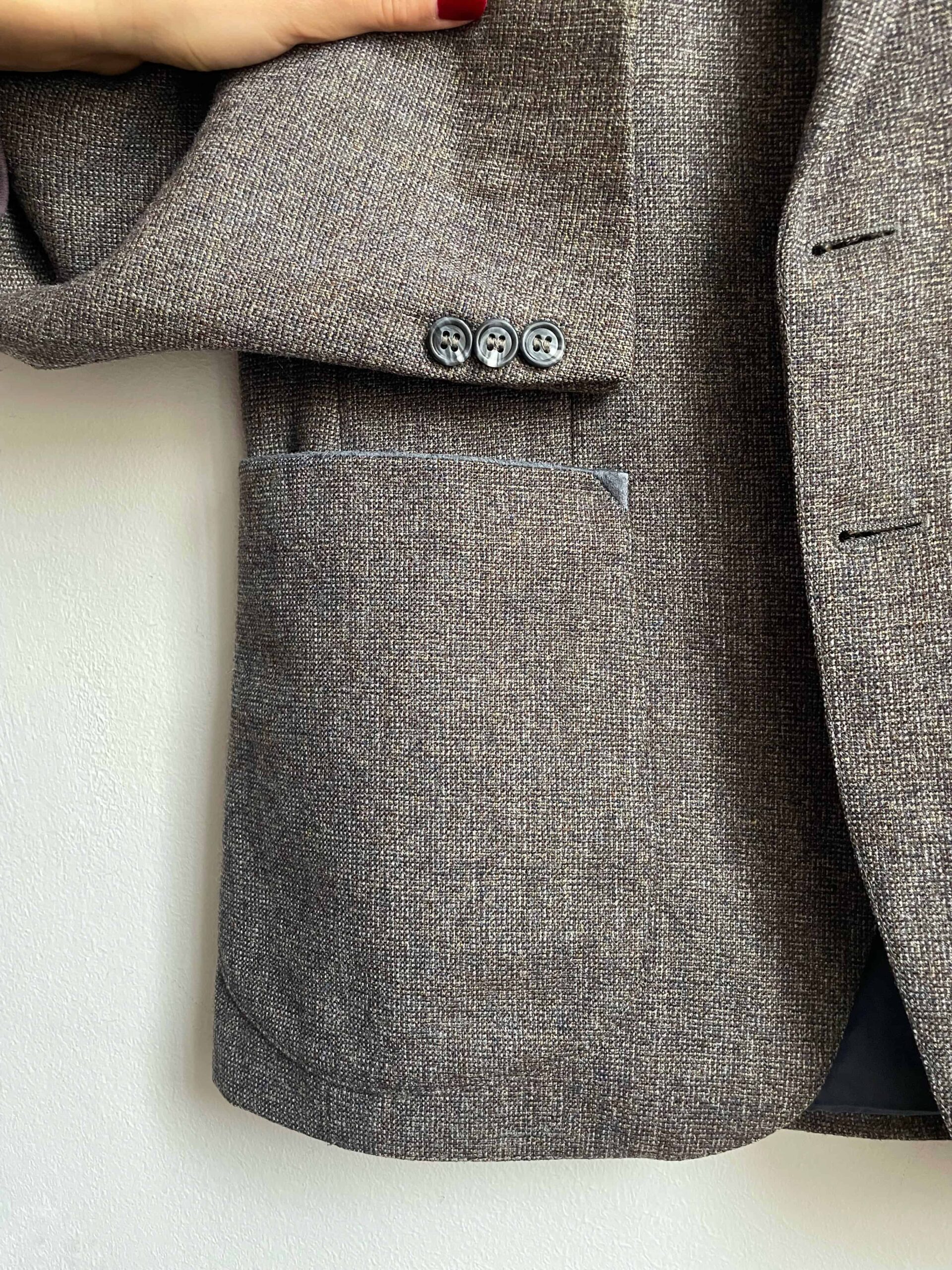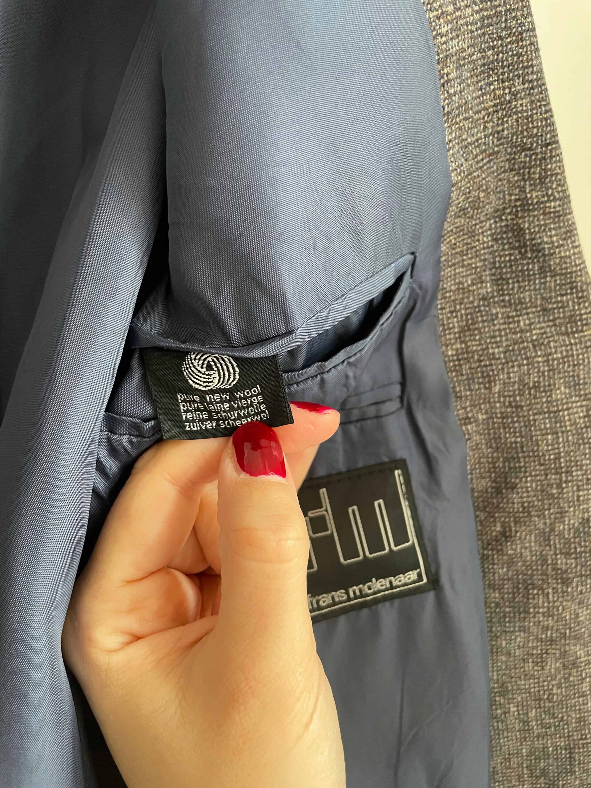 Blazer vintage in pregiata composizione 100% lana. Tessuto a piccolissimi quadratini sui toni del grigio e celeste (in ultima foto vedete bene il tessuto). Il blazer è originario da uomo, ma ha una bellissima vestibilità da donna. È rifinito molto bene con profili ricamati celesti, sui bordi delle tasche e sulle spalle. Fodera interna celeste. Tre bottoncini su ogni polsino. Taglia indicativa 42 abbondante, tenuto aperto veste anche una 44. Fate riferimento alle misure confortandole con quelle di un vostro blazer (misure prese sul blazer chiuso/abbottonato):