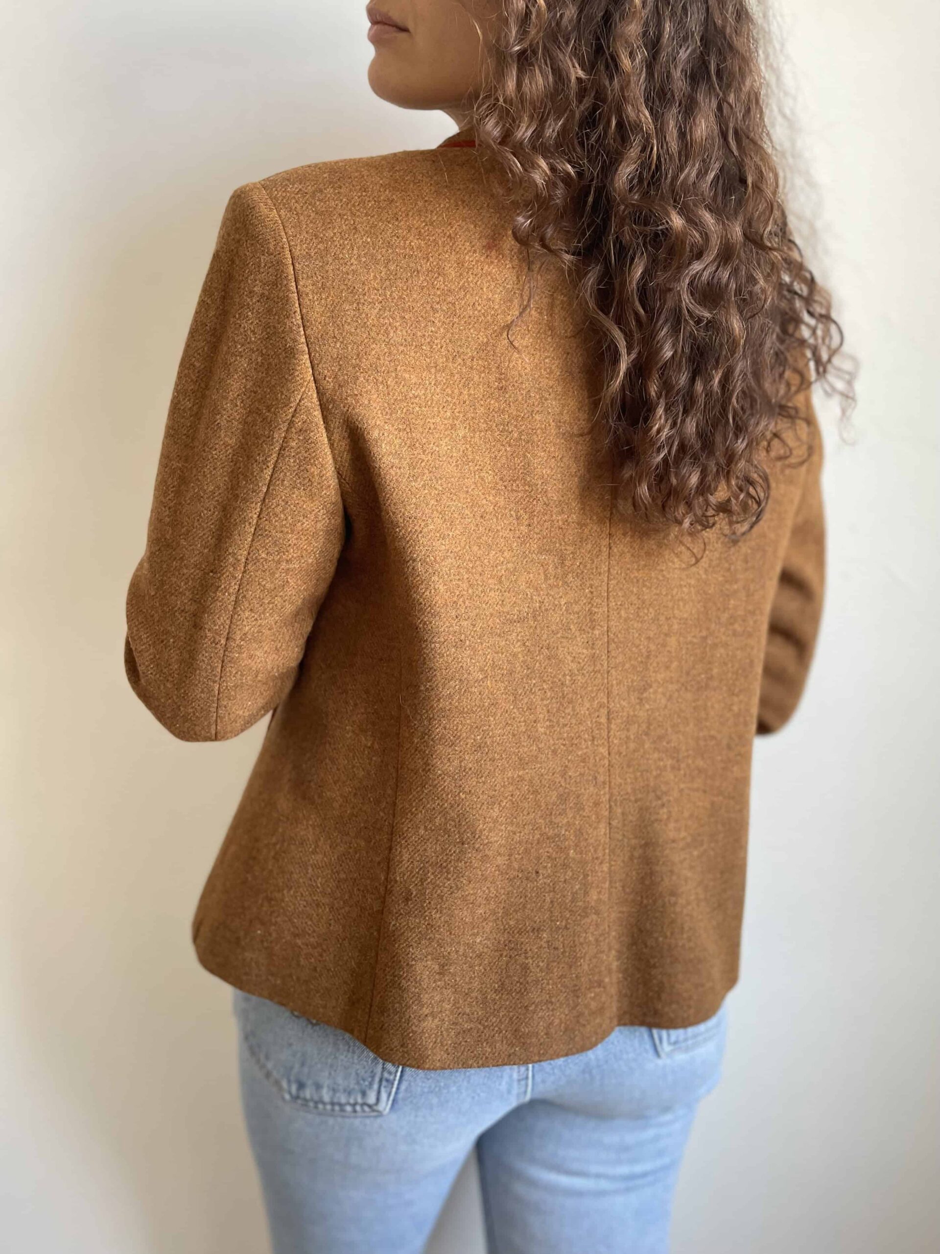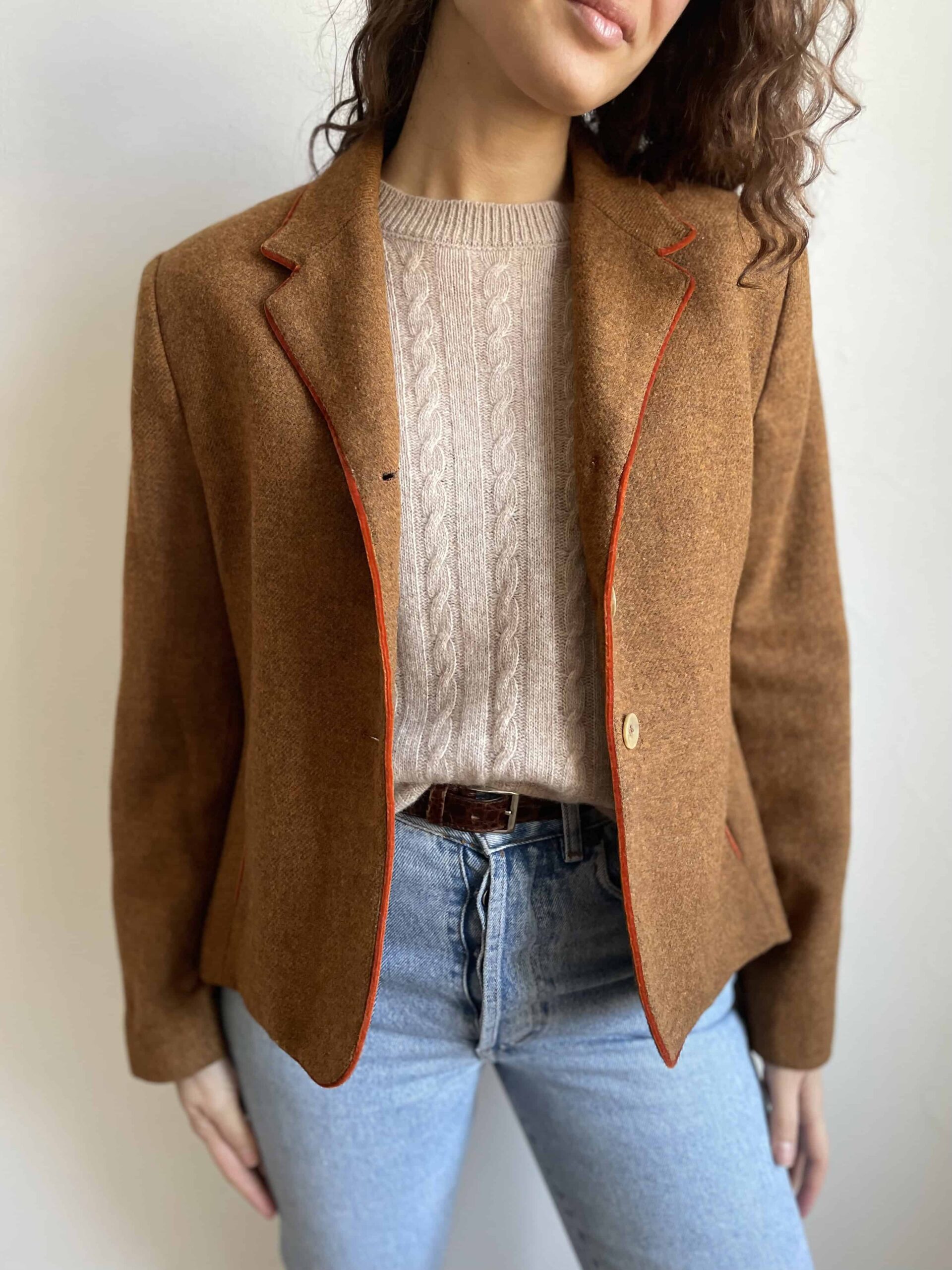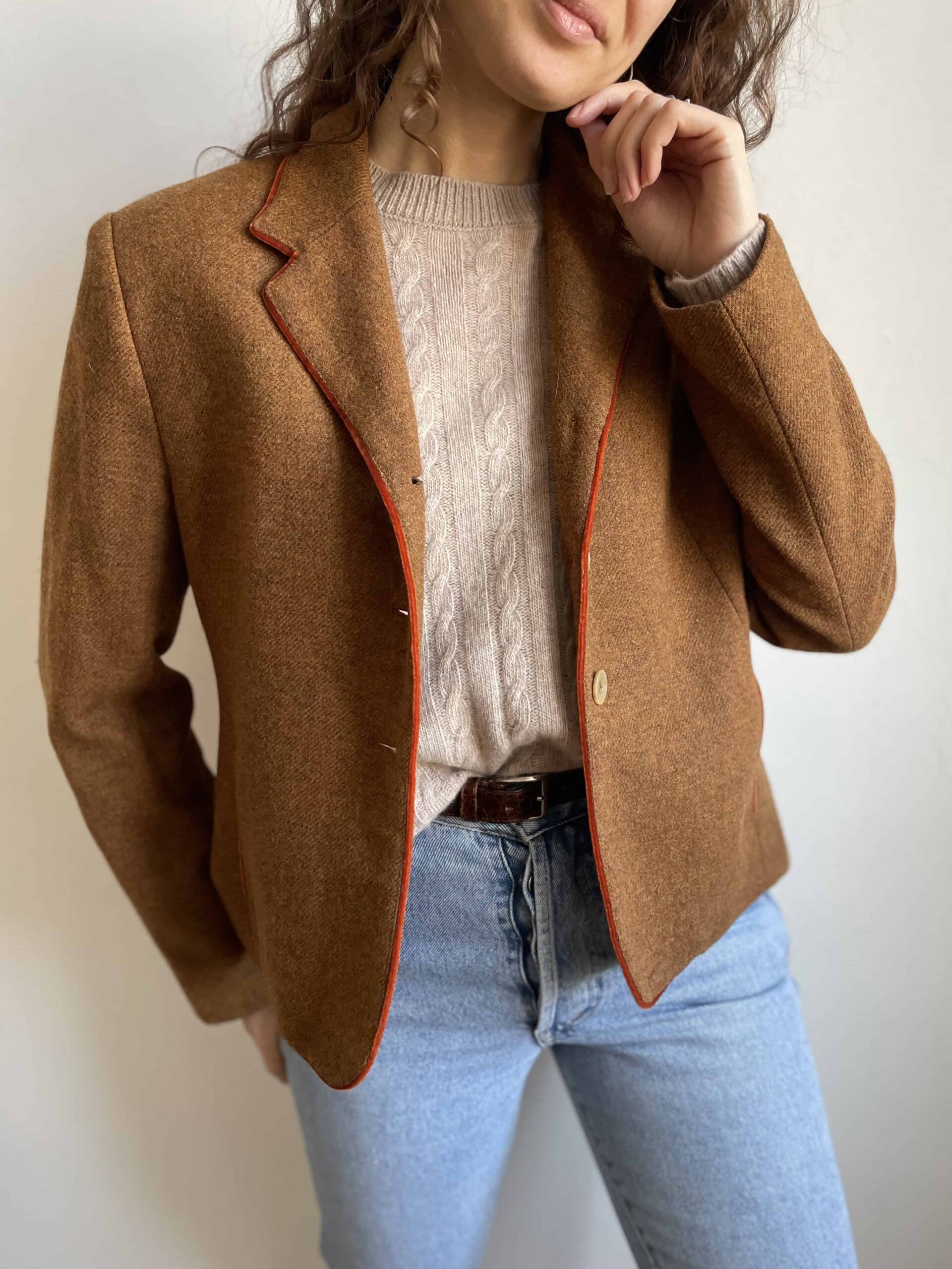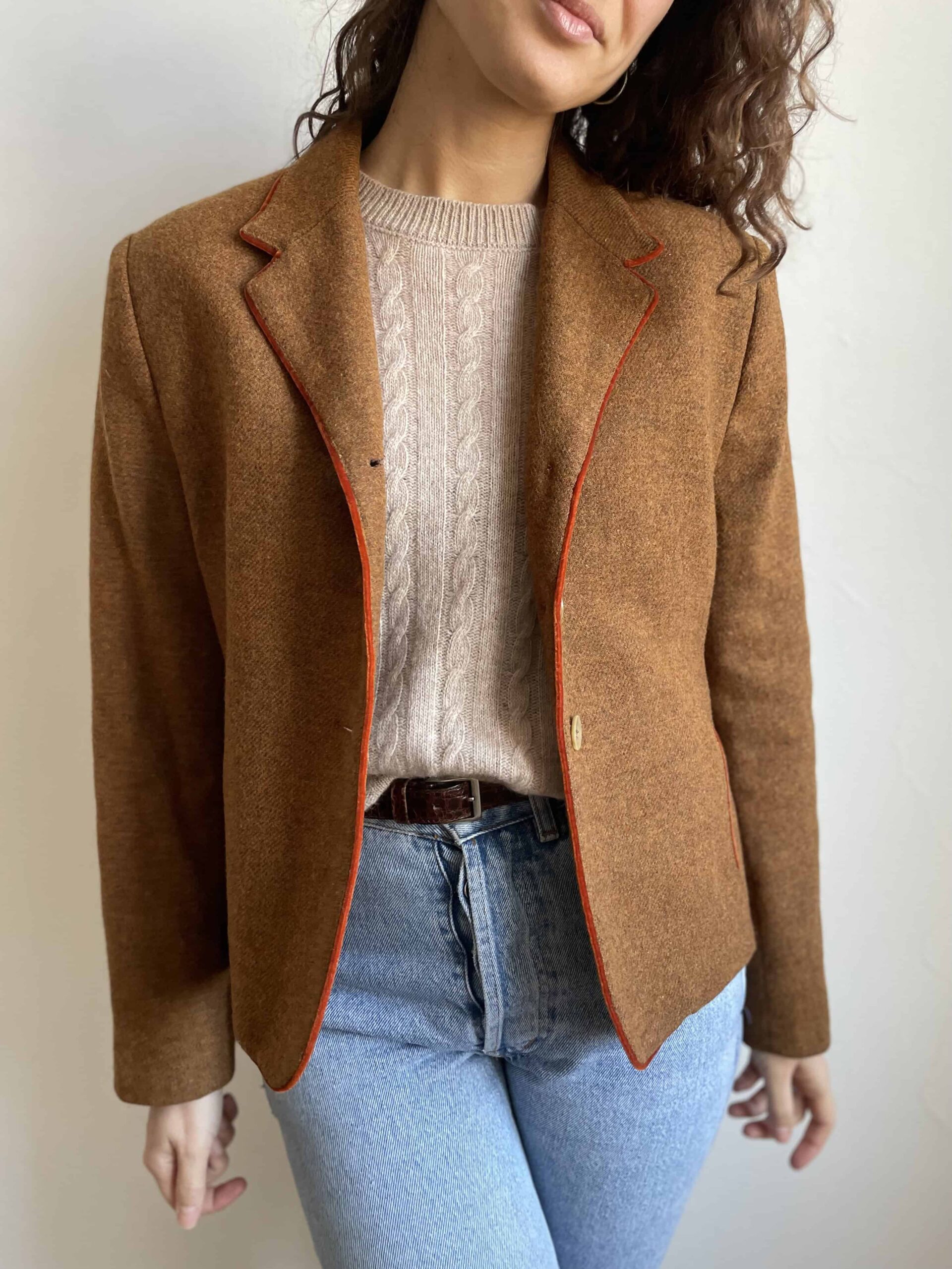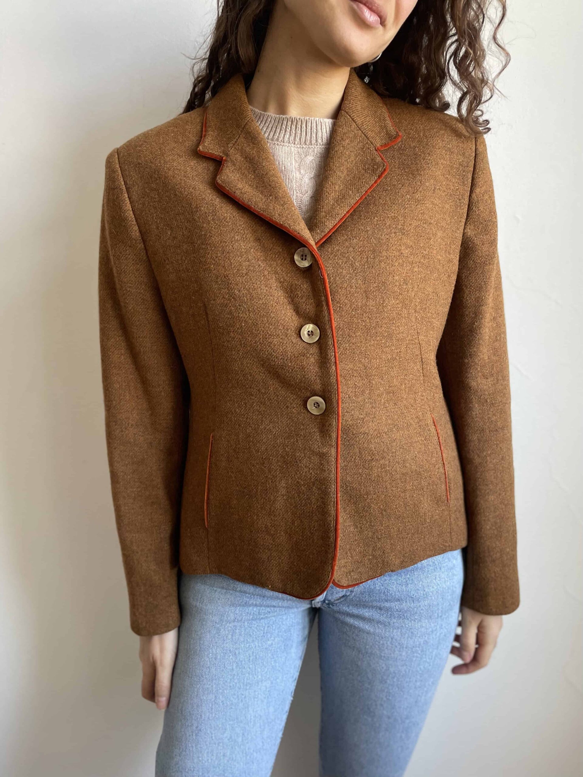 Blazer vintage 100% lana marrone melange e orli in velluto arancio