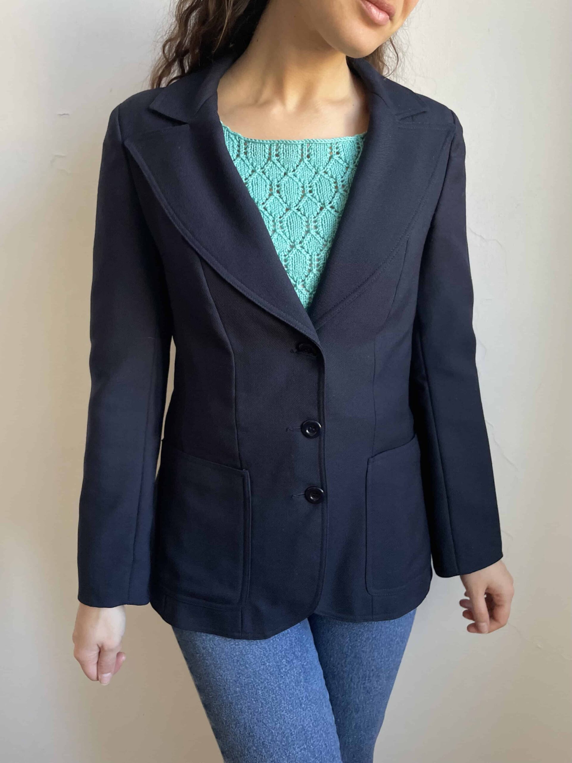 Blazer vintage di alta qualità in pregiata composizione 100% lana blu scuro pettinata e in rara taglia piccola. Il blazer ha davvero una vestibilità perfetta, sfiancato in vita, con grande colletto e tre bottoni su ogni polsino. Spalline non imbottite, non sono sporgenti e veste molto bene sulle spalle. Fit perfetto anche sul retro. Con fodera interna. Medio peso, adatto alla primavera. Perfetto anche per una laurea. Taglia indicativa 40. Fate riferimento alle misure confrontandole con quelle di una vostra giacca: