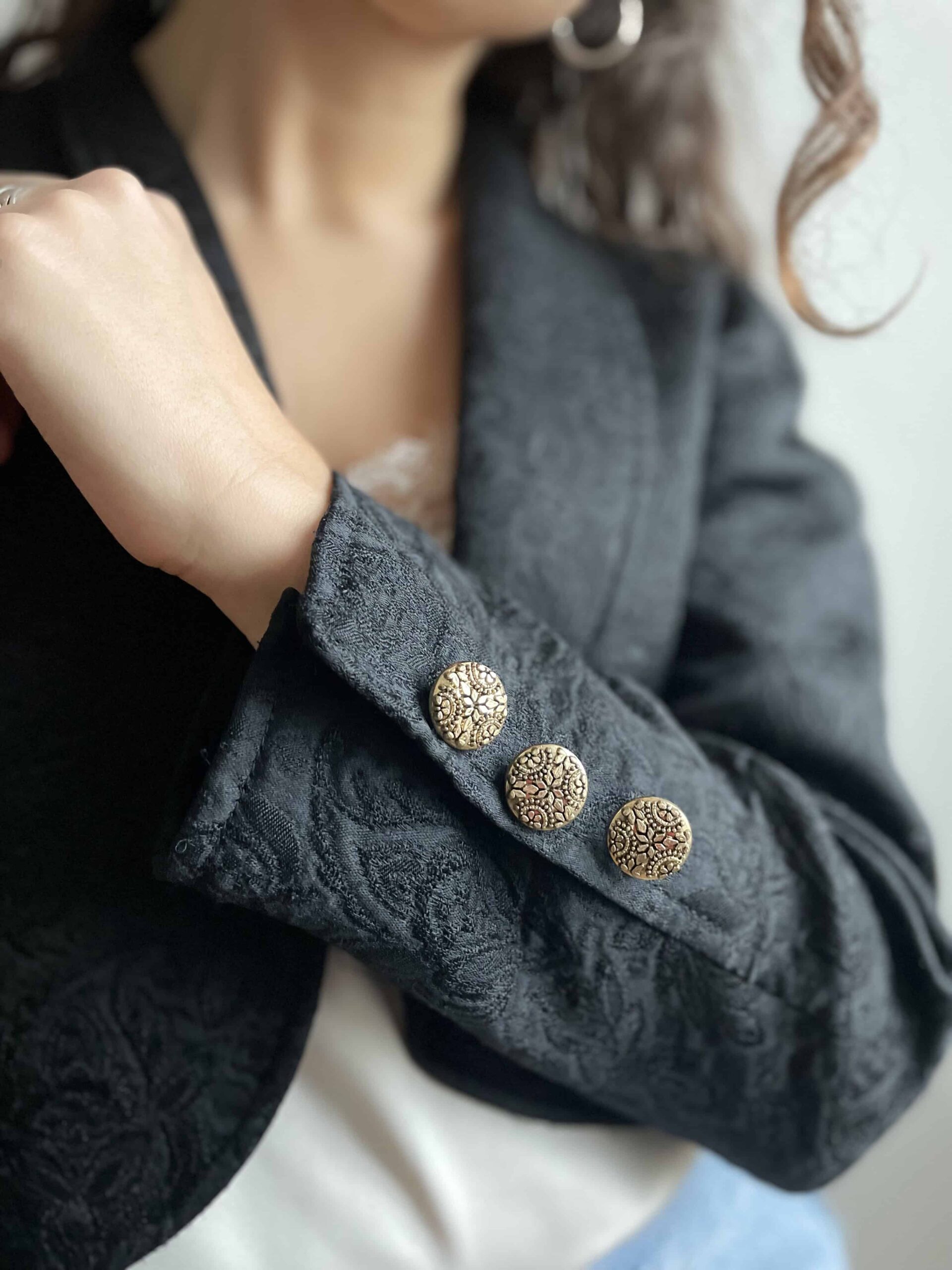 Giacca elegante vintage crop nera ricamata e bottoni oro