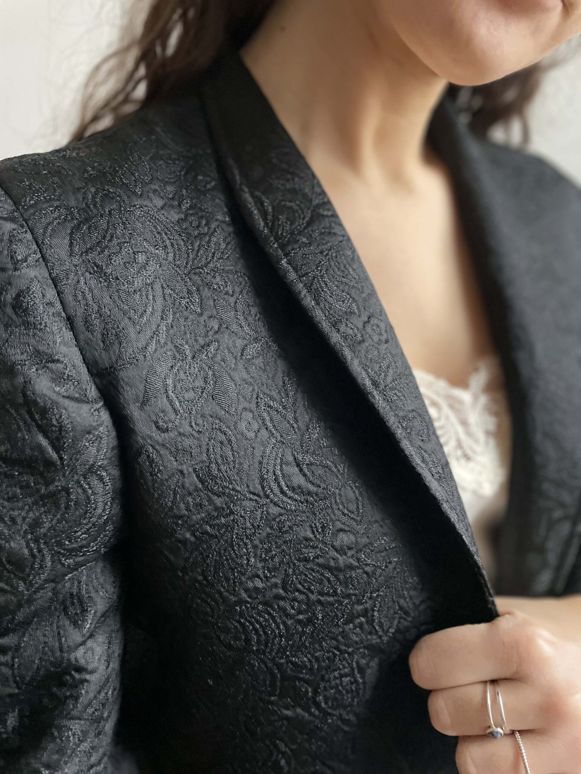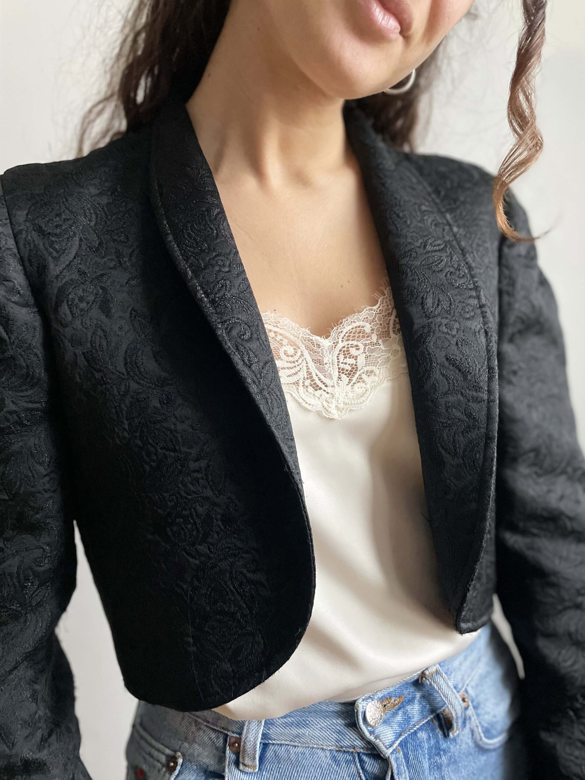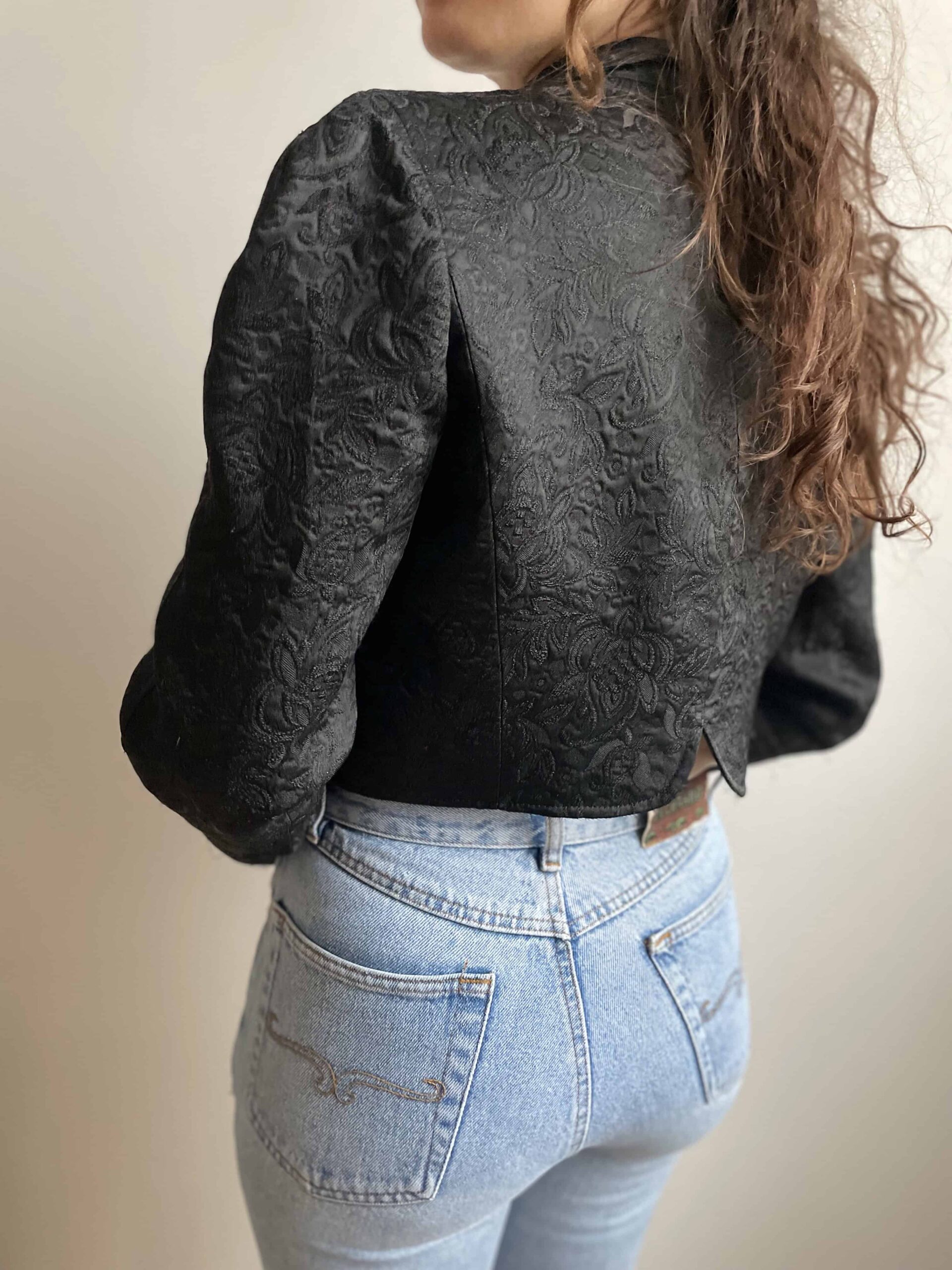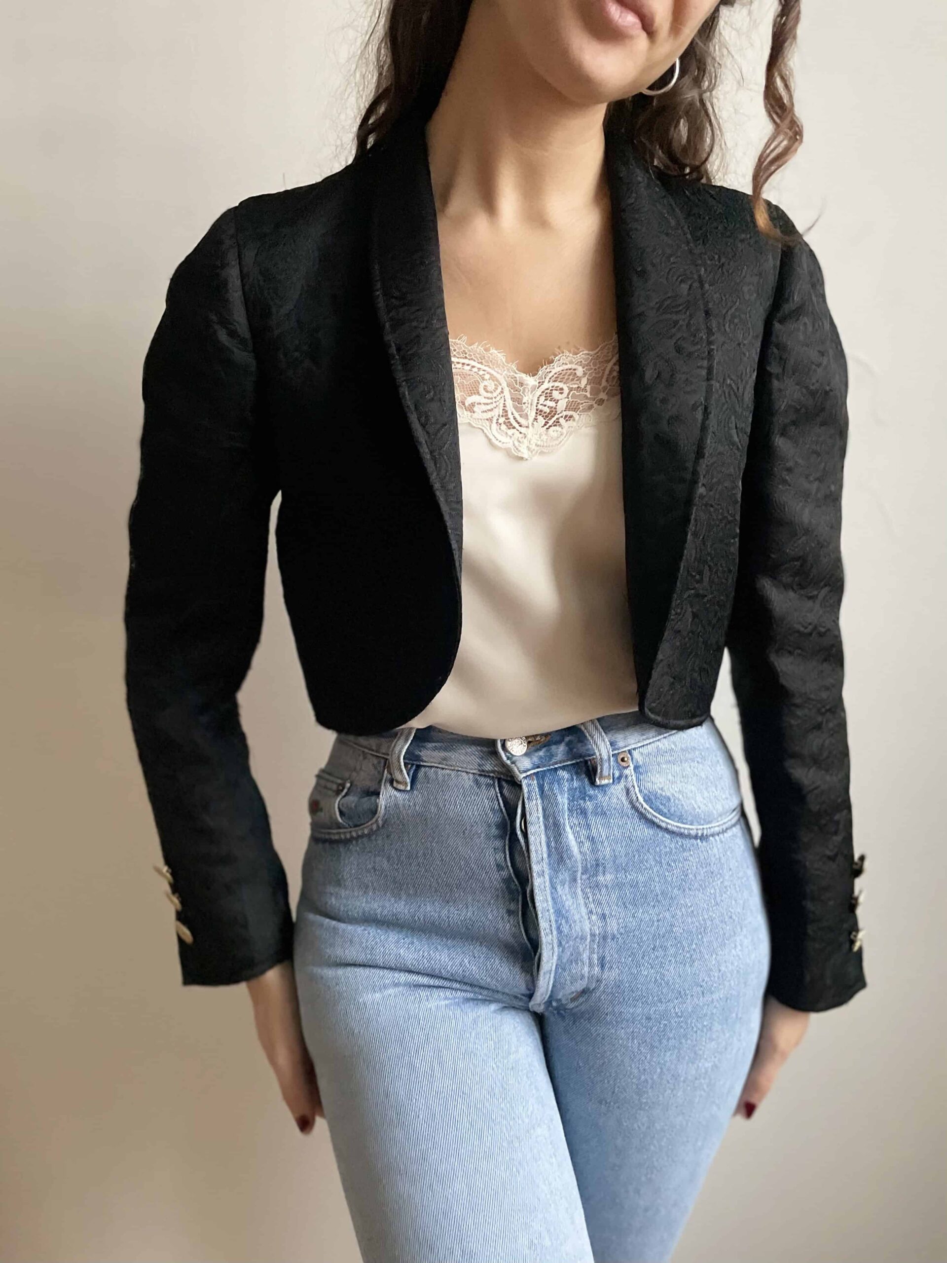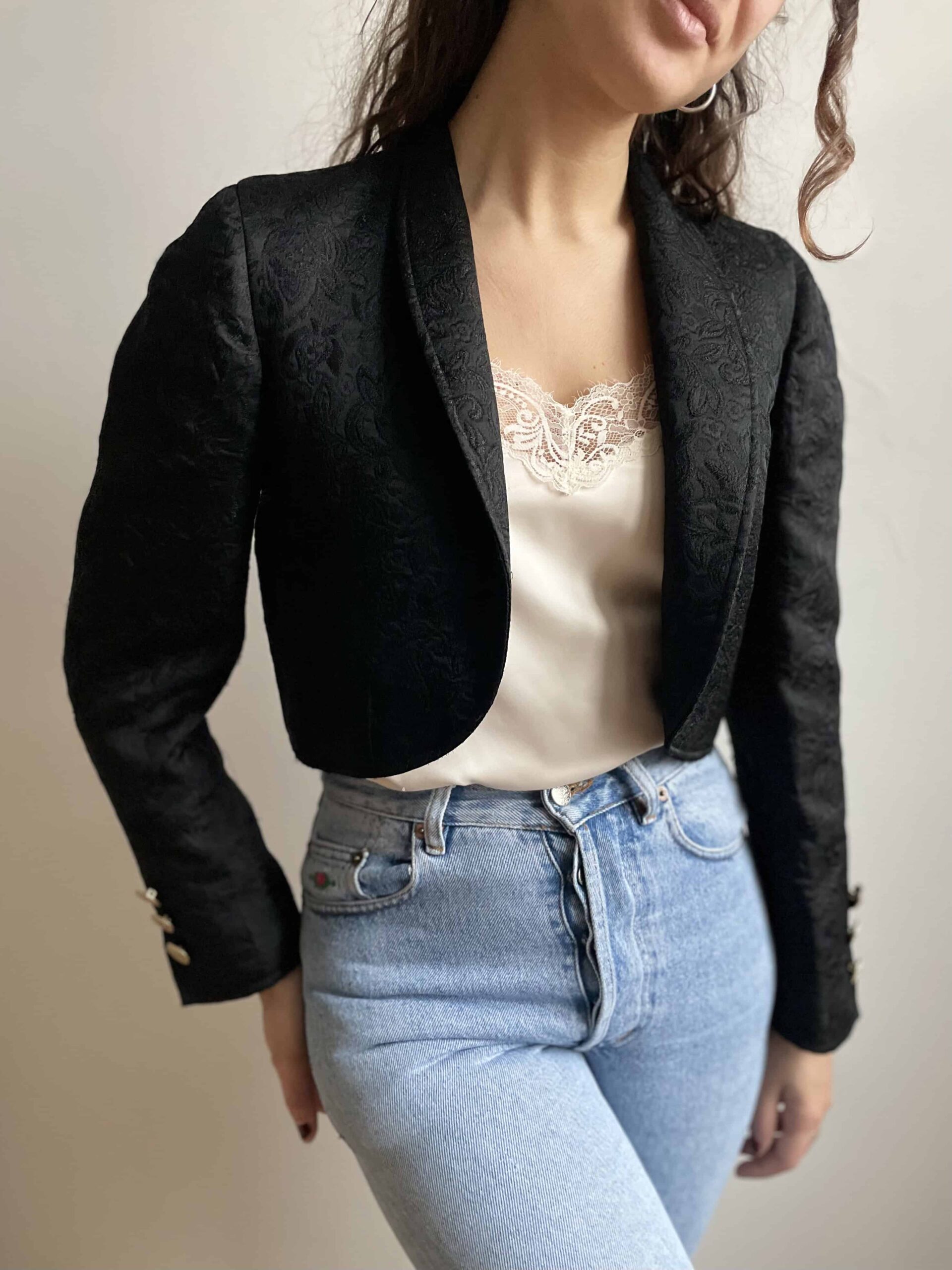 Splendida giacca vintage crop nera in tessuto spesso ricamato. La giacca ha davvero una bellissima fattura, non molto lunga invita, maniche leggermente a sbuffo e su ogni polsino ha tre bellissimi bottoni dorati. Piccolo spacchetto sul fondo della schiena. Bel colletto ampio, rimane aperta e non si chiude. In foto ve la mostro con dei jeans a vita alta, ma è perfetta da mettere sopra ad un abito. Taglia indicativa 40. Fate riferimento alle misure confrontandole con quelle di un vostro blazer: