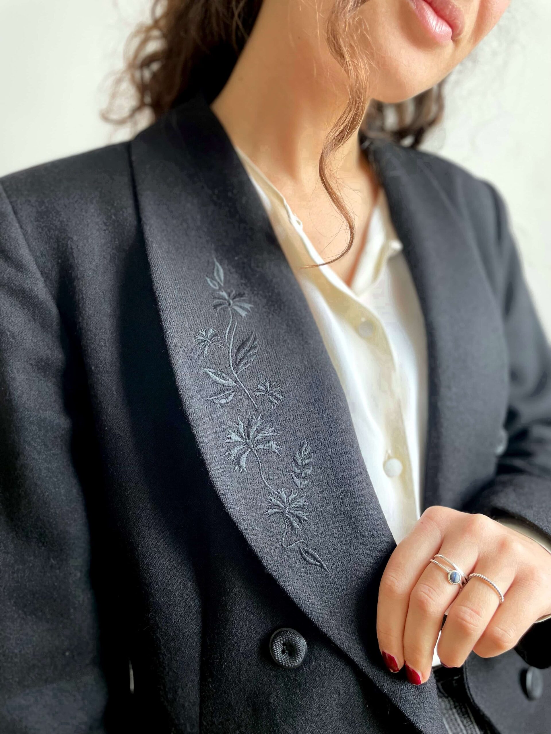 Giacca vintage doppiopetto 100% lana nera con colletto ricamato