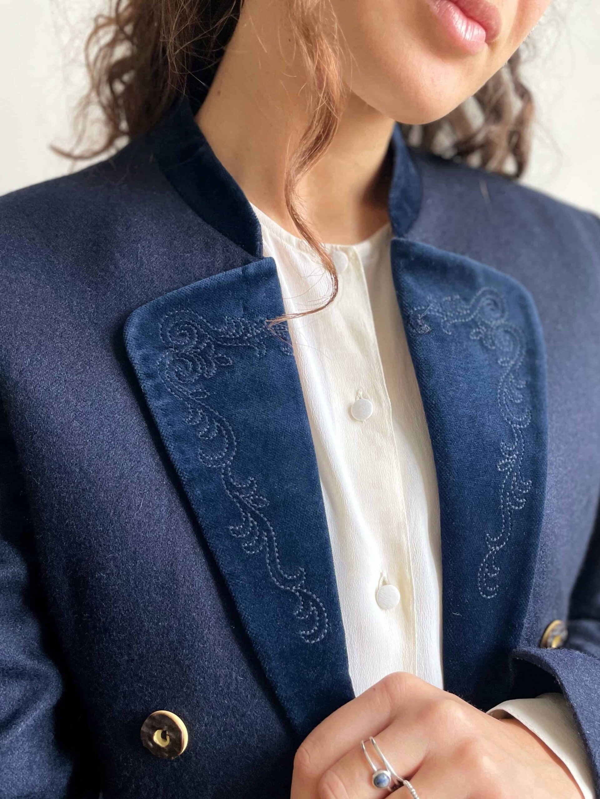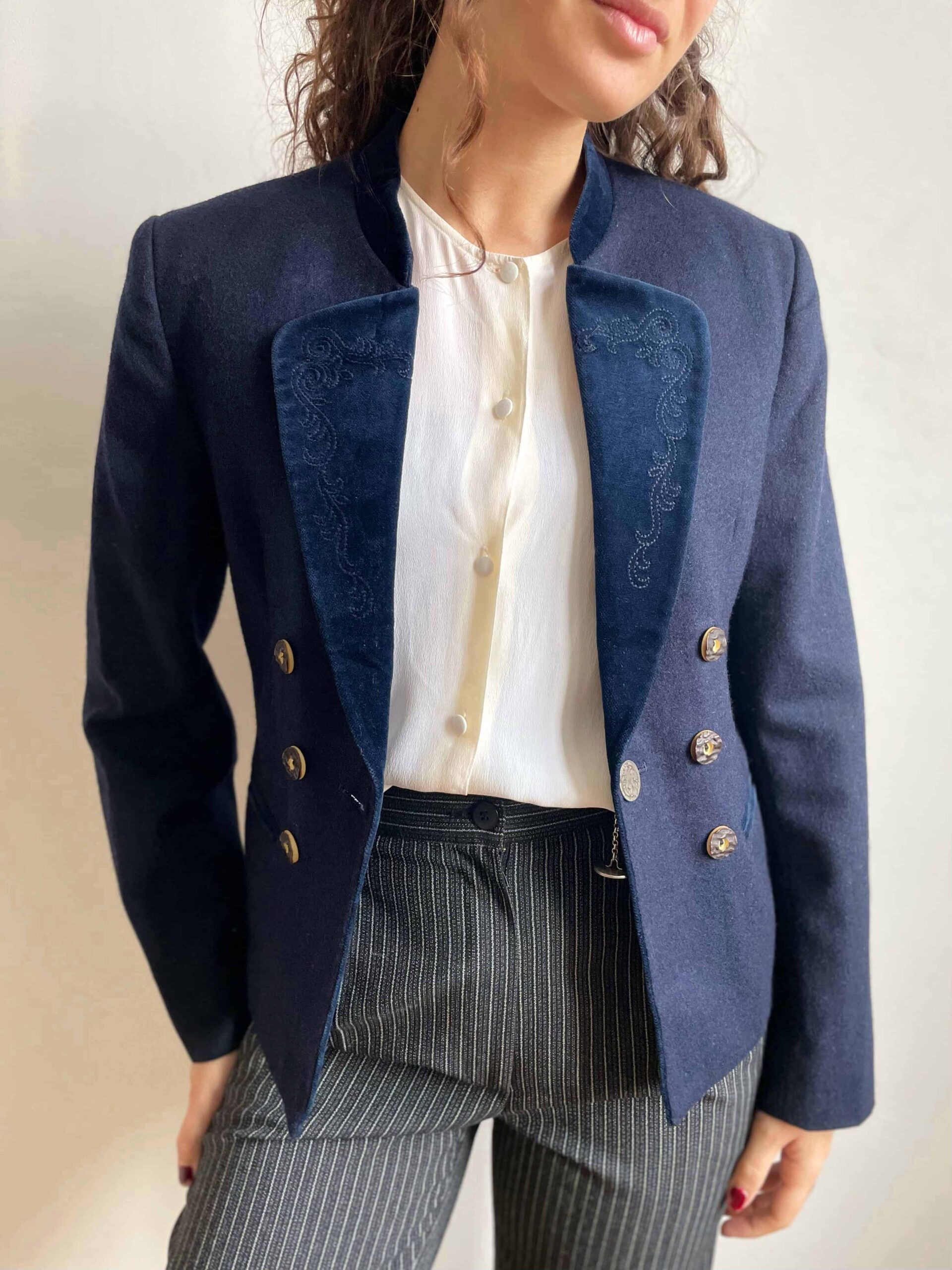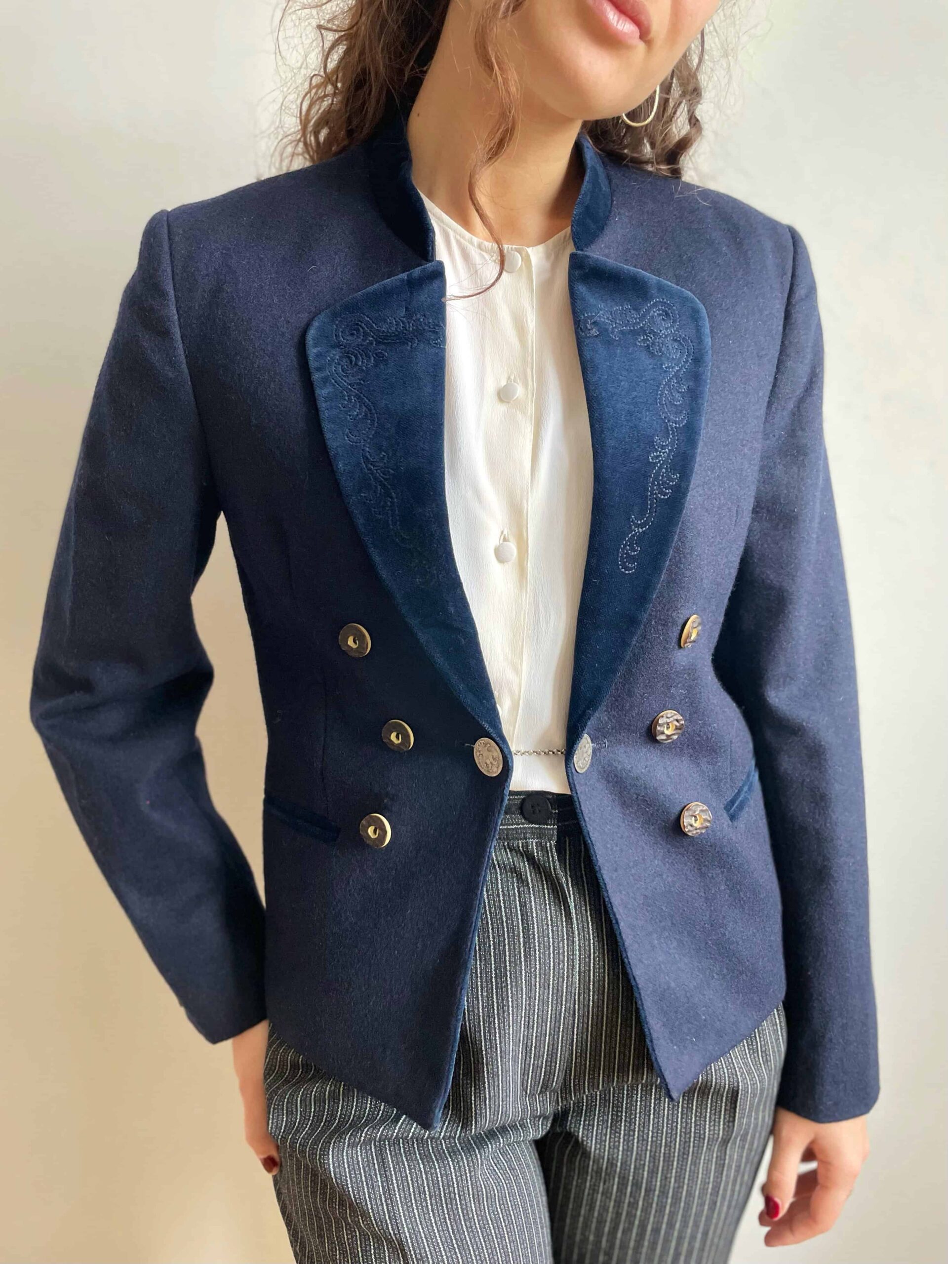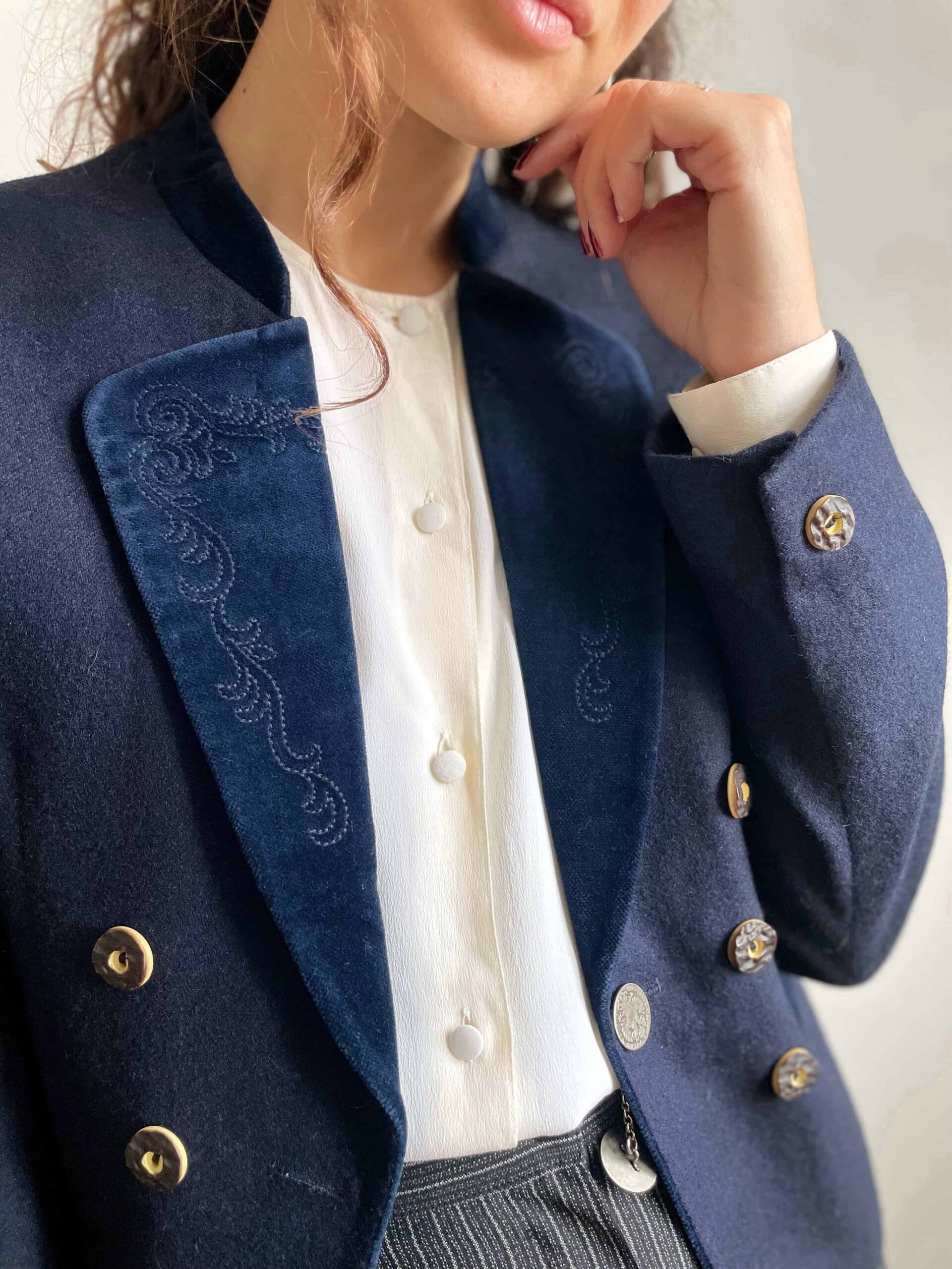 Rara giacca vintage originale austriaca color blu. Tessuto in 65% lana con bellissimo ampio colletto in velluto blu con ricami. Collo alla coreana in velluto. Tipici bottoni tirolesi anche sui polsini, mentre per chiuderla ci sono due bellissimi bottoni argentati collegati da una catenina. Taglia indicativa 40. Fate riferimento alle misure confrontandole con quelle di un vostro blazer: