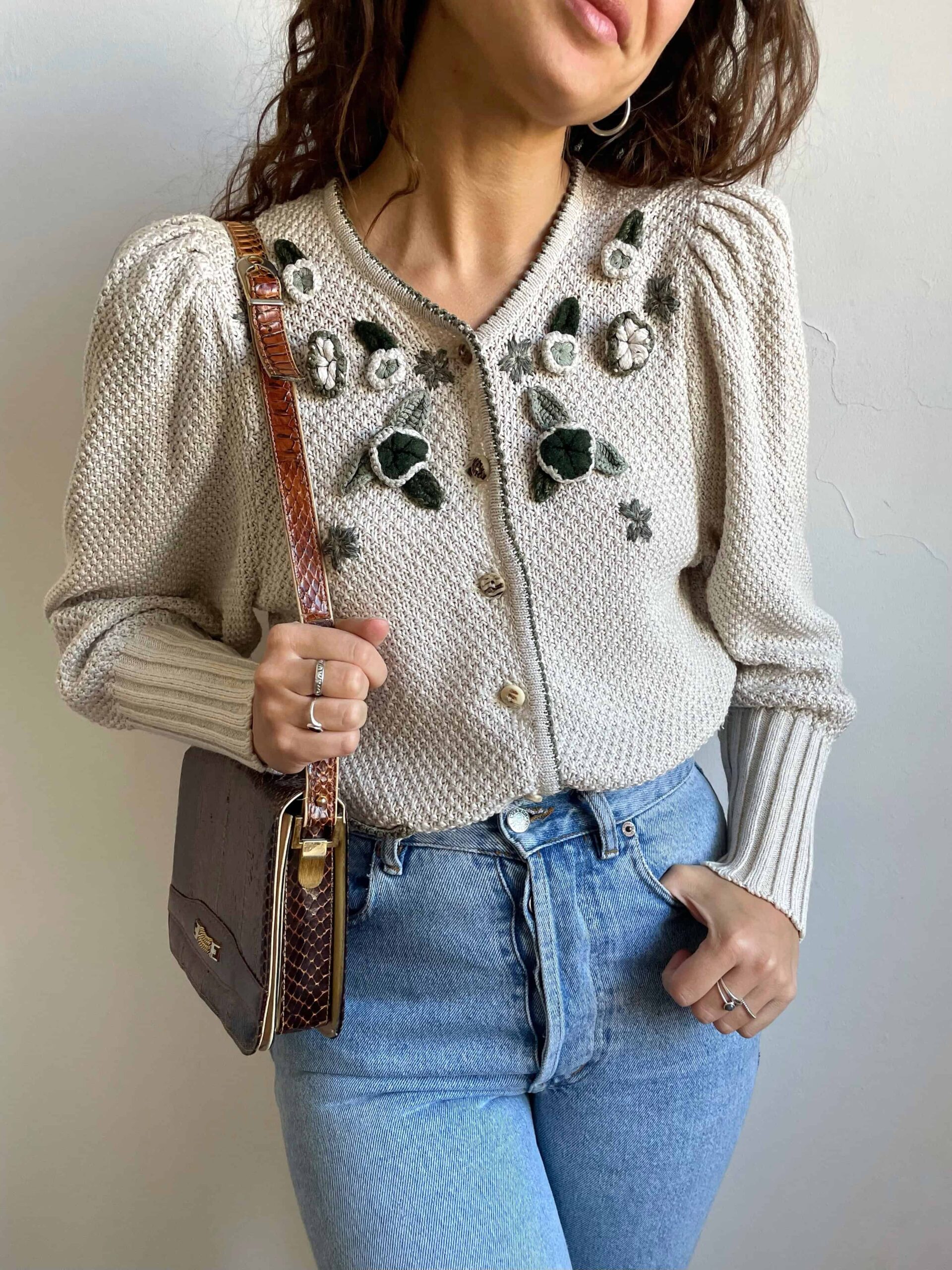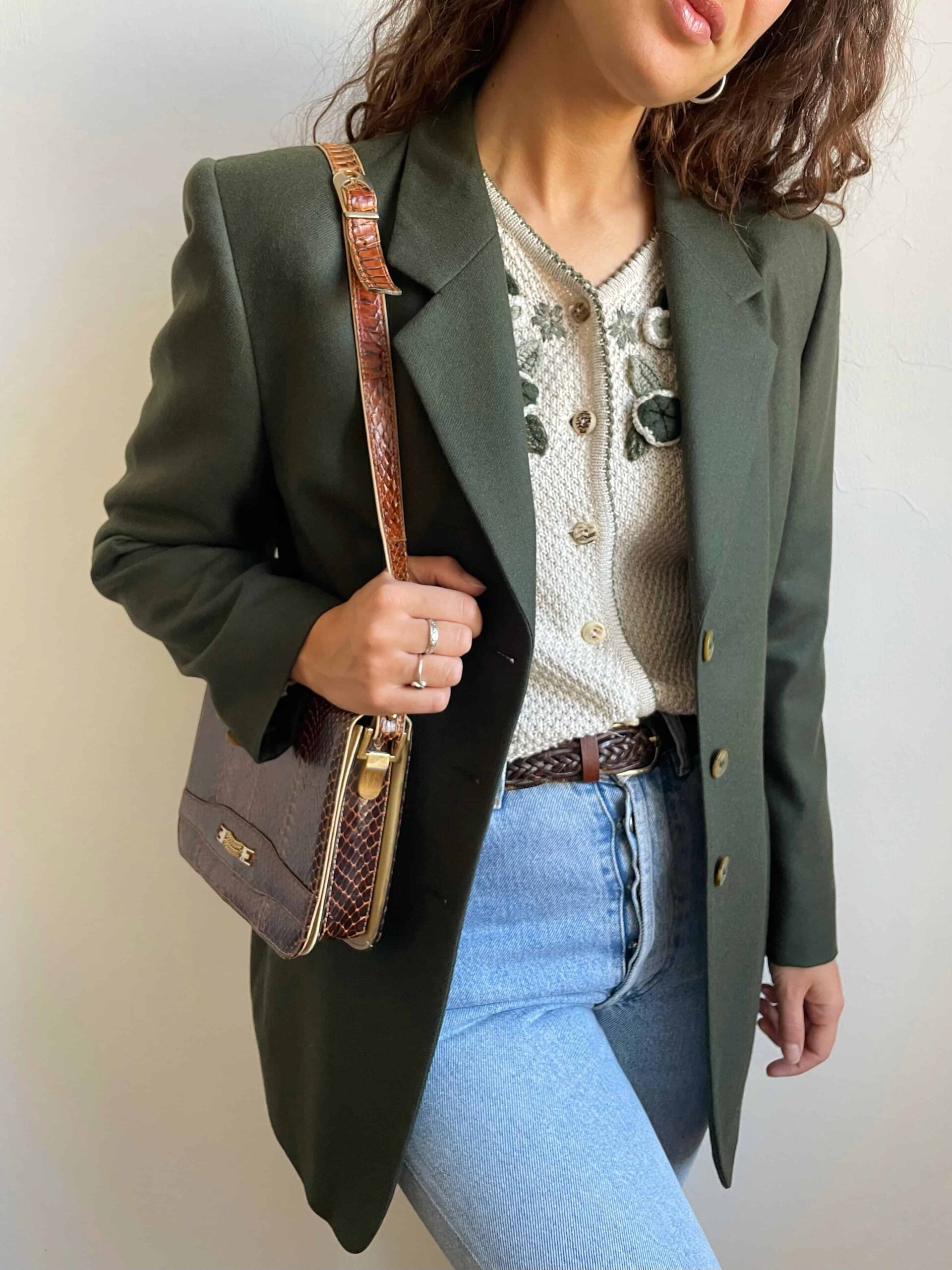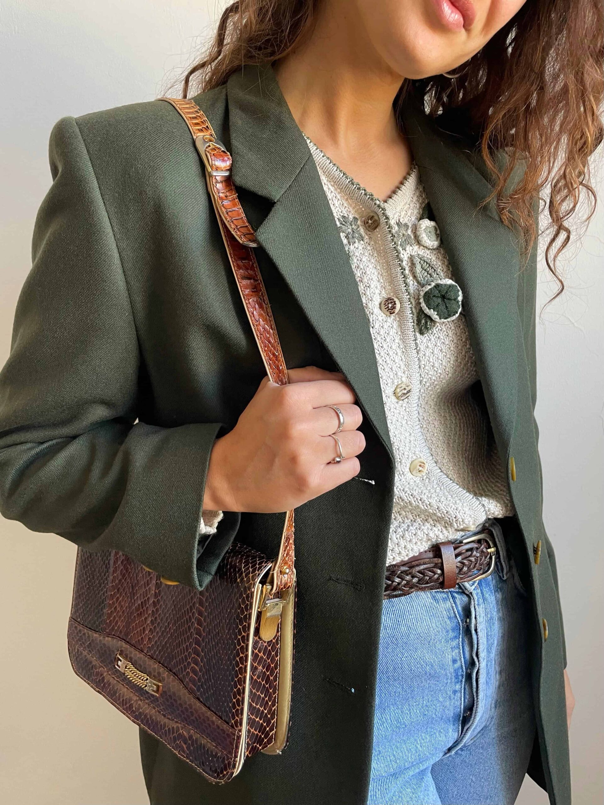 Buonissime condizioni vintage come da foto, segnalo che sulla tracolla in due punti la pelle di rettile è spezzata, ma ciò non ne compromette l’utilizzo perché la pelle beige sul retro della tracolla è intatta (vedi ultime due foto). In foto abbinata a dei capi capi che trovate in vendita sul sito