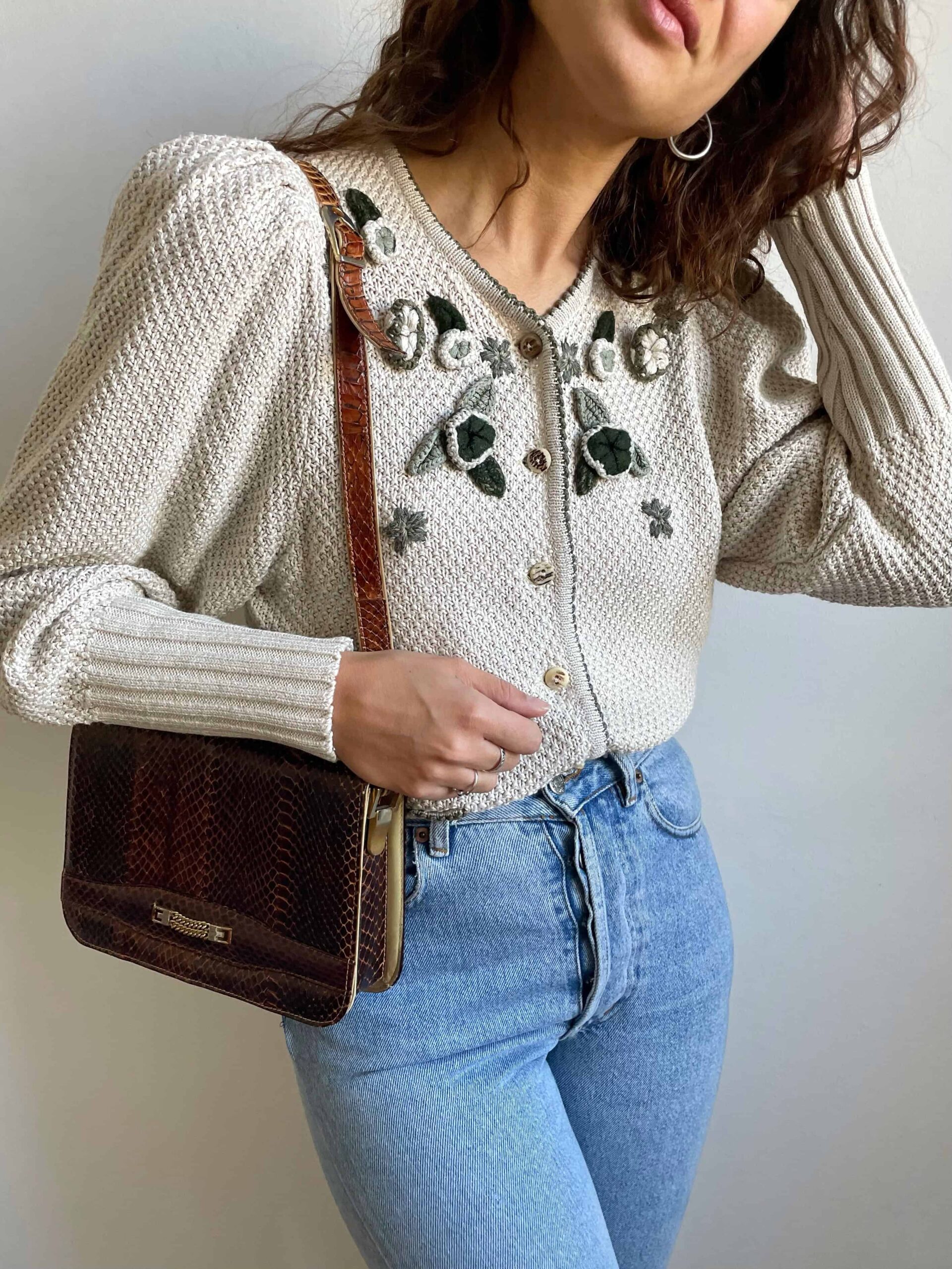 Borsetta vintage in vera pelle di rettile marrone e profili beige