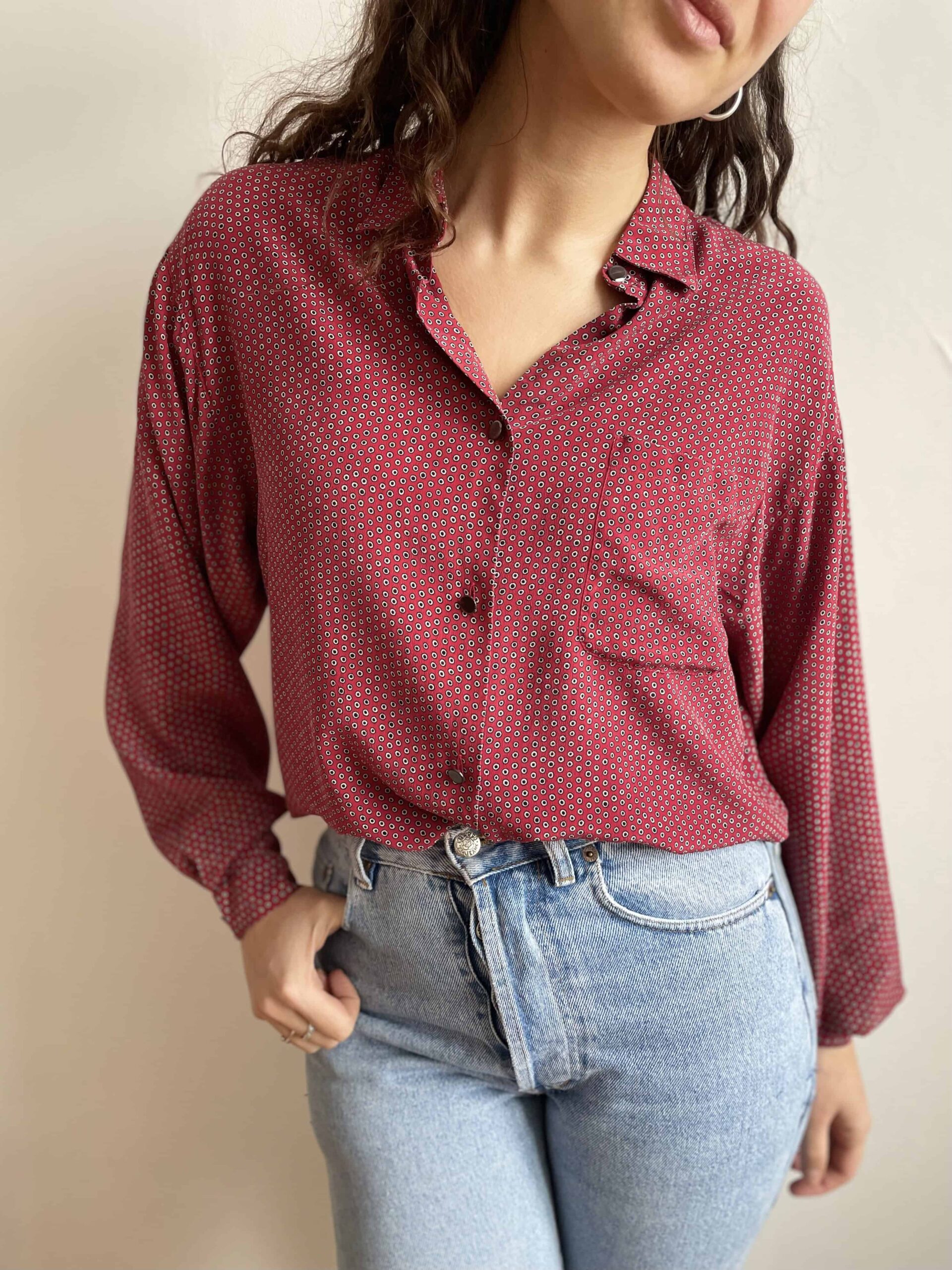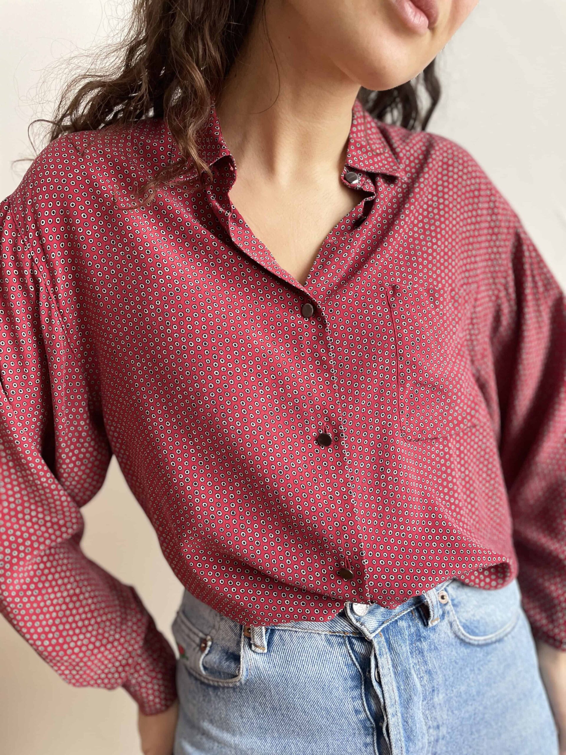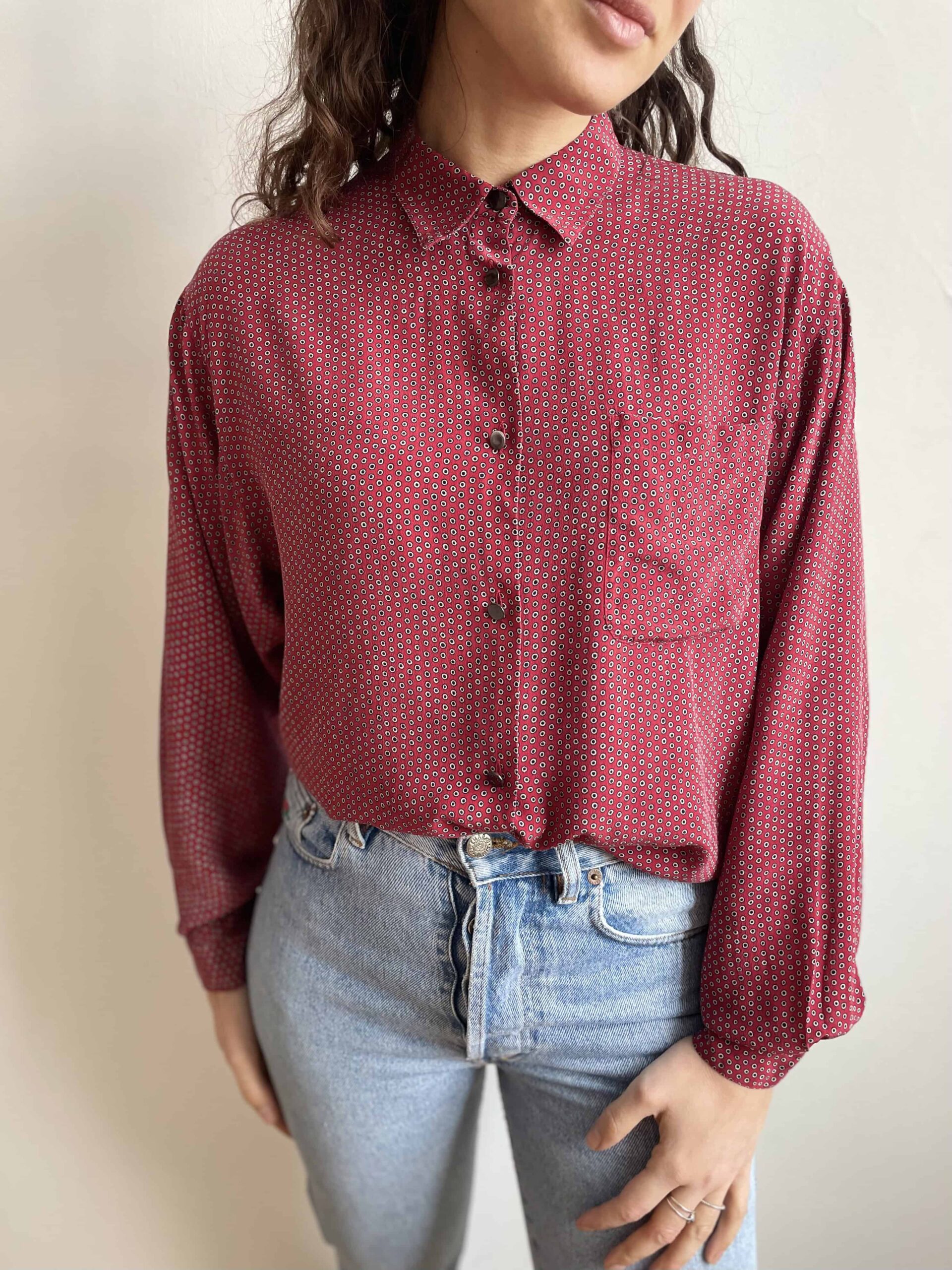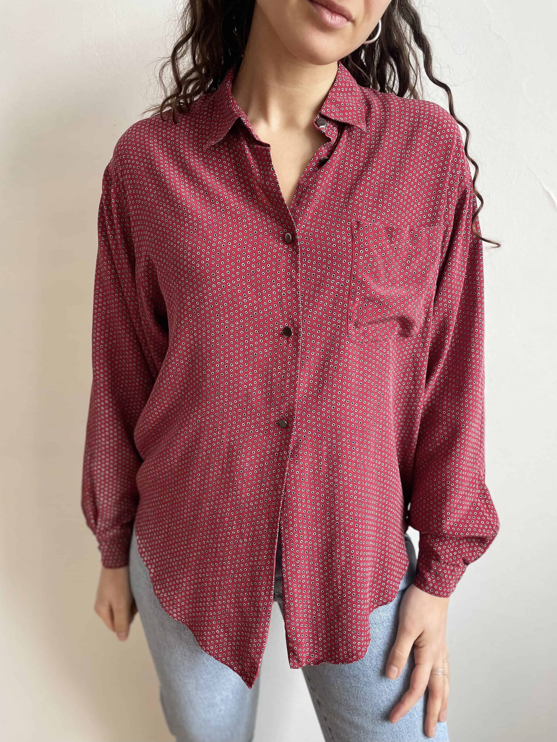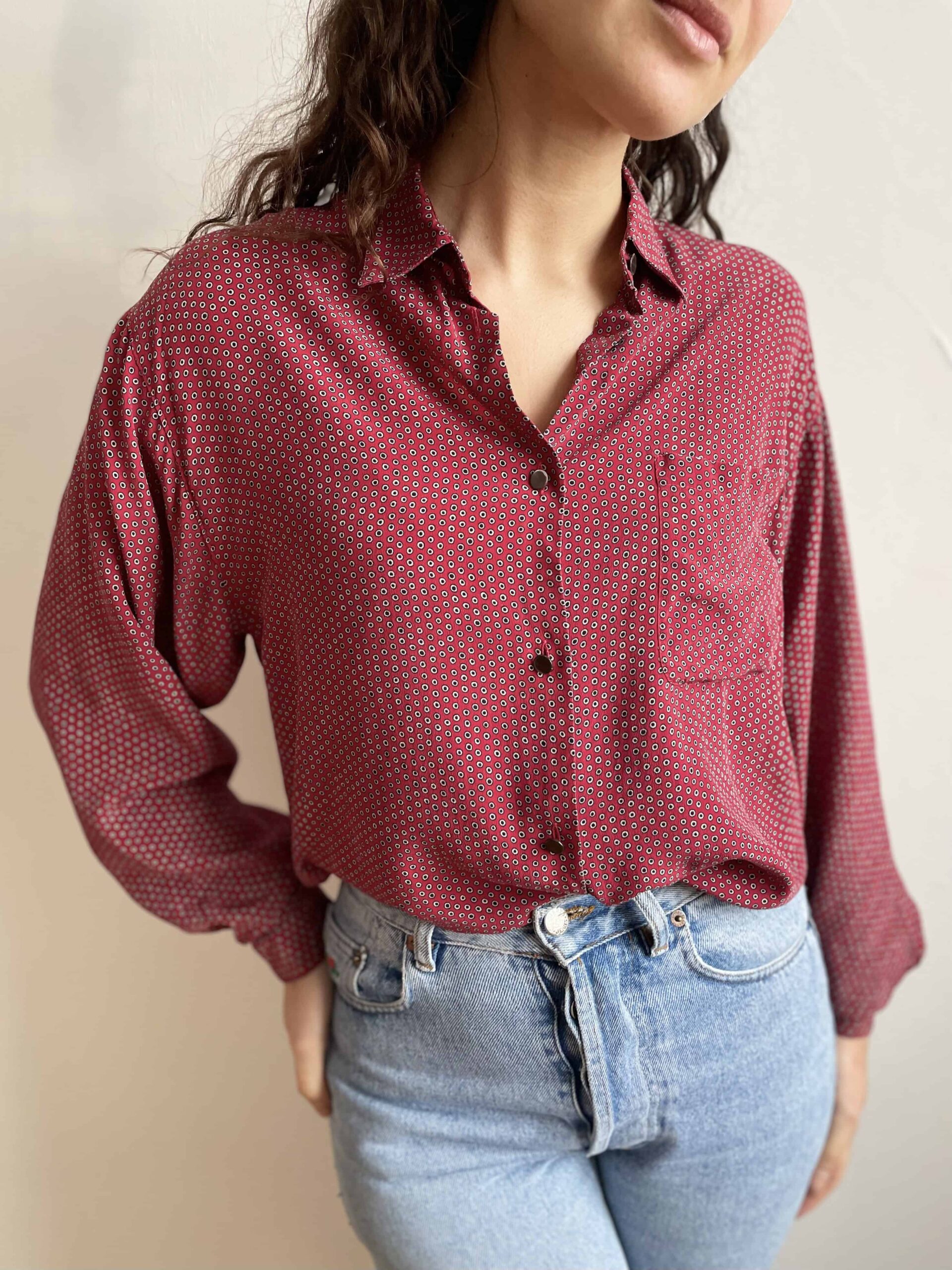 Camicia vintage 100% seta rosso scuro a pois neri
