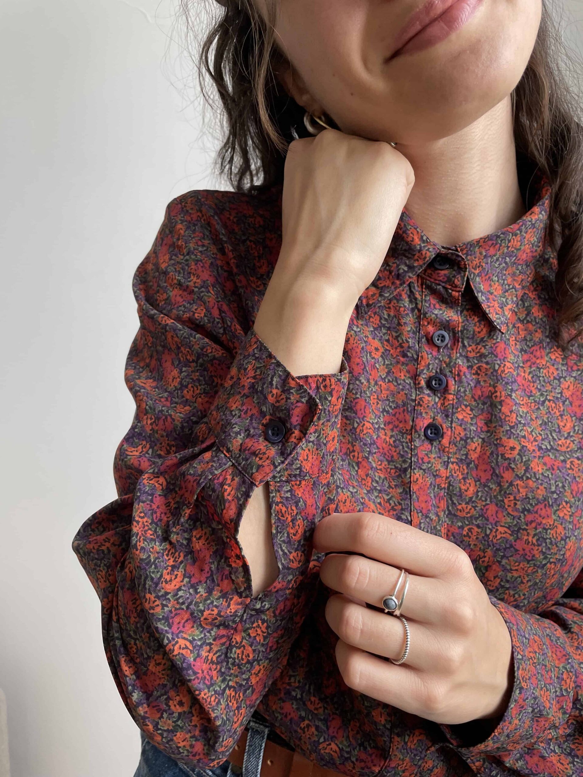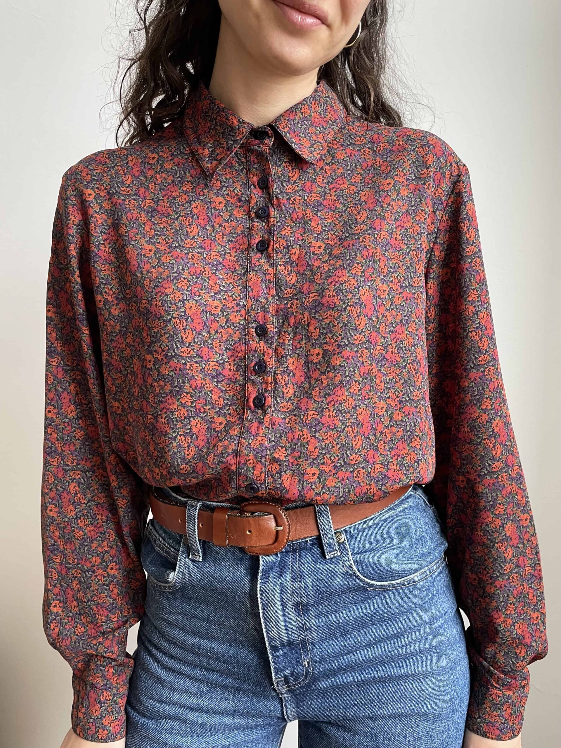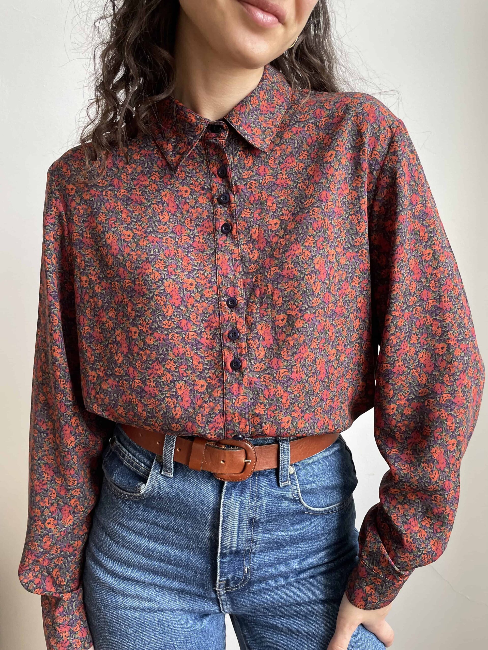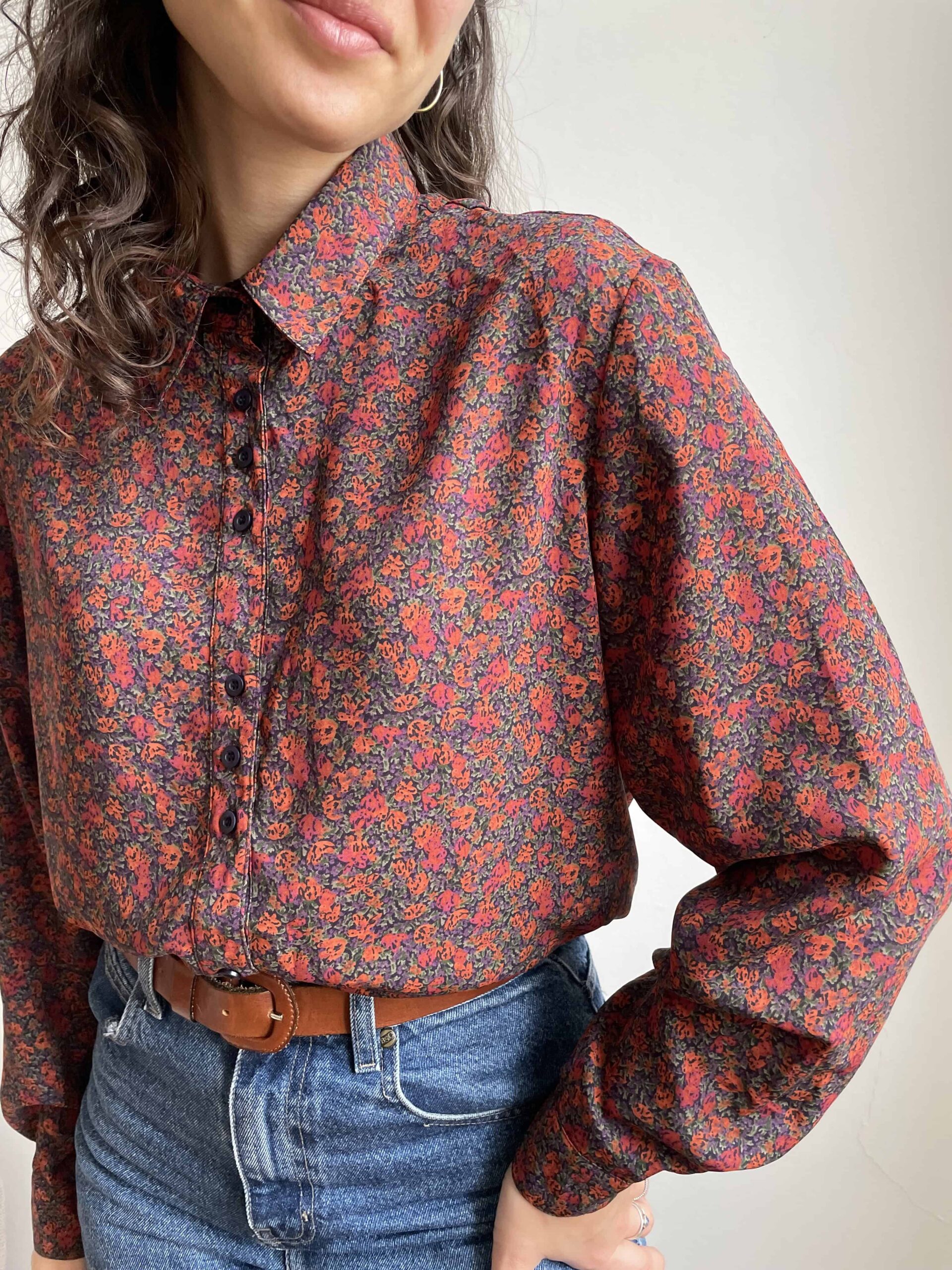 Camicia vintage con una splendida fantasia a piccoli fiori bordeaux, viola e verdi. Ha dei bottoni neri raggruppati a tre a tre. Maniche ampie. L’etichetta con la composizione non è presente, direi viscosa. Fresca e fluida. Taglia indicativa 46, in foto indossata con effetto oversize una 42. Fate riferimento alle misure confrontandole con quelle di una vostra camicia: