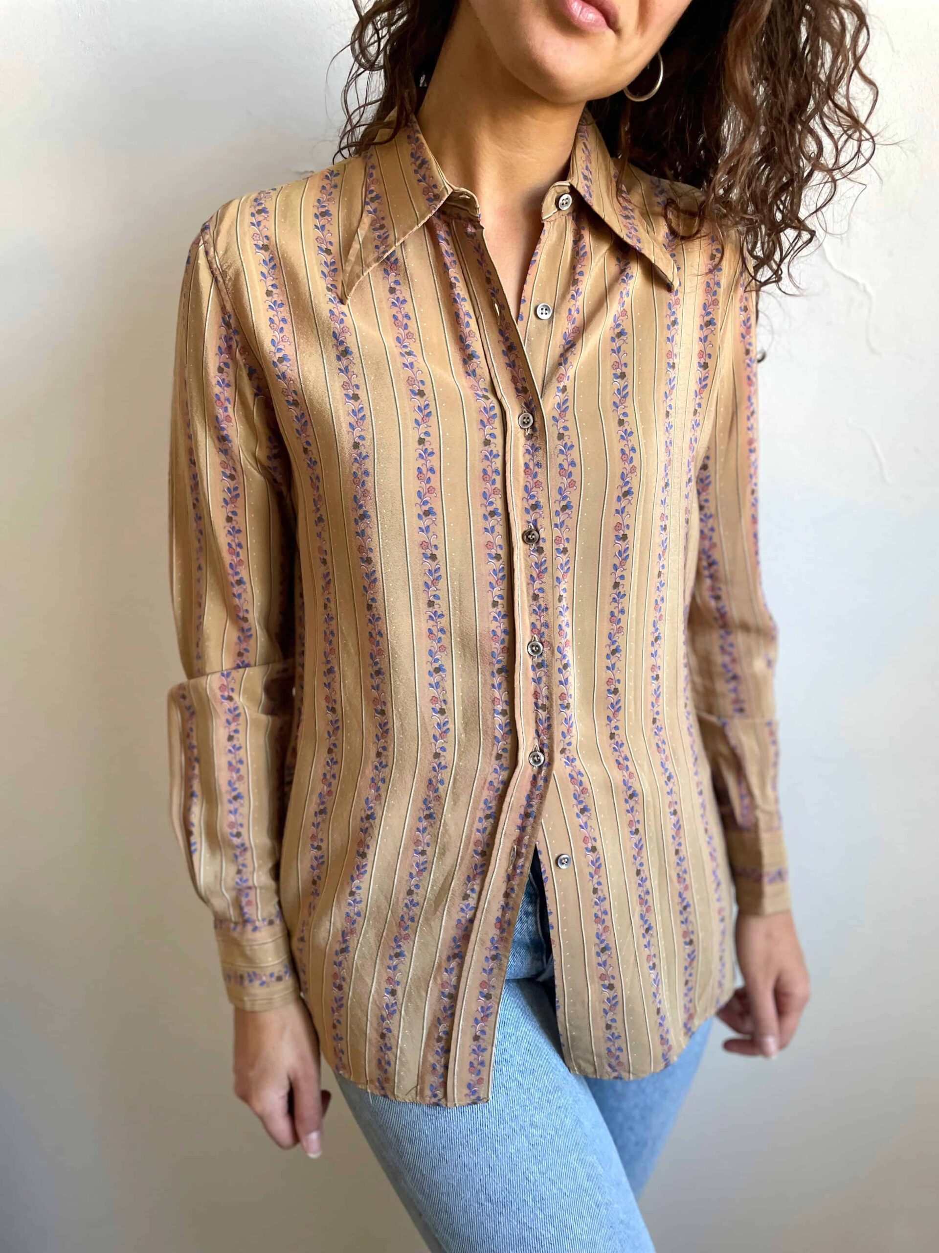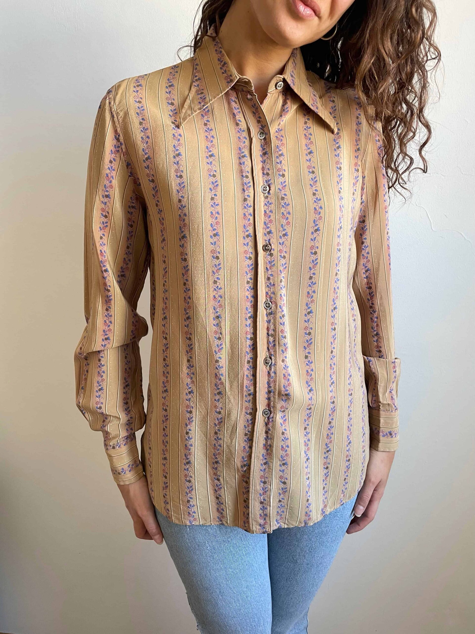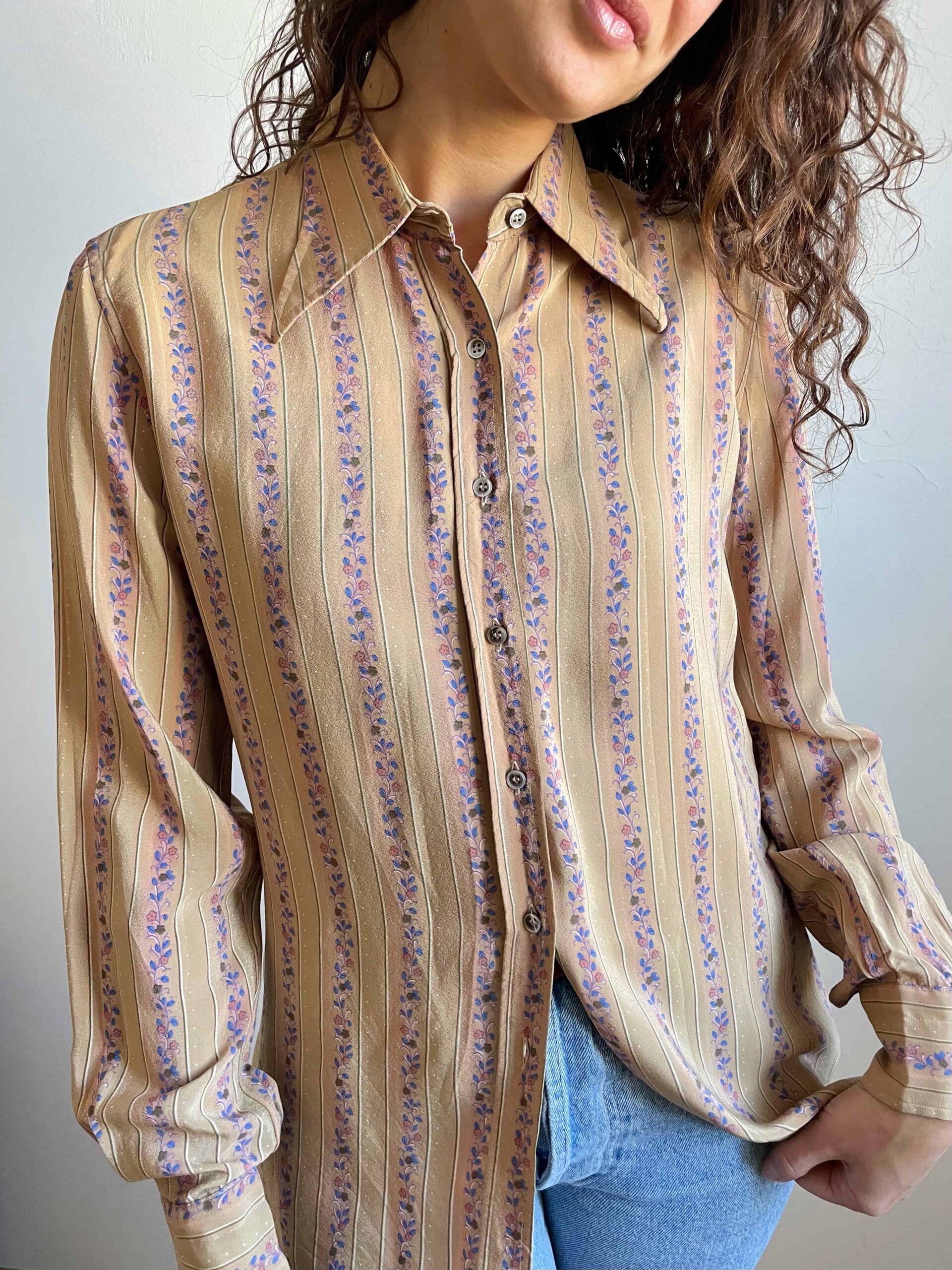 Camicia vintage anni 70 100% seta beige fiorellini rossi blu