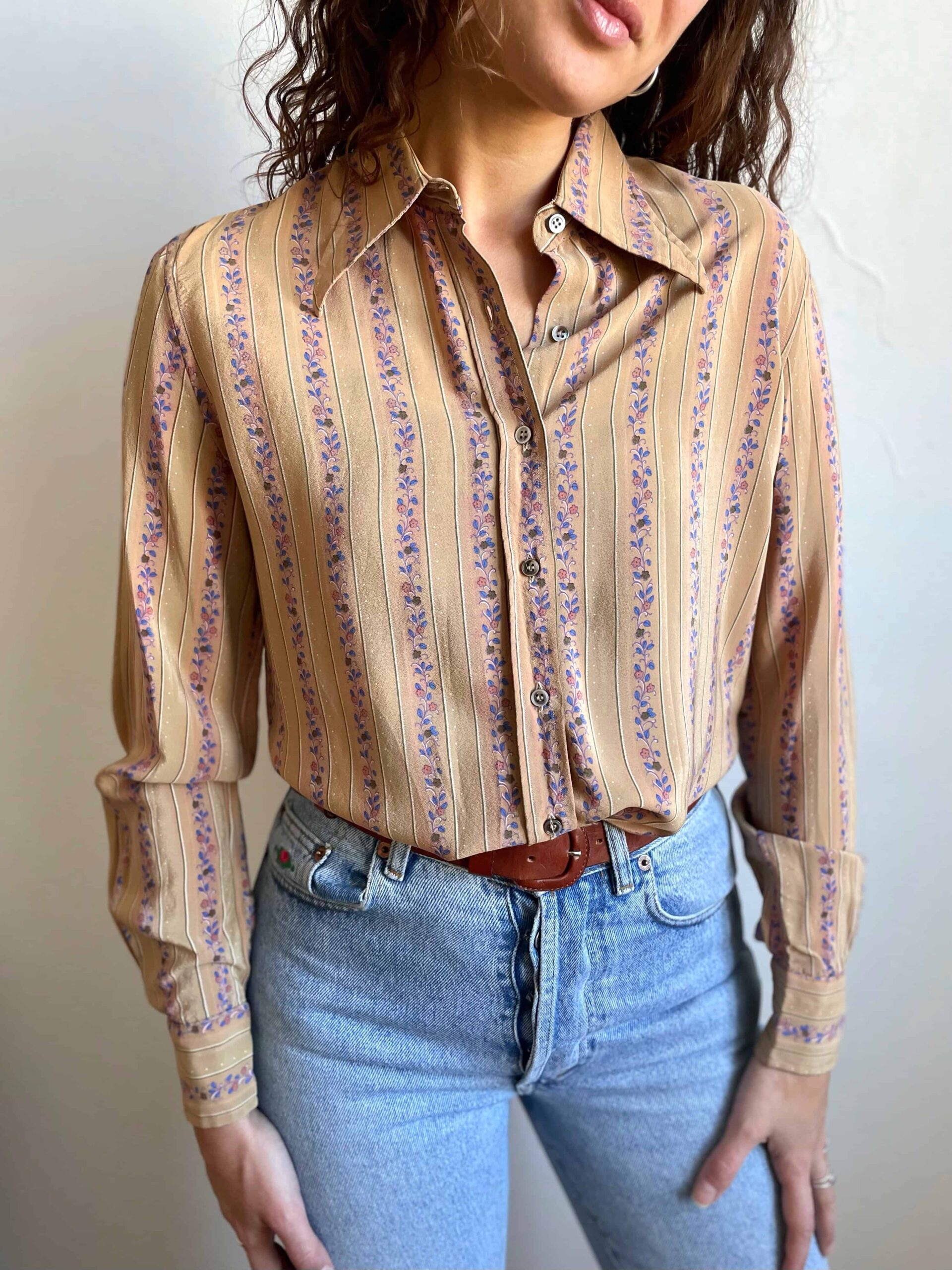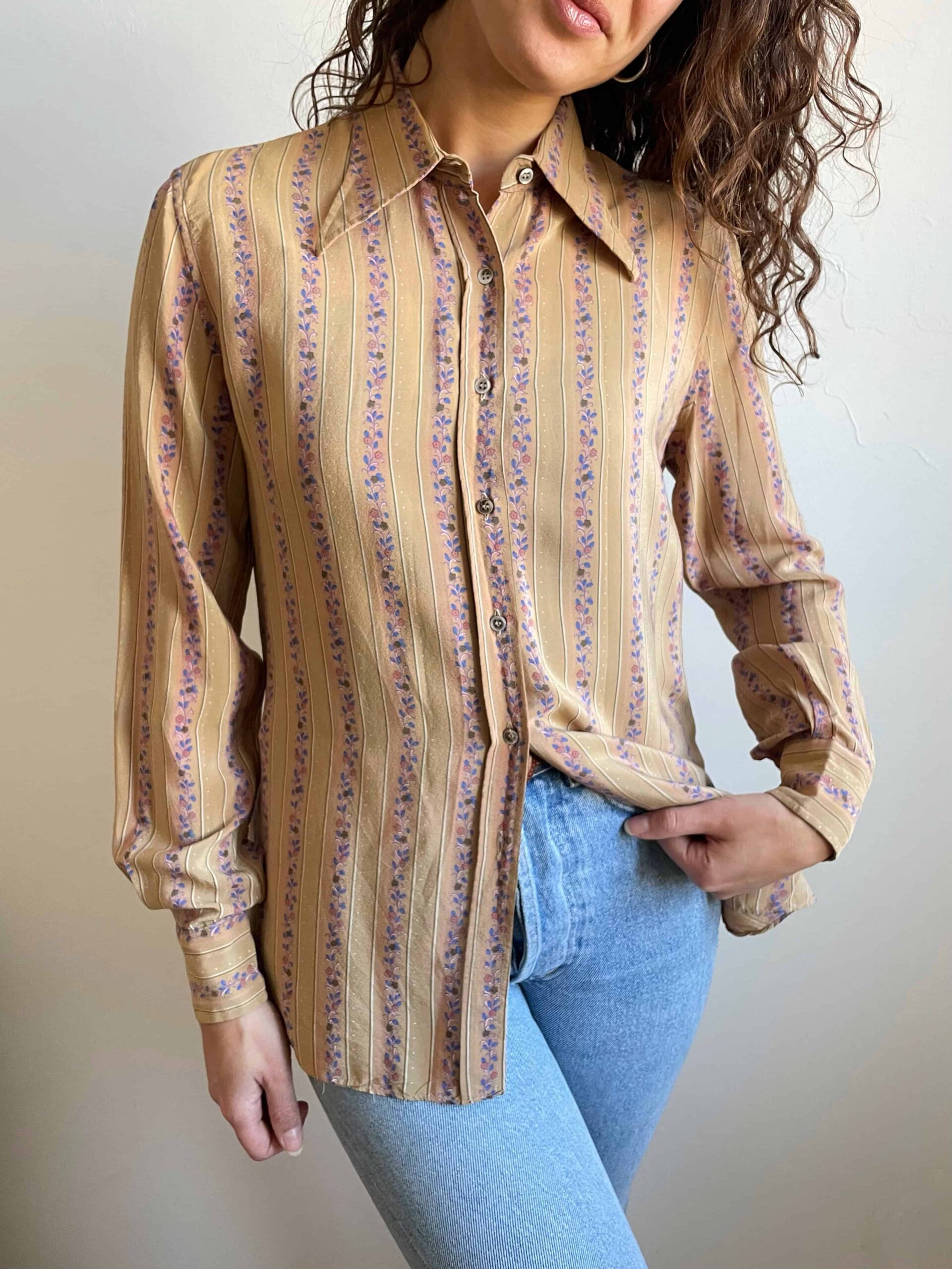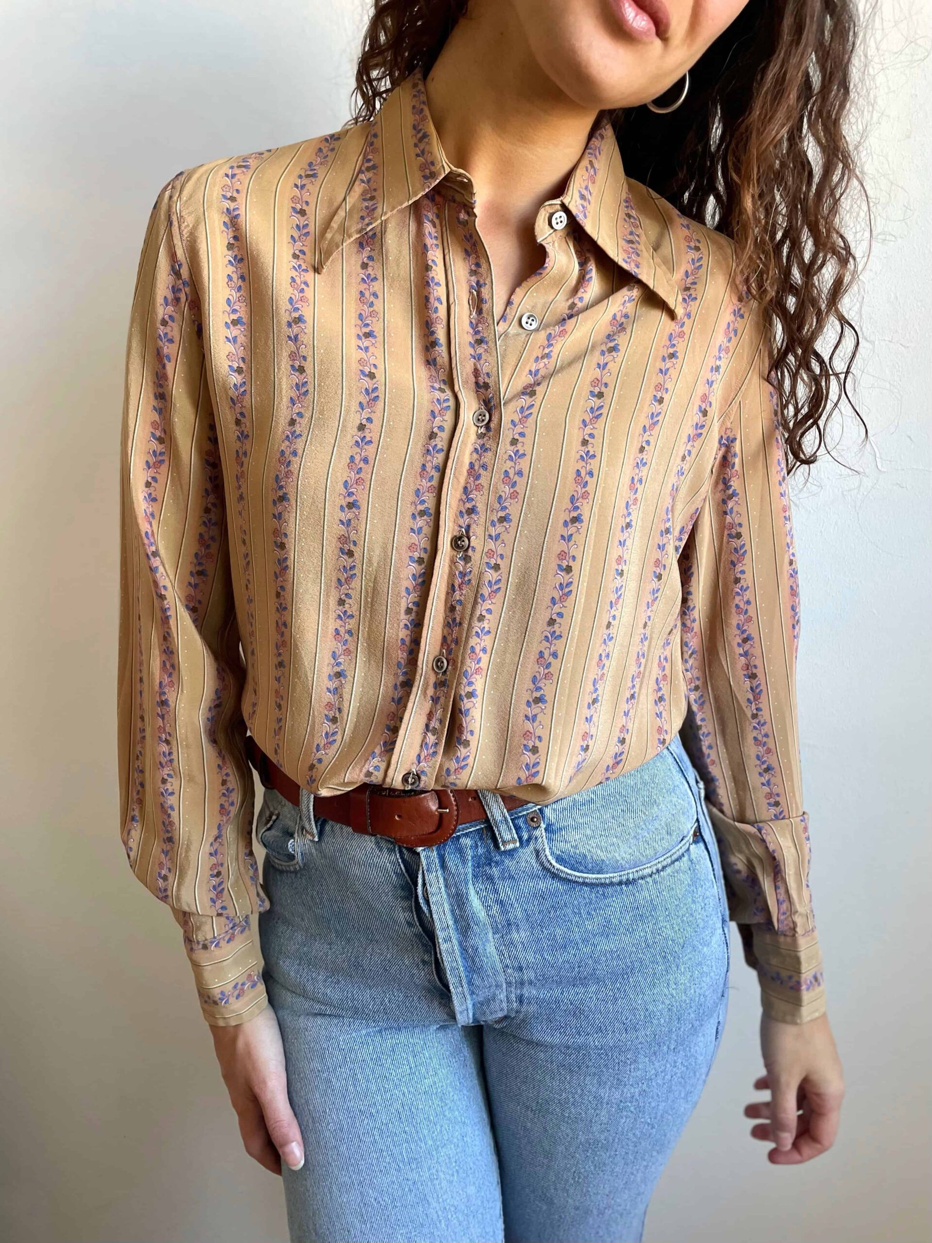 Camicia vintage anni 70 100% seta beige fiorellini rossi blu