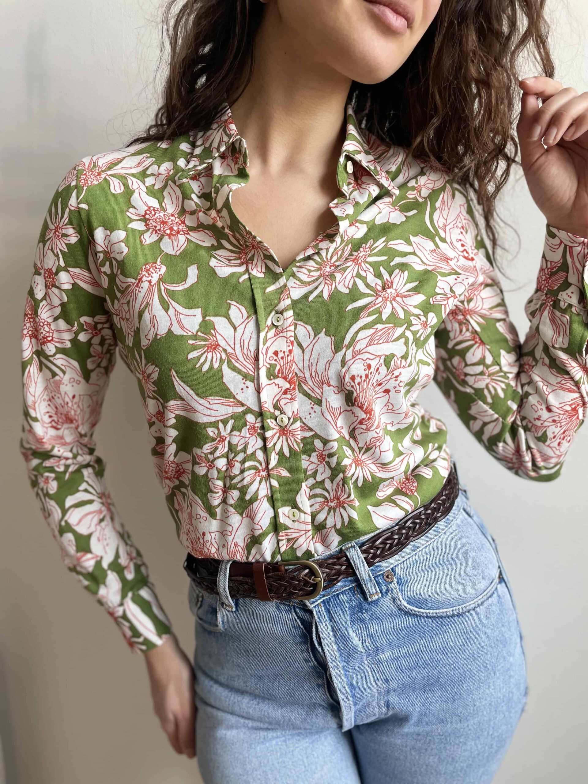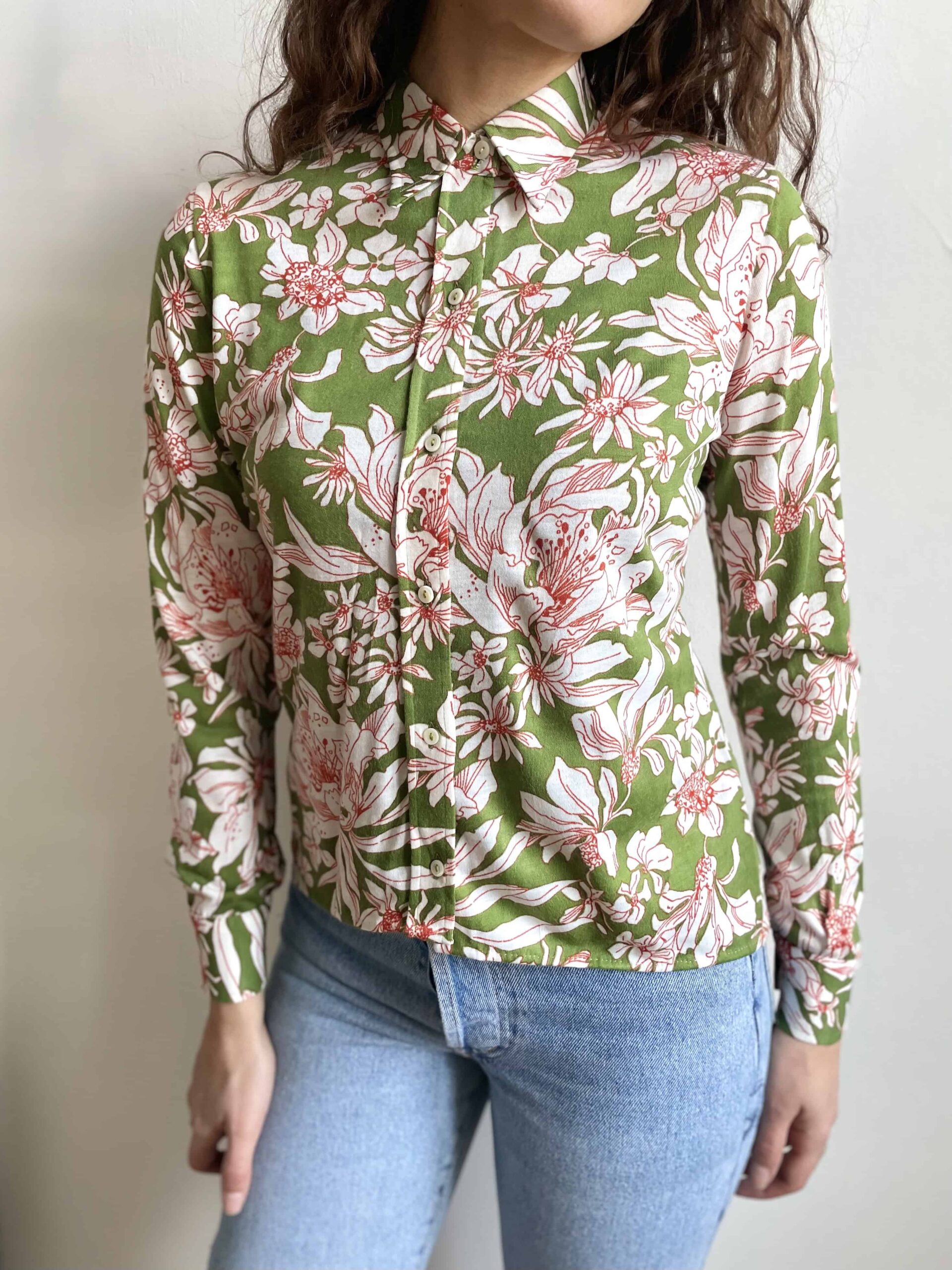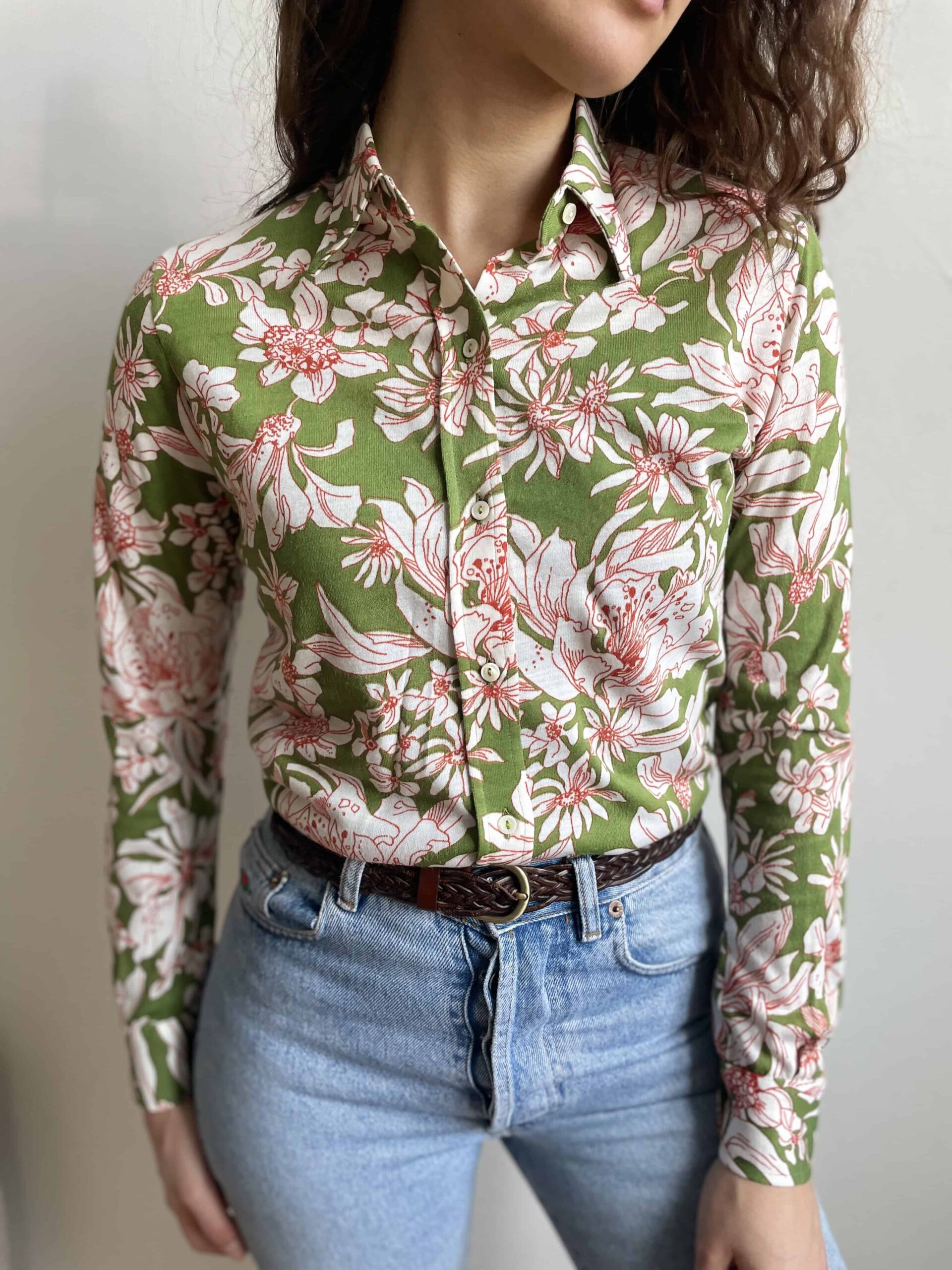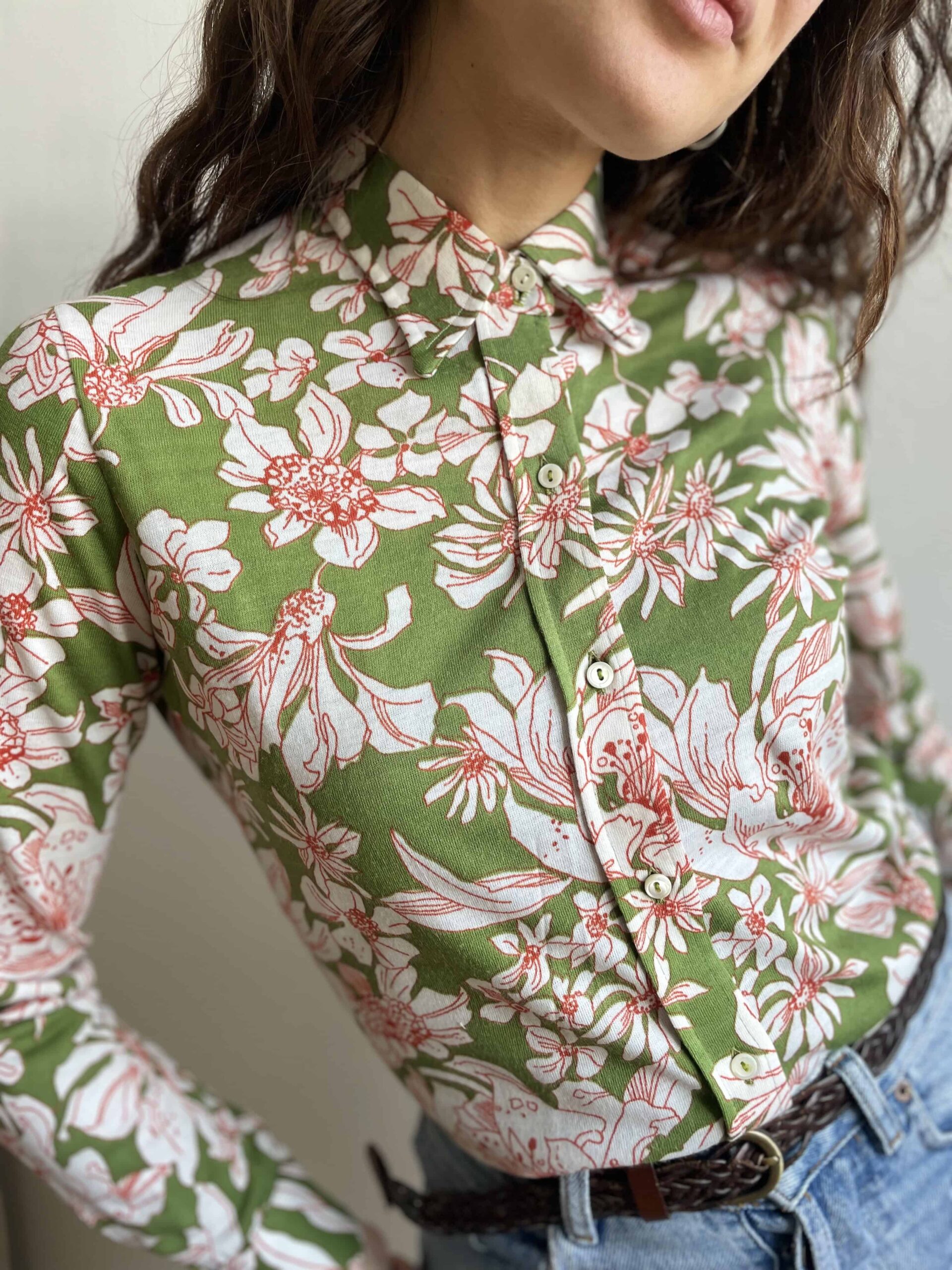 Camicia vintage anni 70 a maniche lunghe con fantasia a grandi fiori bianchi su sfondo verde chiaro. Fattura aderente. Composizione non indicata, tessuto probabilmente sintetico ma di ottima qualità che riproduce molto bene la flanella di cotone. Veste bene sia una 40 che una 42. Fate riferimento alle misure confrontandole con quelle di una vostra camicia: