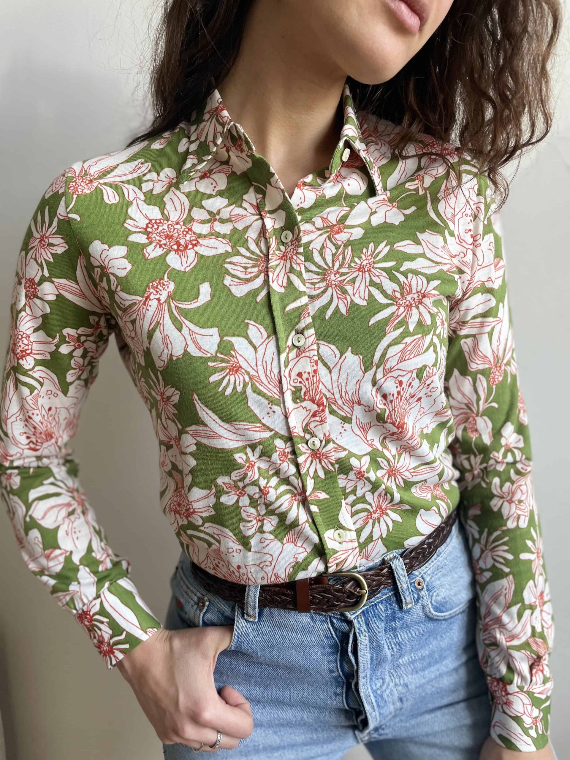 Camicia vintage anni 70 verde chiaro a fiori bianchi