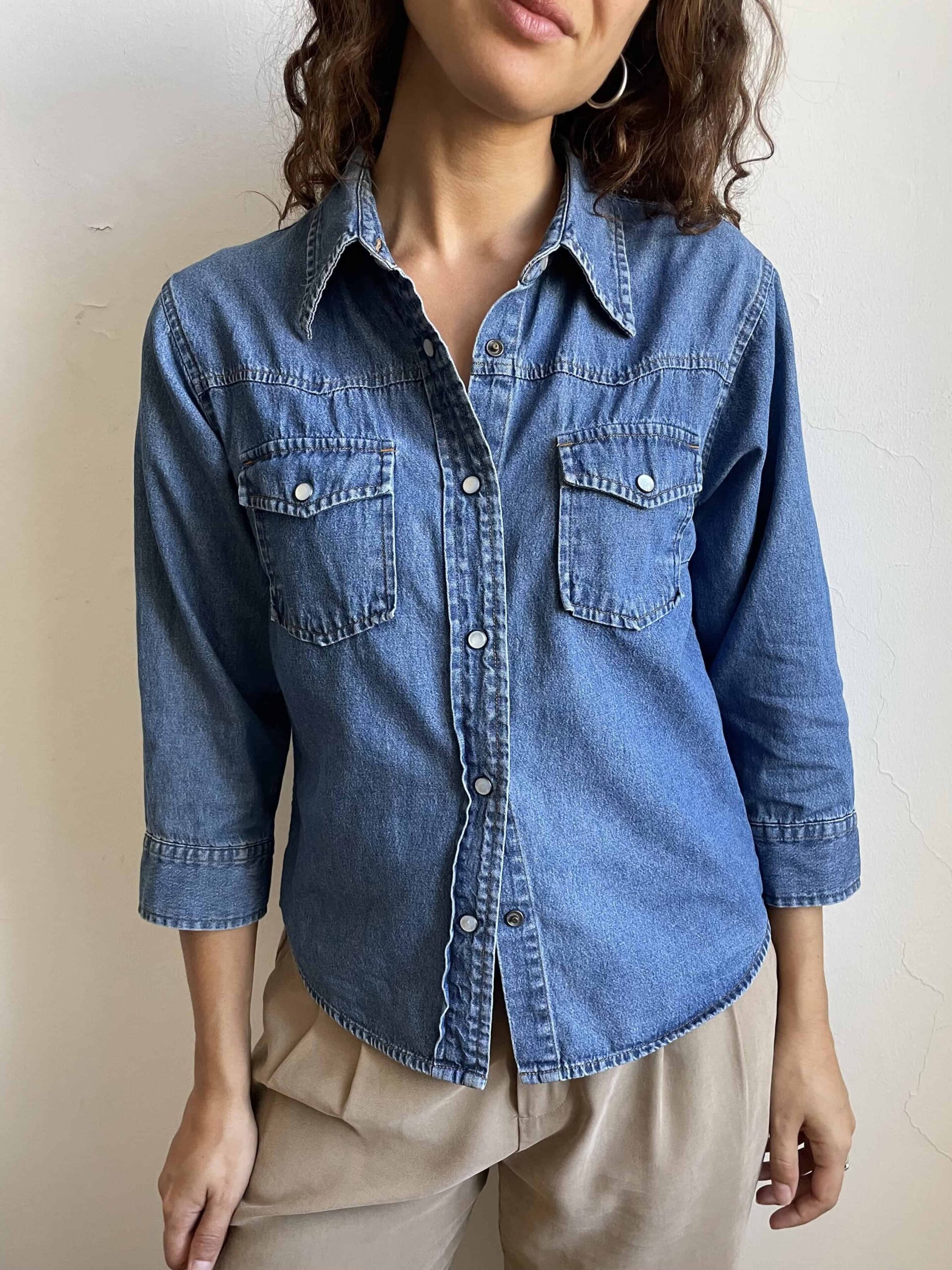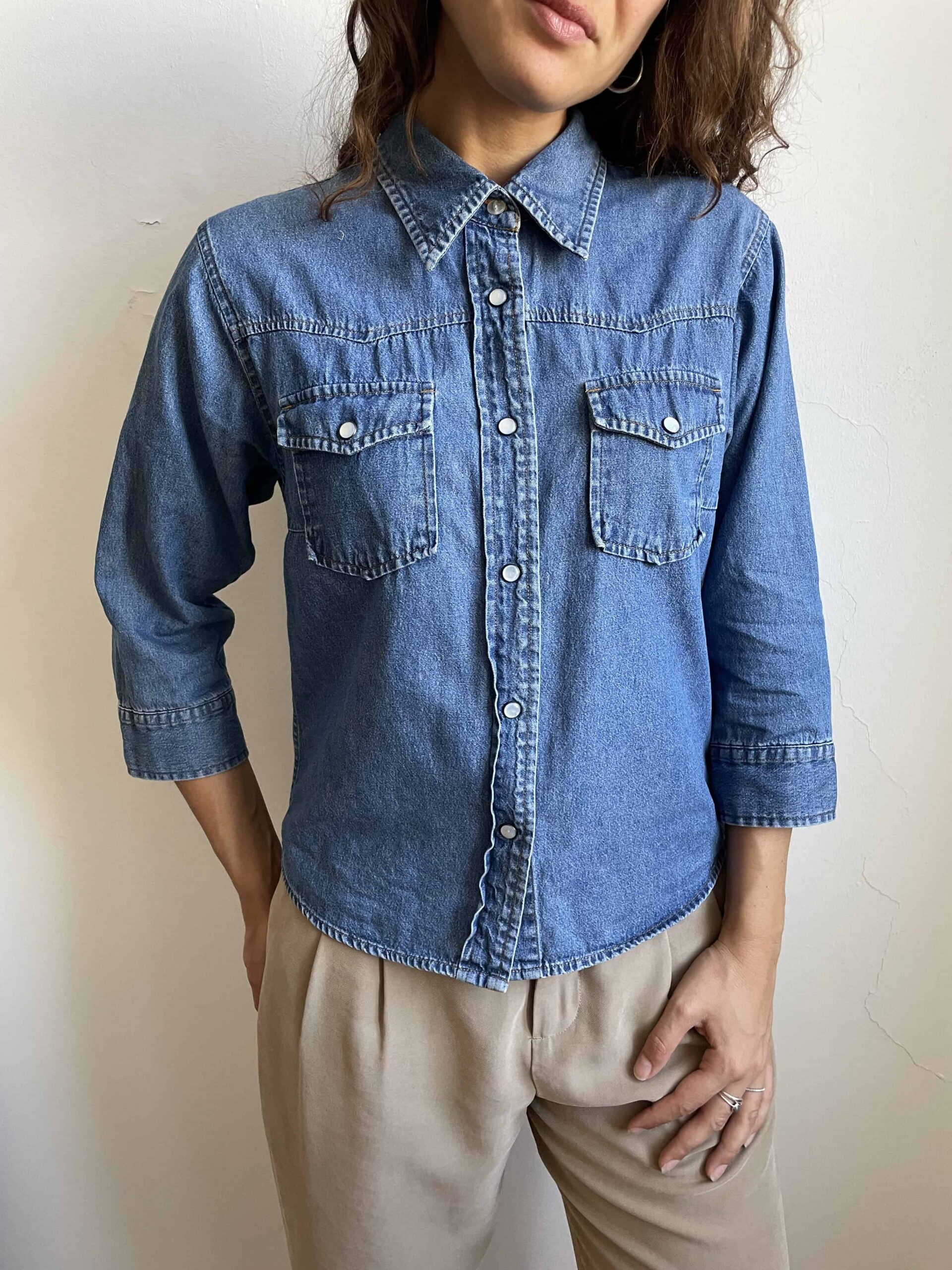 Camicia vintage da donna in jeans. L’etichetta con la composizione non è più leggibile ma è sicuramente un jeans di cotone, non troppo spesso, quindi non rimane rigido ed è comodo da indossare. . Manica a tre quarti. Bottoncini a scatto bianchi luminosi, ce ne sono due anche su ogni polsino. Sta bene portata sia completamente chiusa che un po’ sbottonata, come vi mostro in foto. Taglia indicativa 42. Fate riferimento alle misure confrontandole con quelle di una vostra camicia: