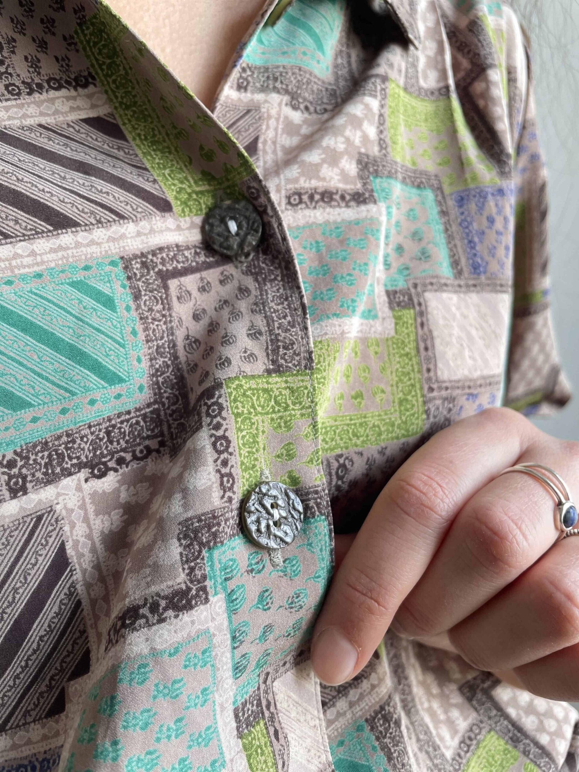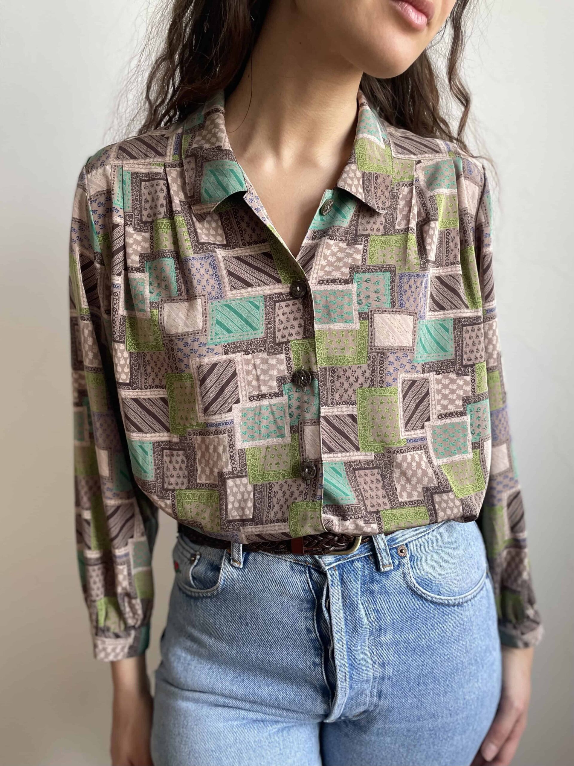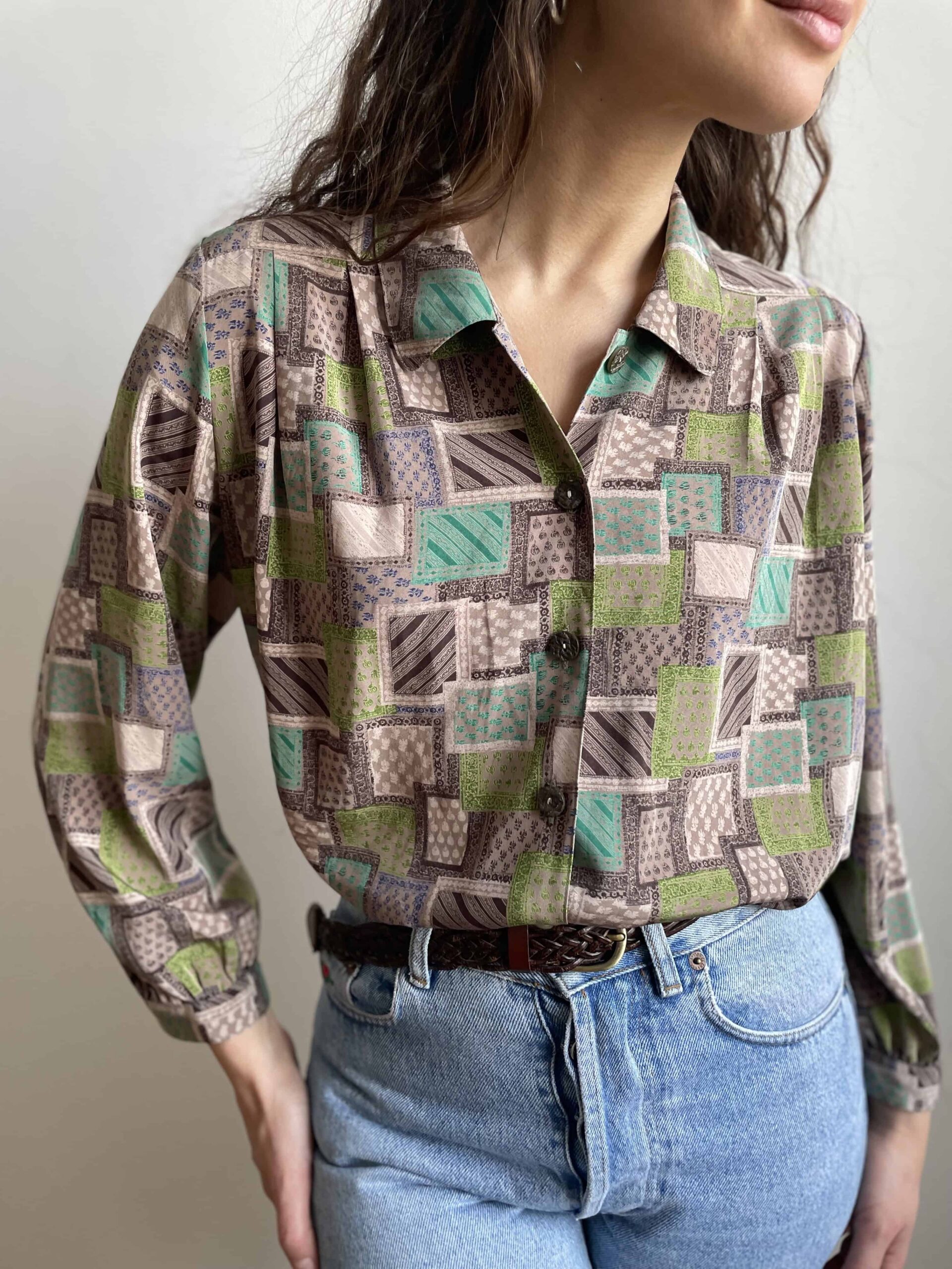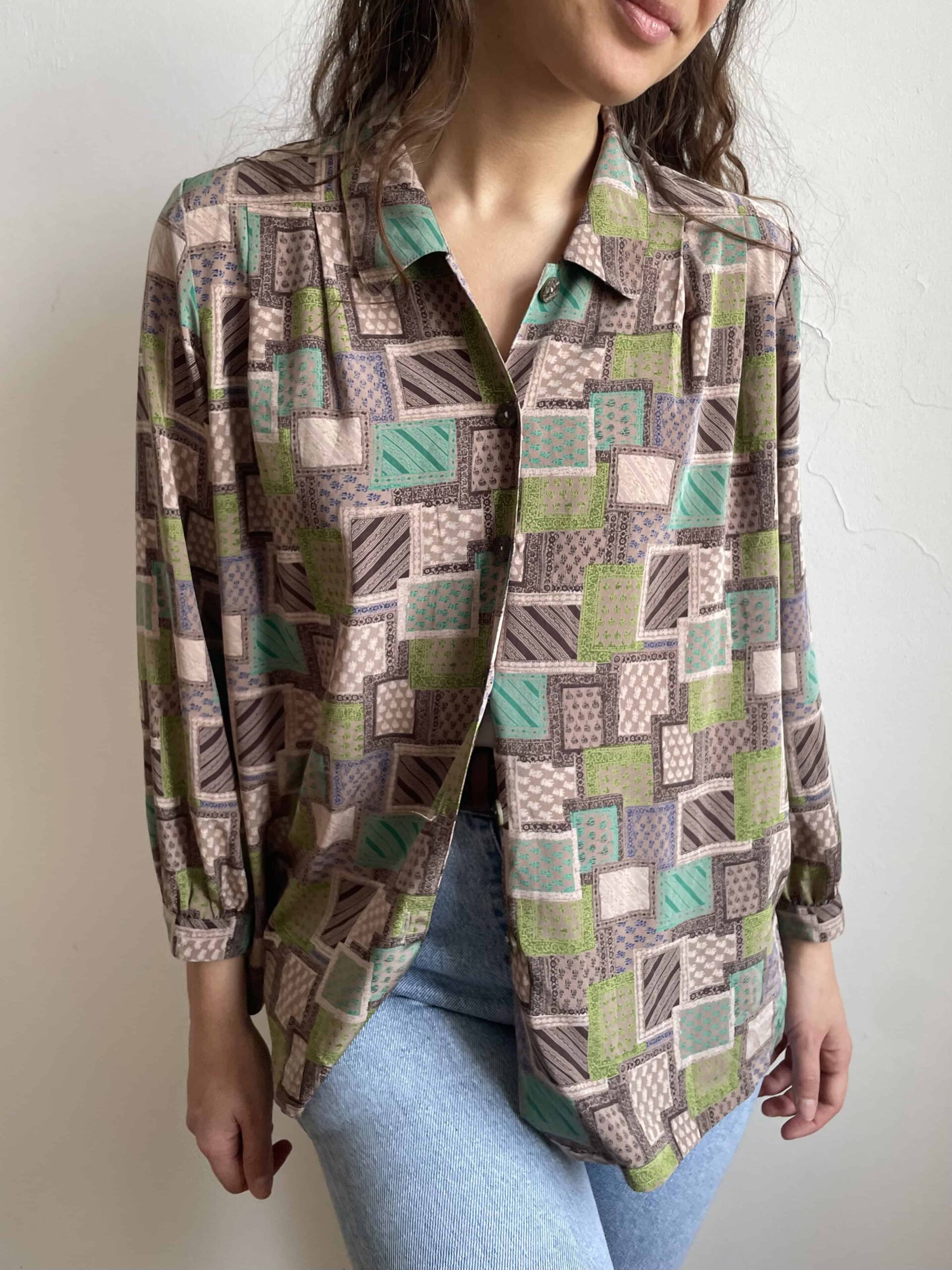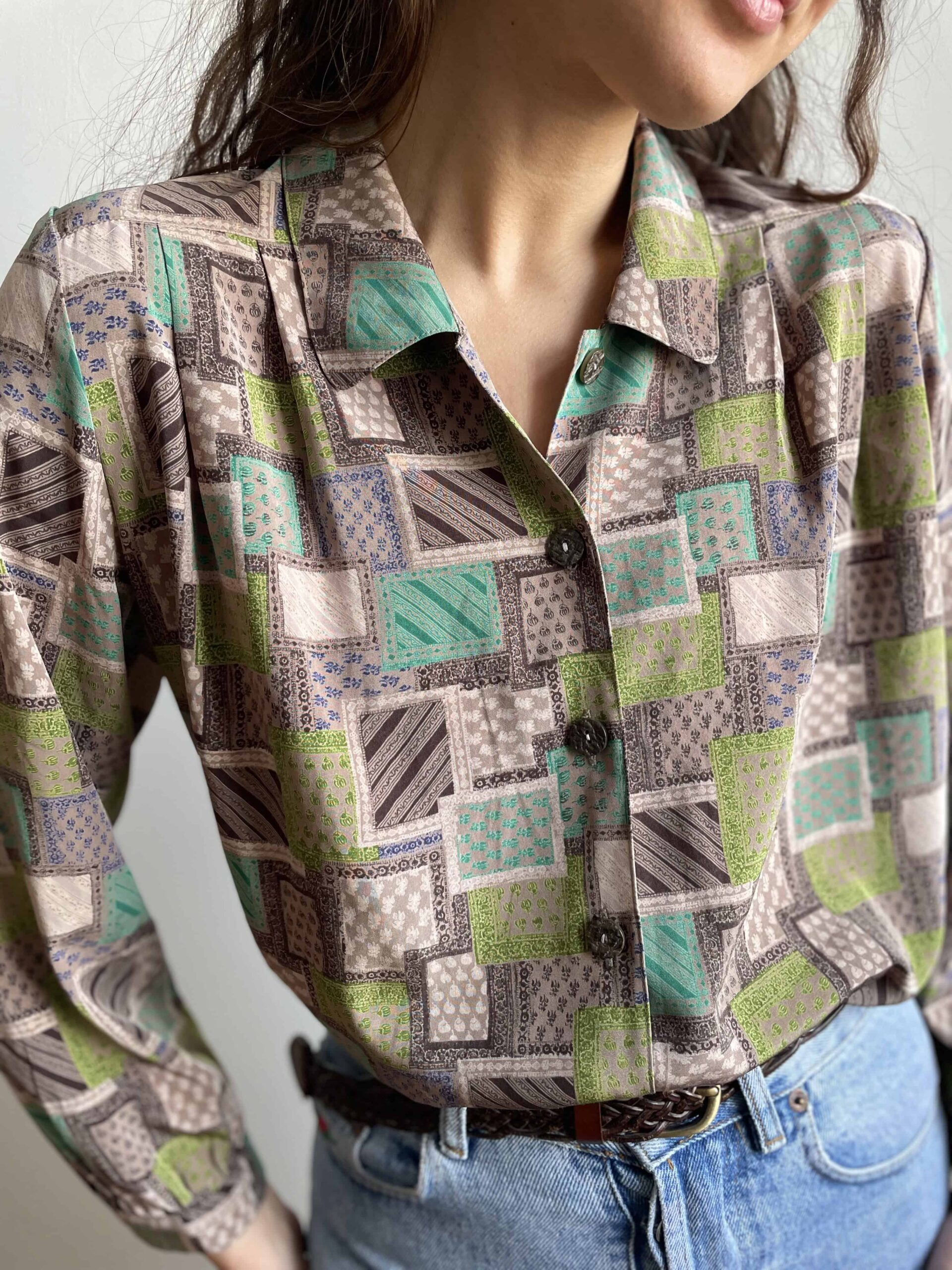 Camicia vintage da donna con una bella fantasia a quadri sui toni del verde e blu. La fattura della camicia è molto bella, spalle non sporgenti, belle pieghe che dalle spalle scendono lungo il petto. Tessuto fluido e lucente molto piacevole da indossare, in poliestere. Taglia indicativa 40 perchè non è molto grande di spalle. Fate riferimento alle misure confrontandole con quelle di una vostra camicia: