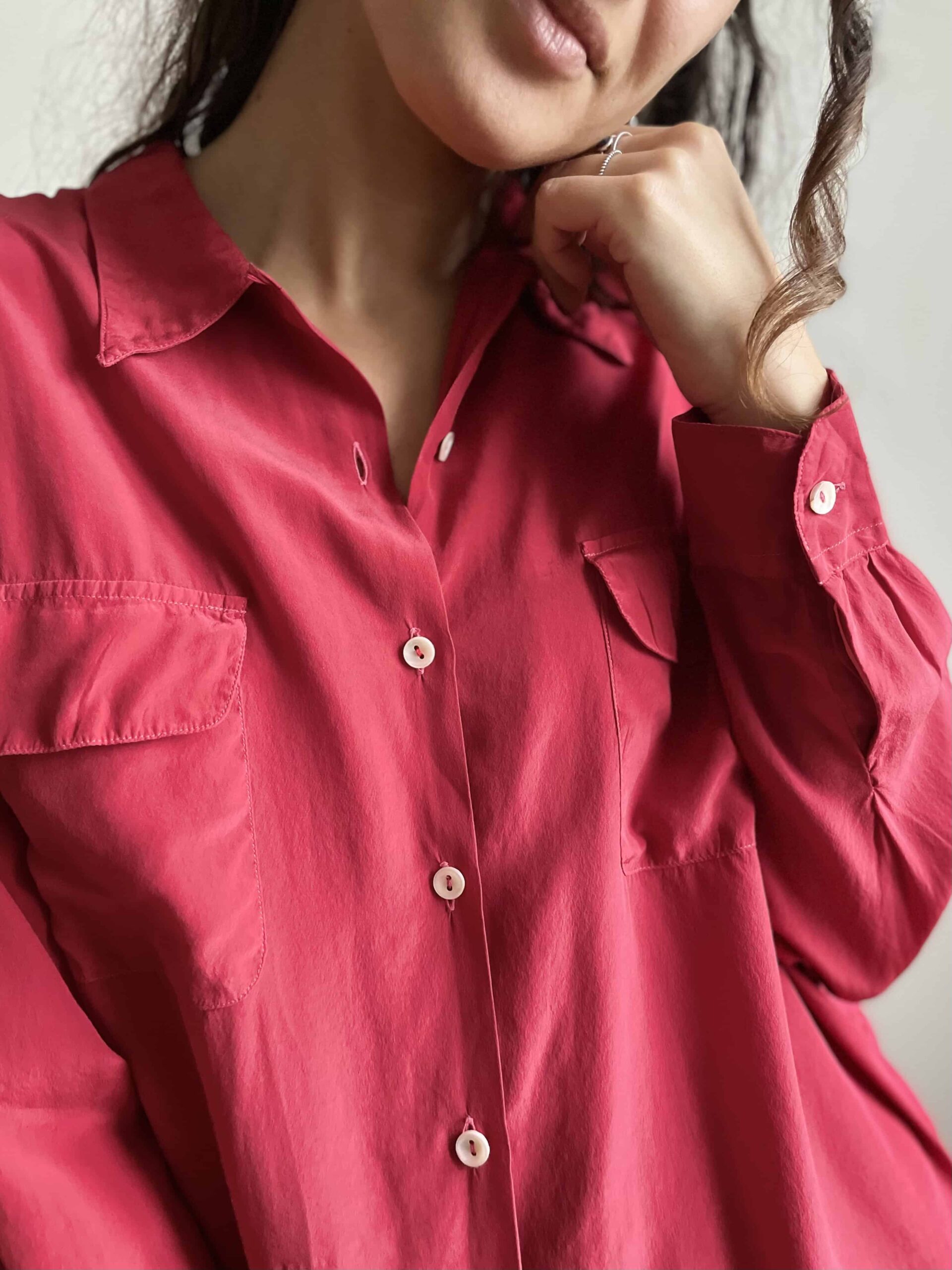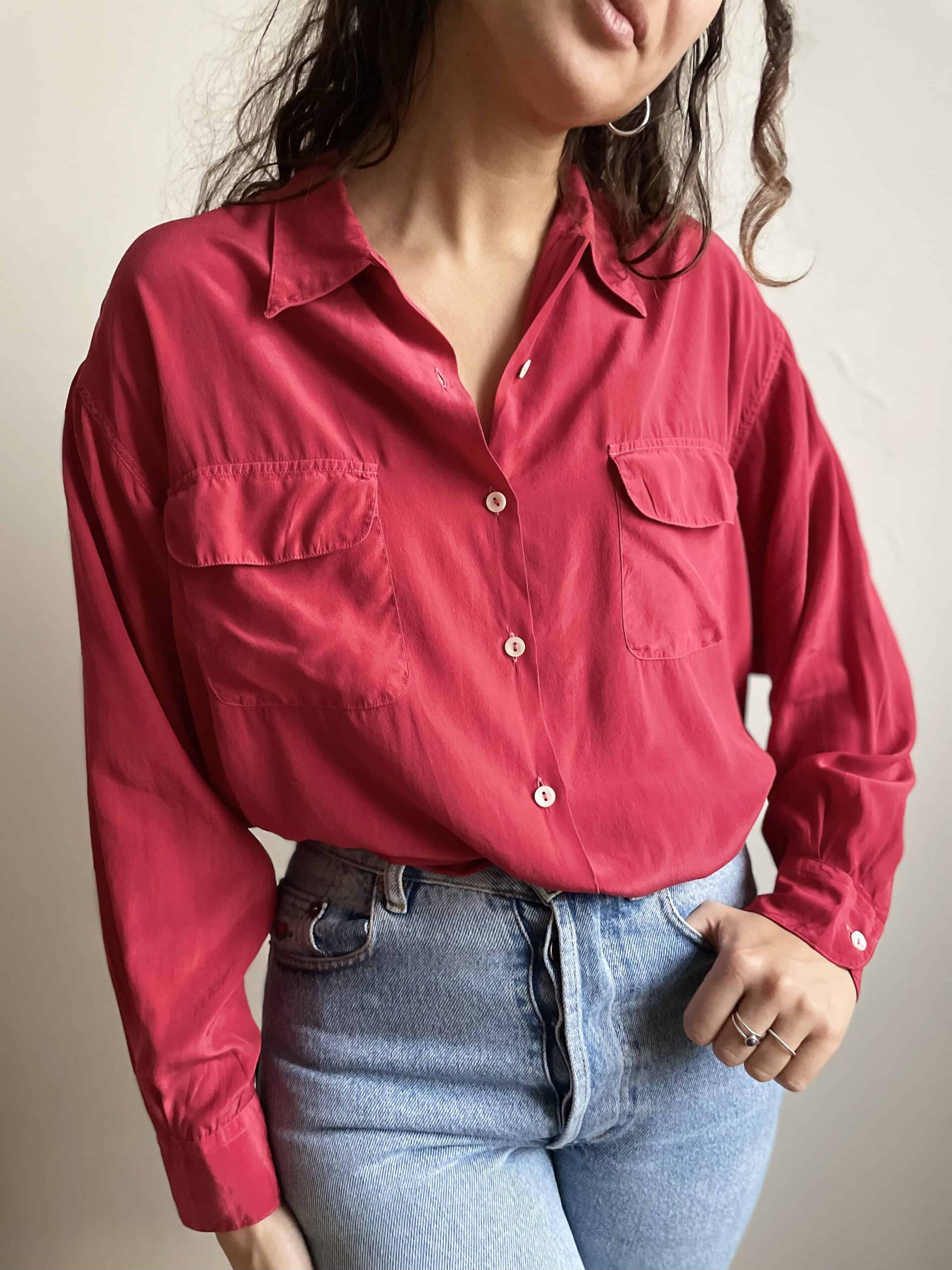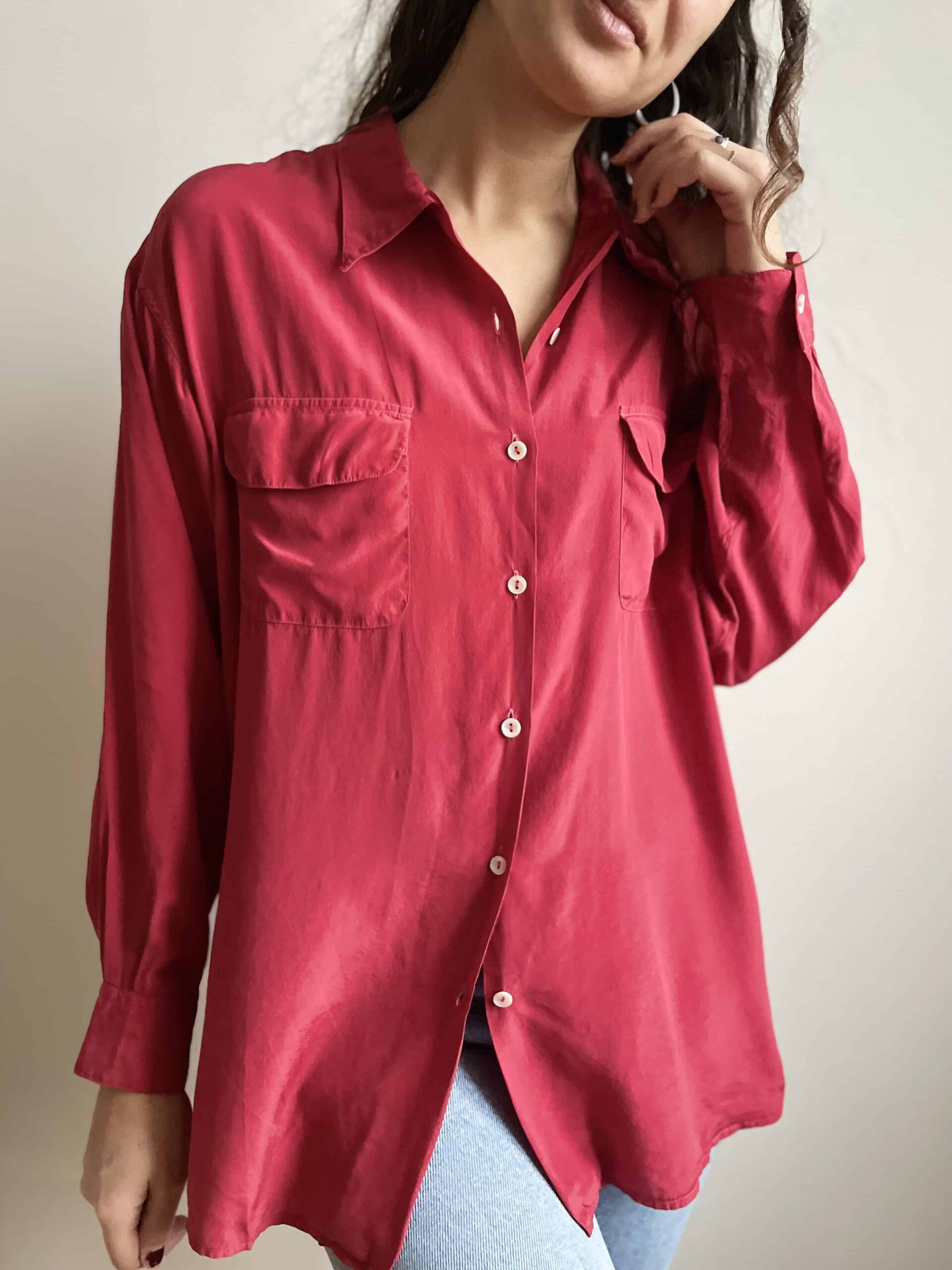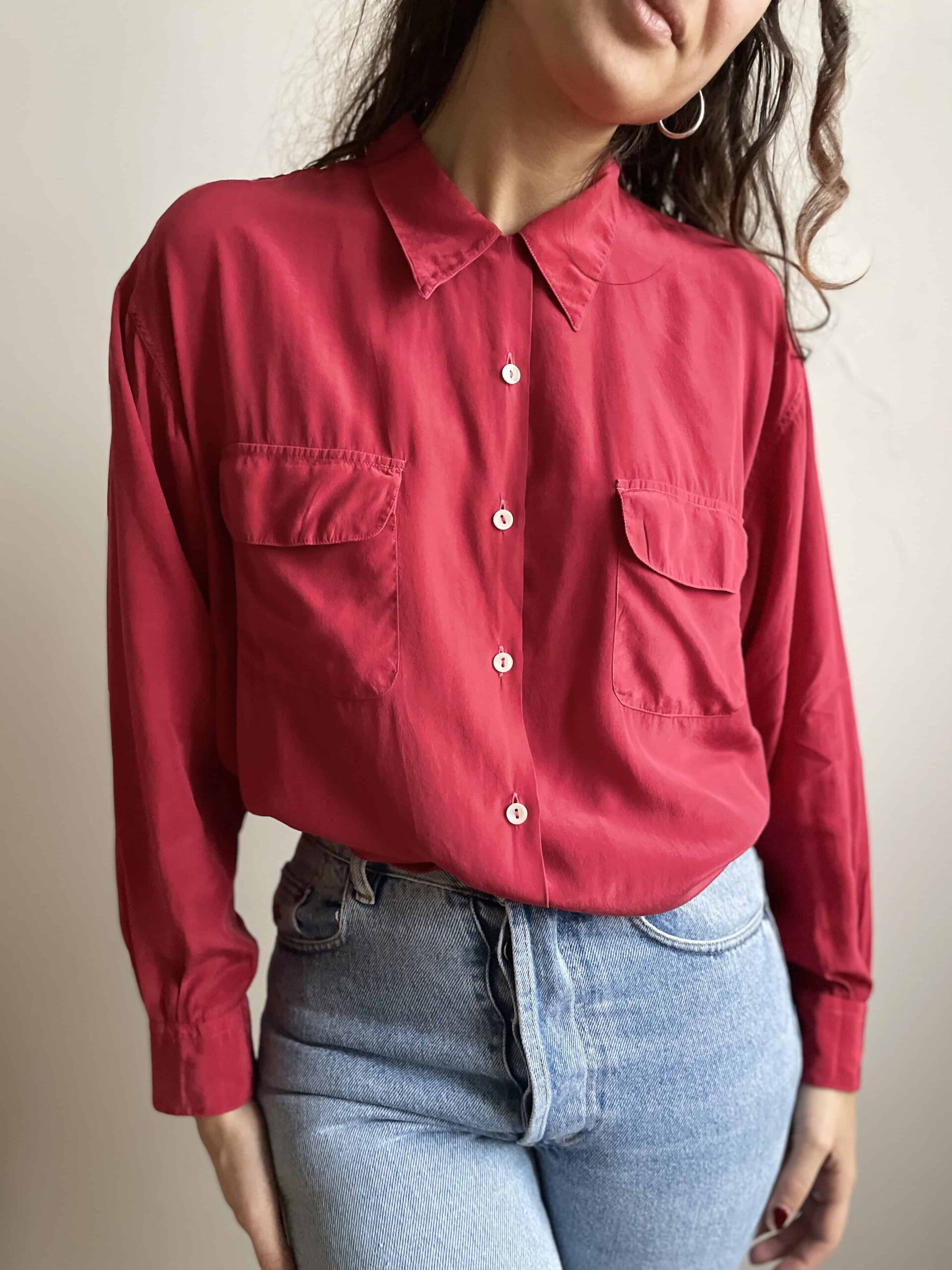 Camicia vintage da donna in 100% pura seta rossa con bottoni in luminose madreperle. La seta è lucente e di qualità. Taglia indicativa 48. Fate riferimento alle misure confrontandole con quelle di una vostra camicia: