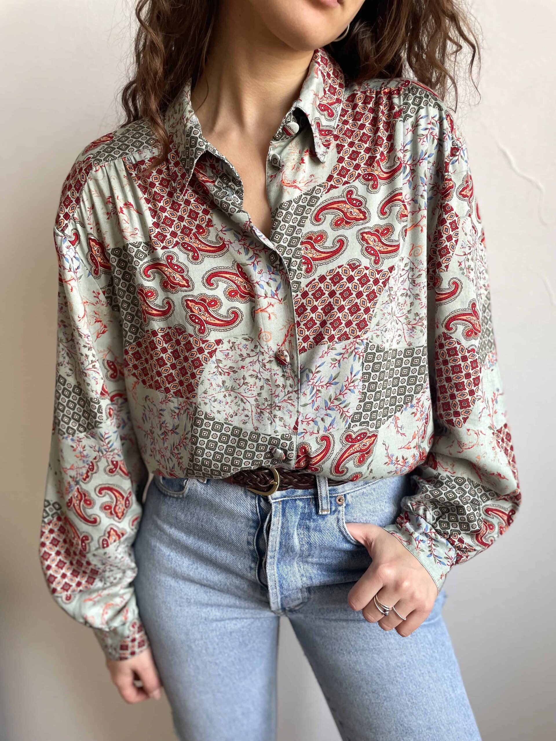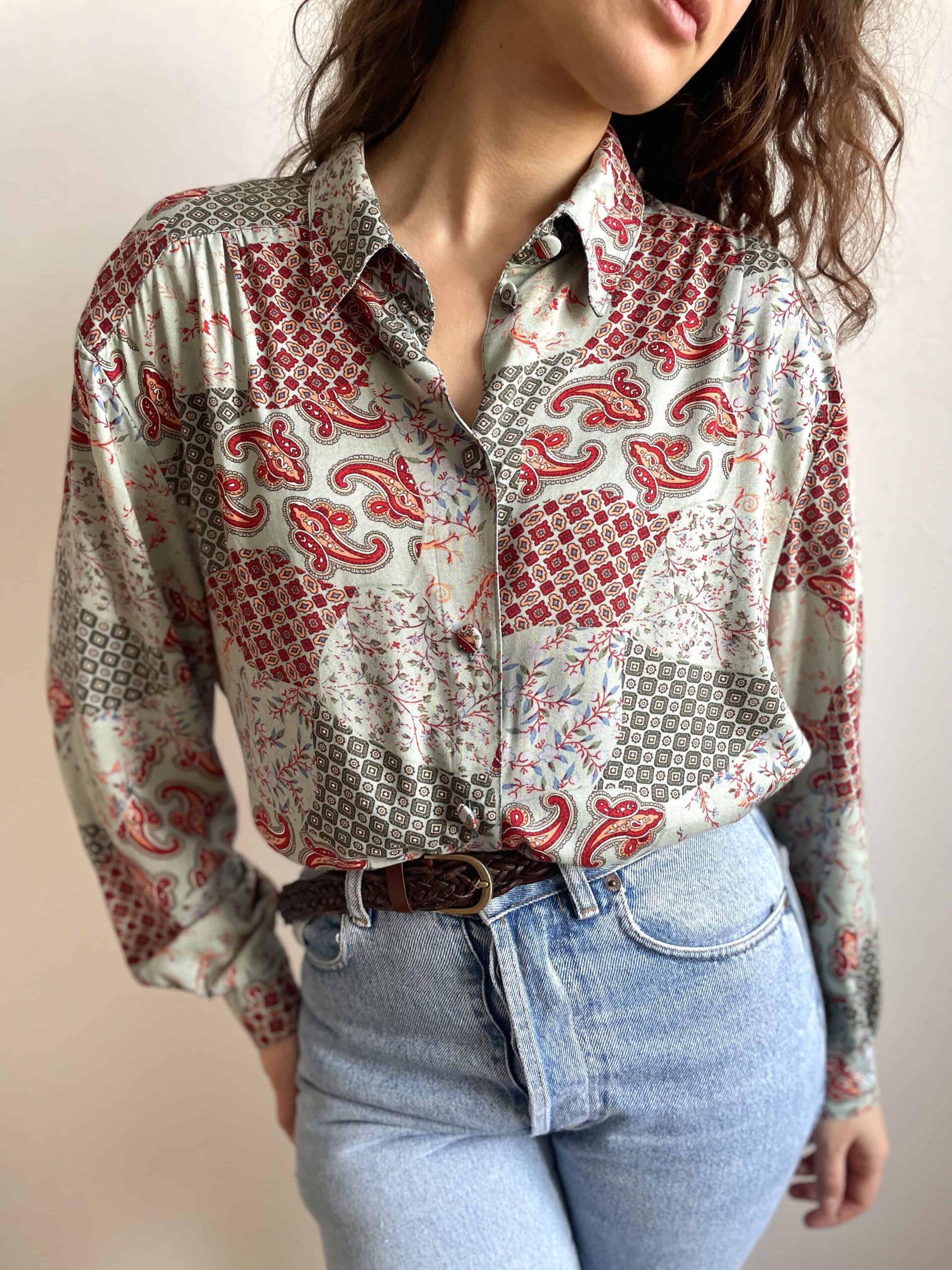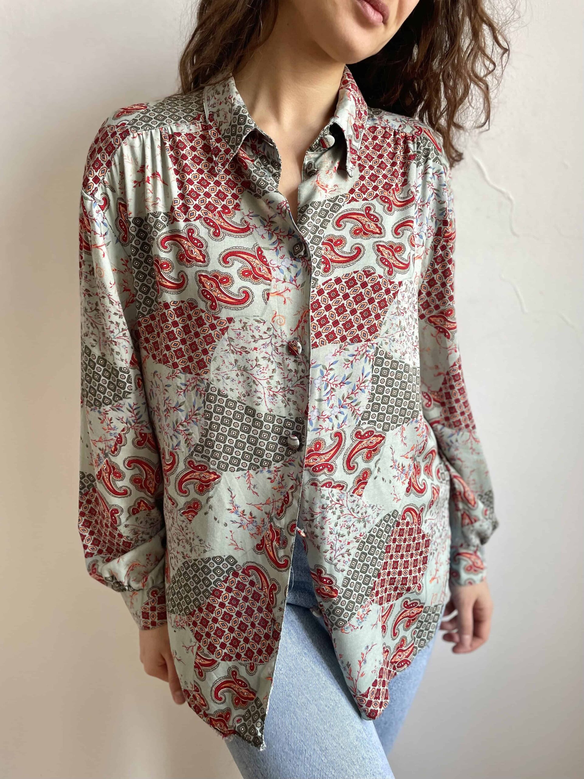 Camicia vintage da donna in 100% pura viscosa morbidissima con splendida fantasia etnica a fiori bordeaux su sfondo verde acqua. Bella fattura con tutti i bottoni rivestiti con lo stesso tessuto e belle pieghe che dalle spalle scendono lungo il petto. Taglia indicativa 48. Fate riferimento alle misure confrontandole con quelle di una vostra camicia: