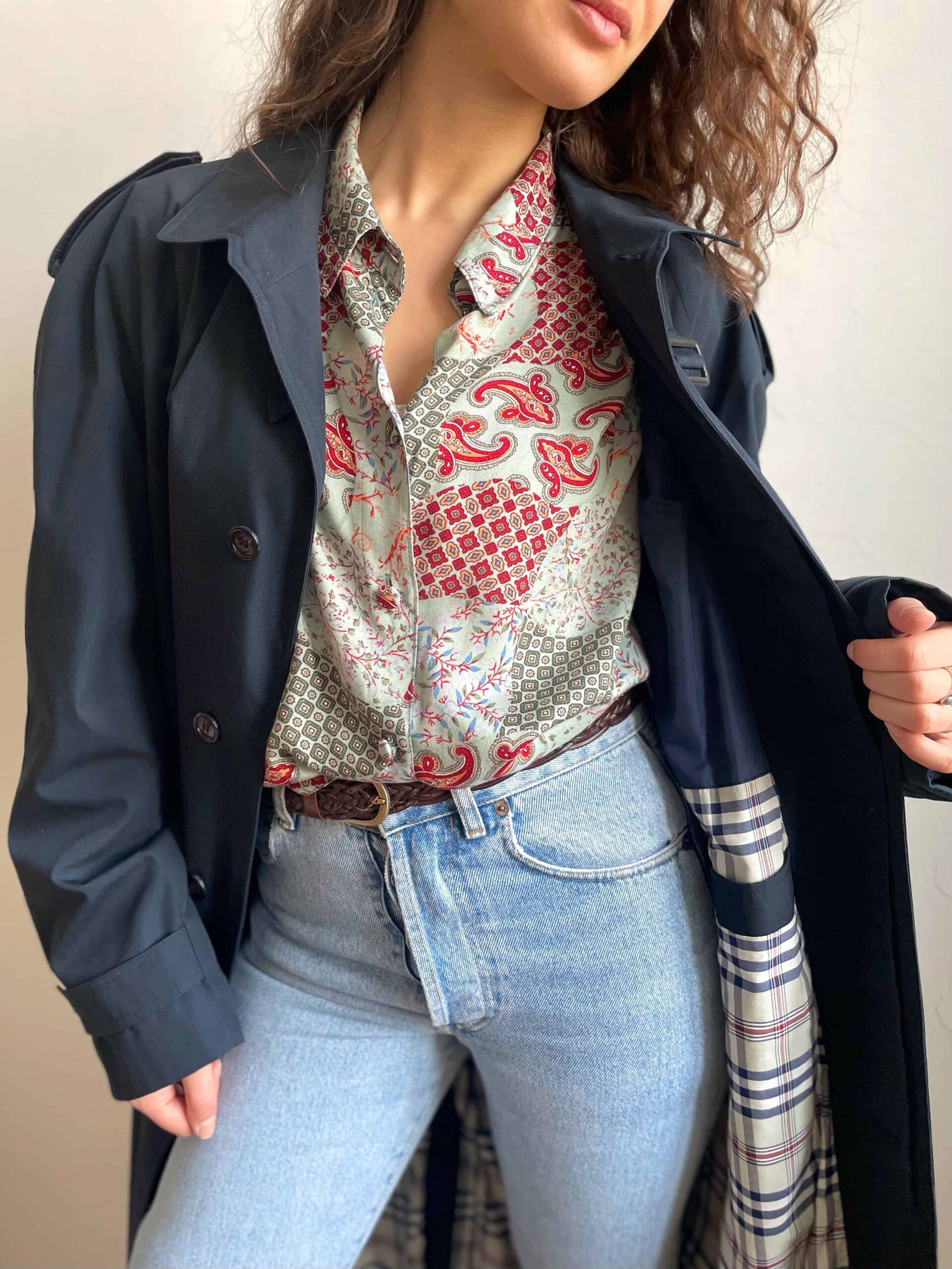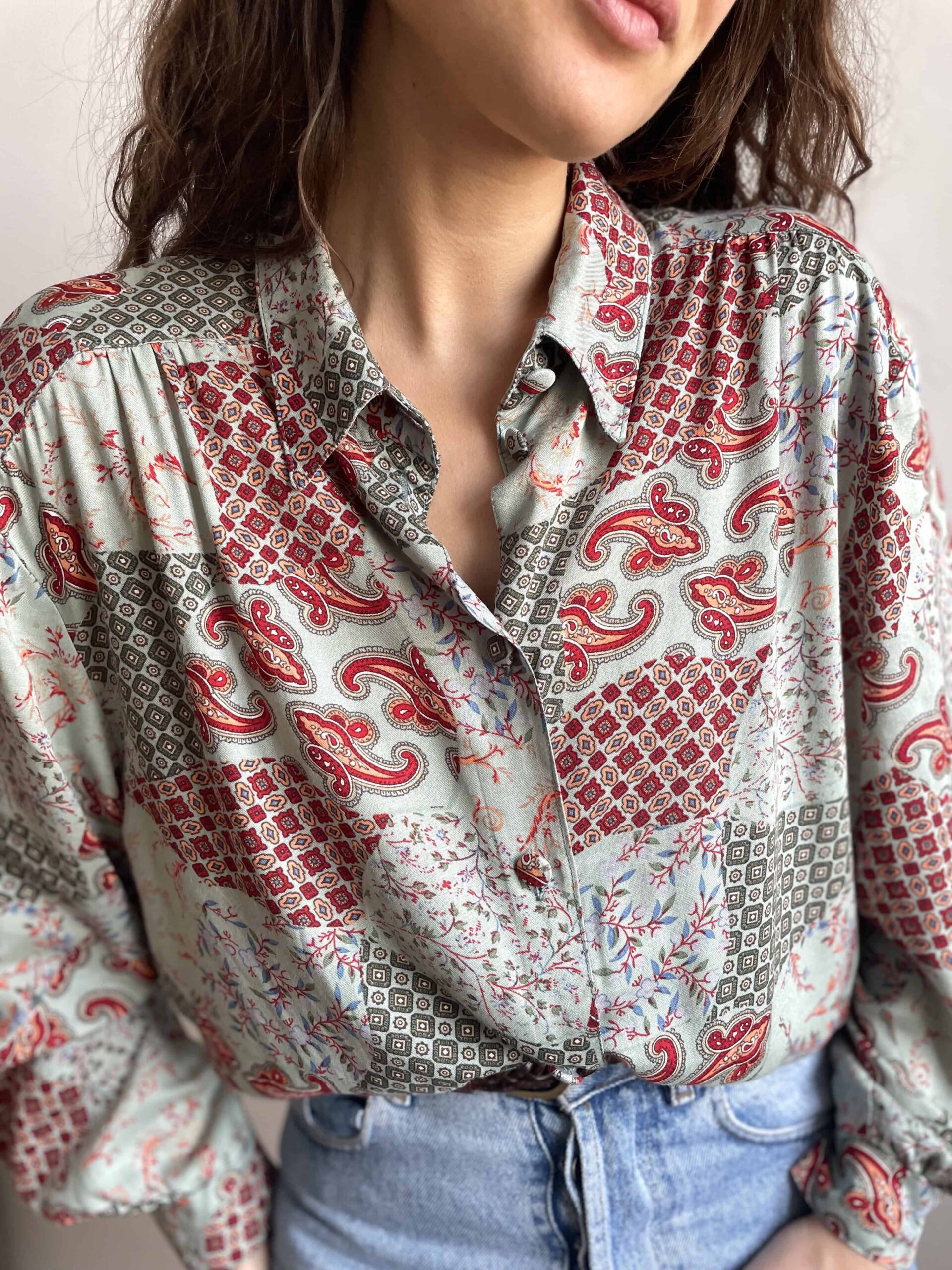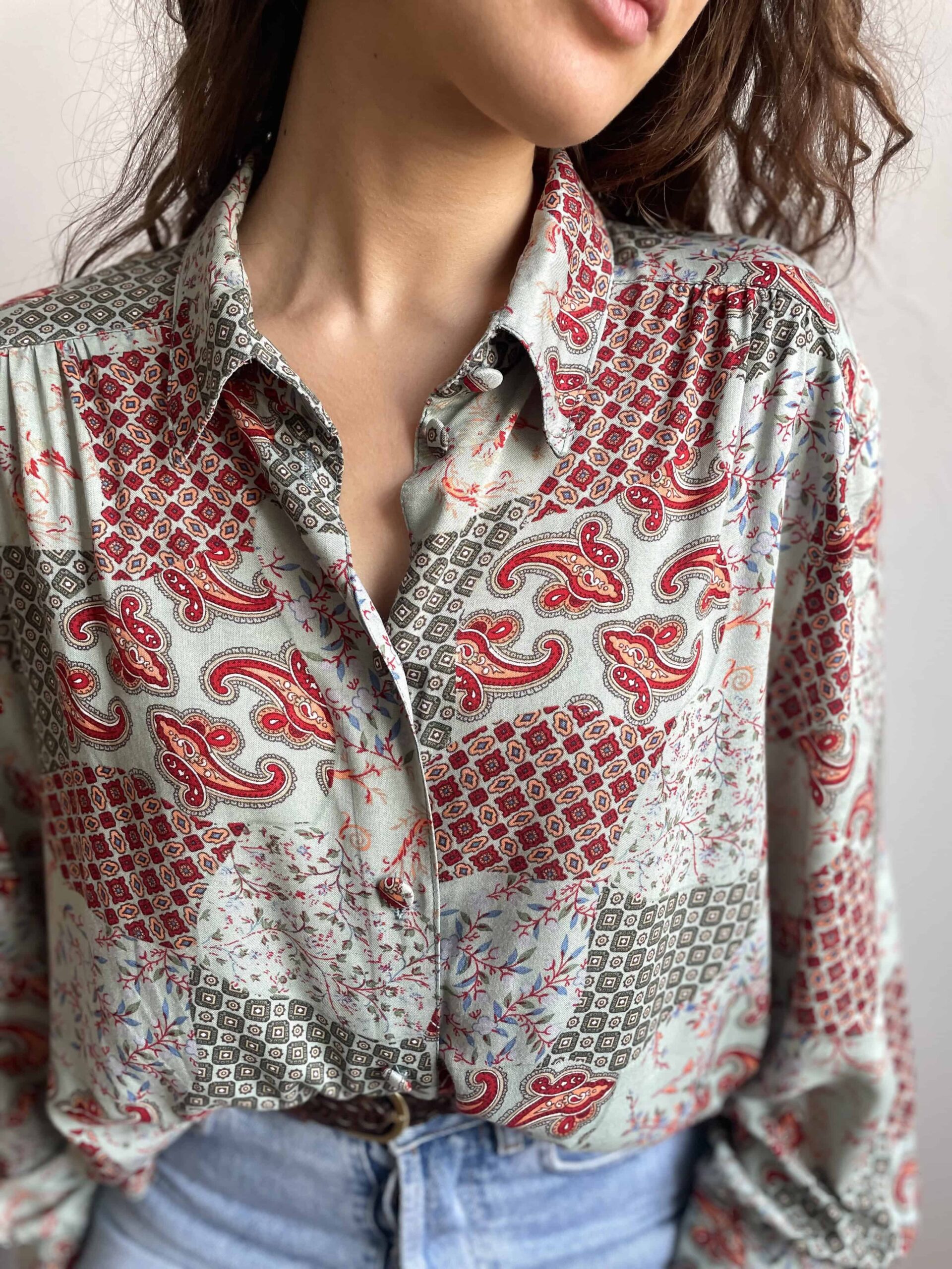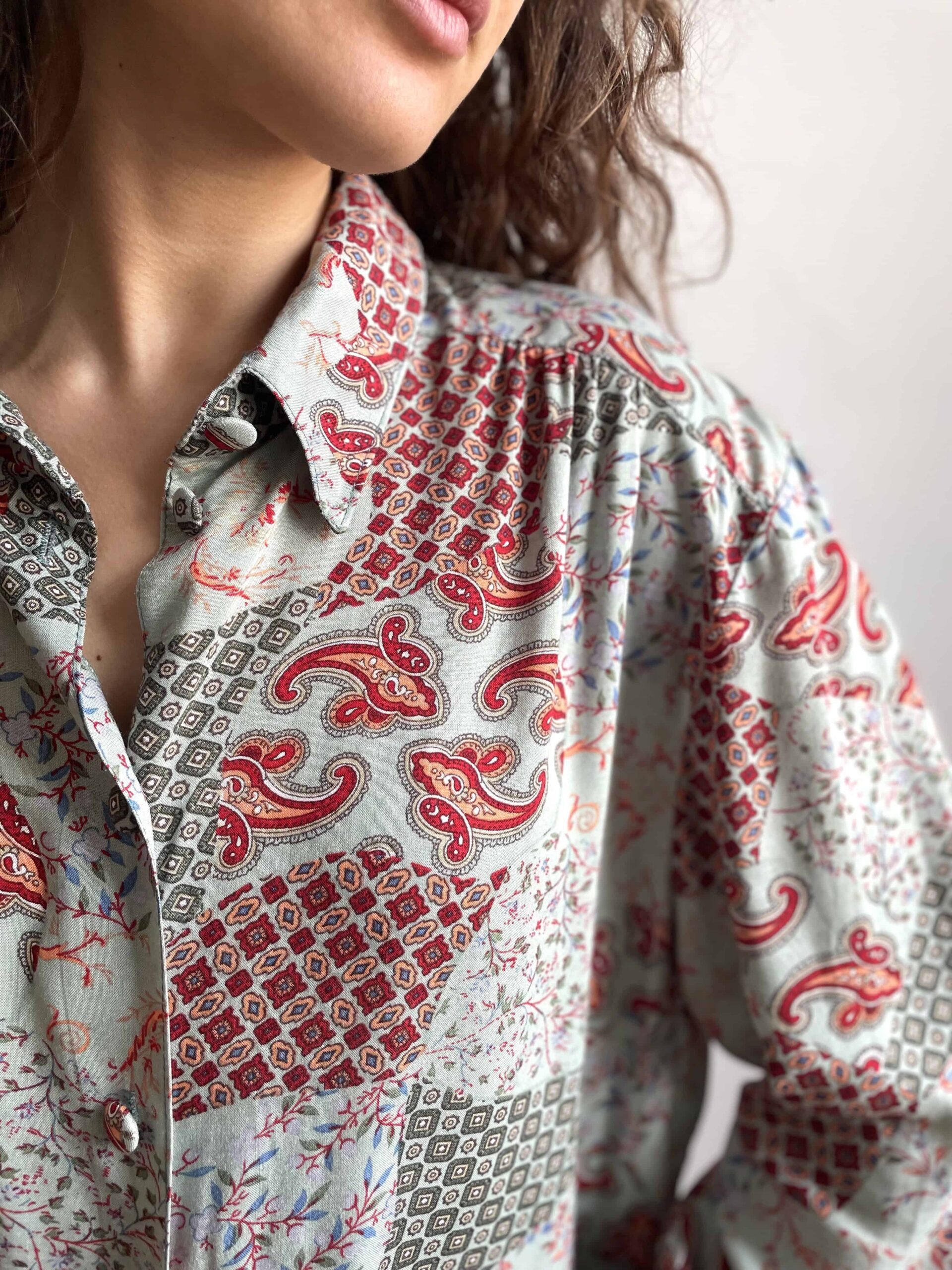 Camicia vintage da donna in 100% pura viscosa morbidissima con splendida fantasia etnica a fiori bordeaux su sfondo verde acqua. Bella fattura con tutti i bottoni rivestiti con lo stesso tessuto e belle pieghe che dalle spalle scendono lungo il petto. Taglia indicativa 48. Fate riferimento alle misure confrontandole con quelle di una vostra camicia: