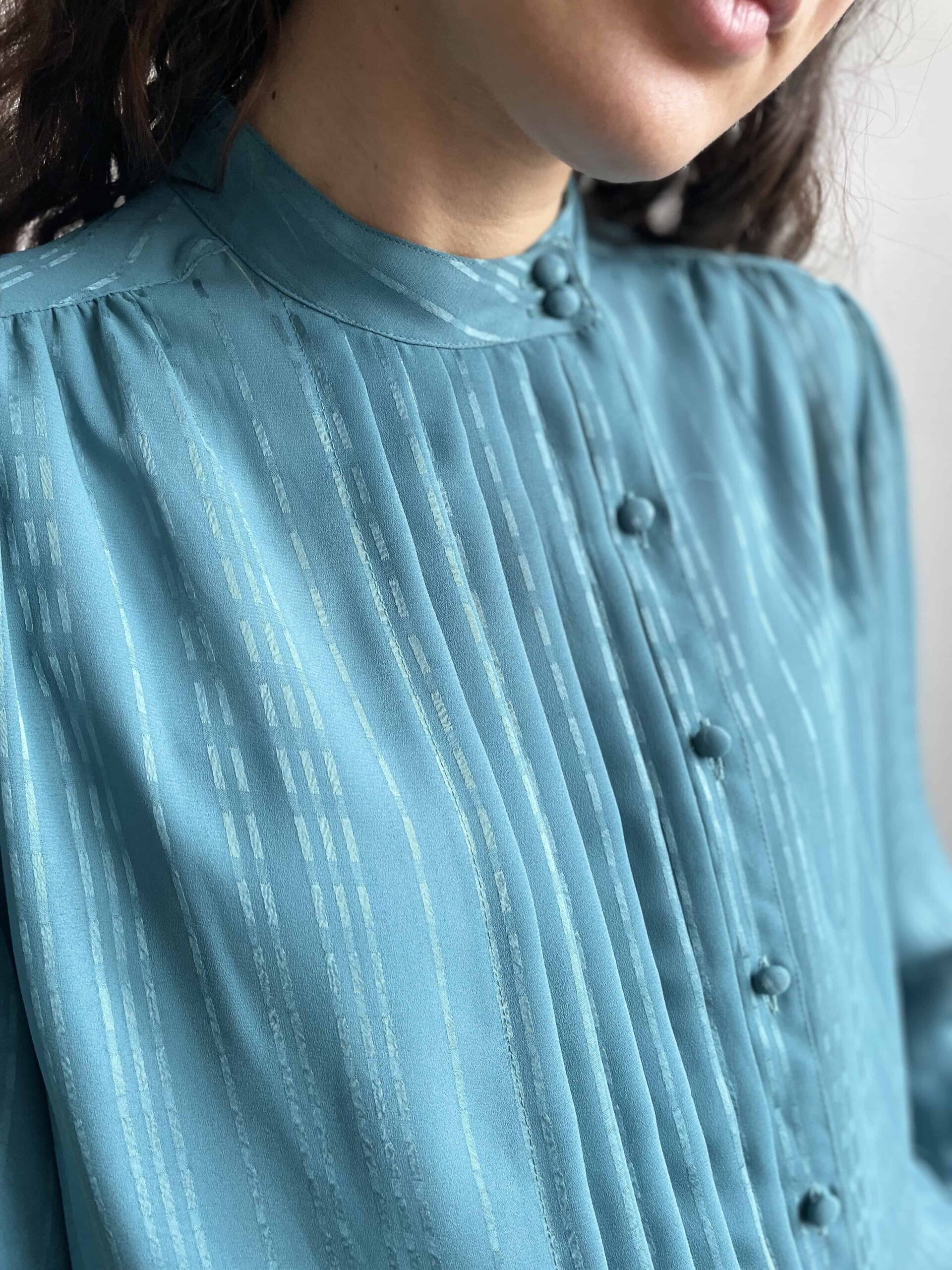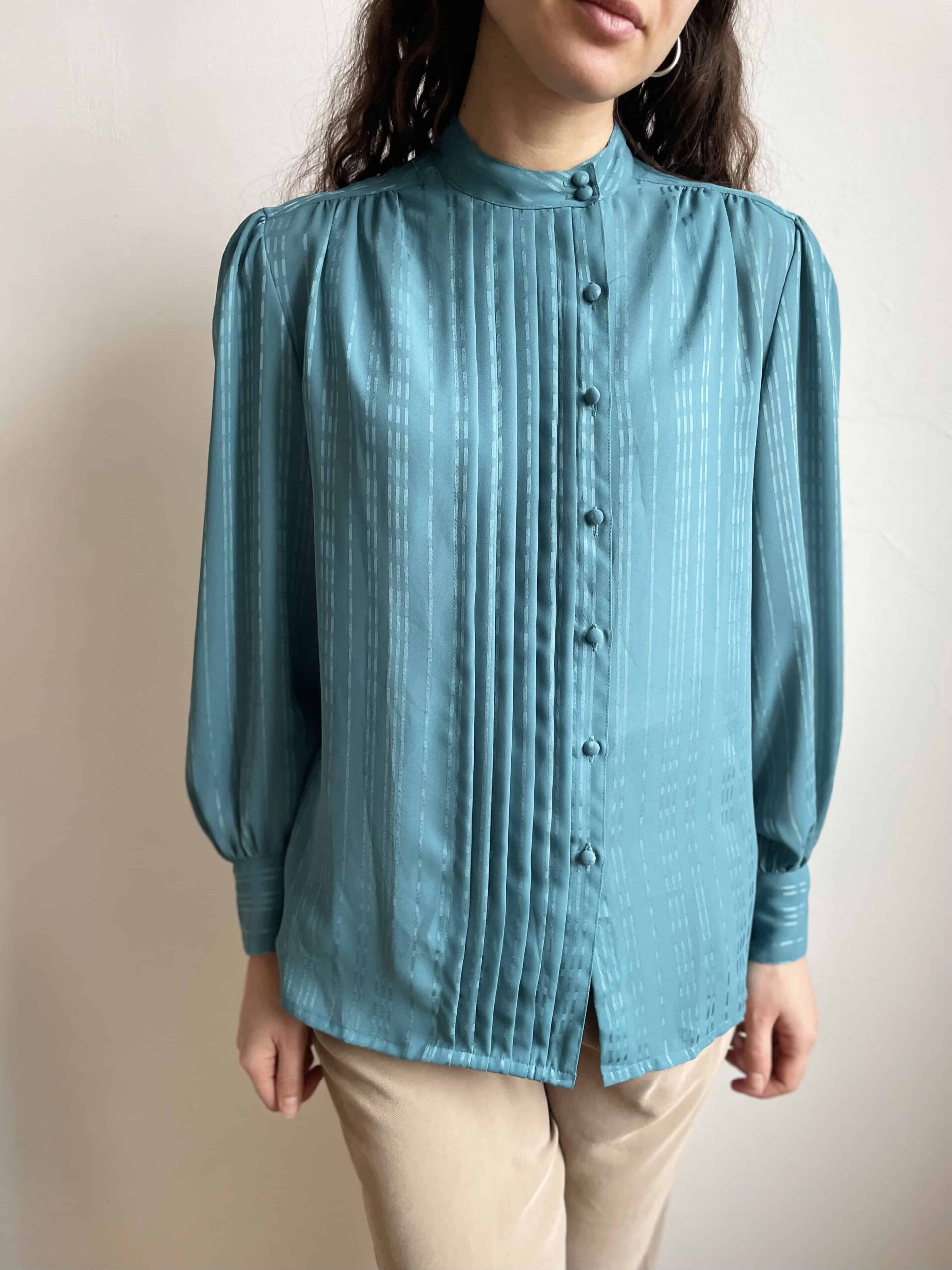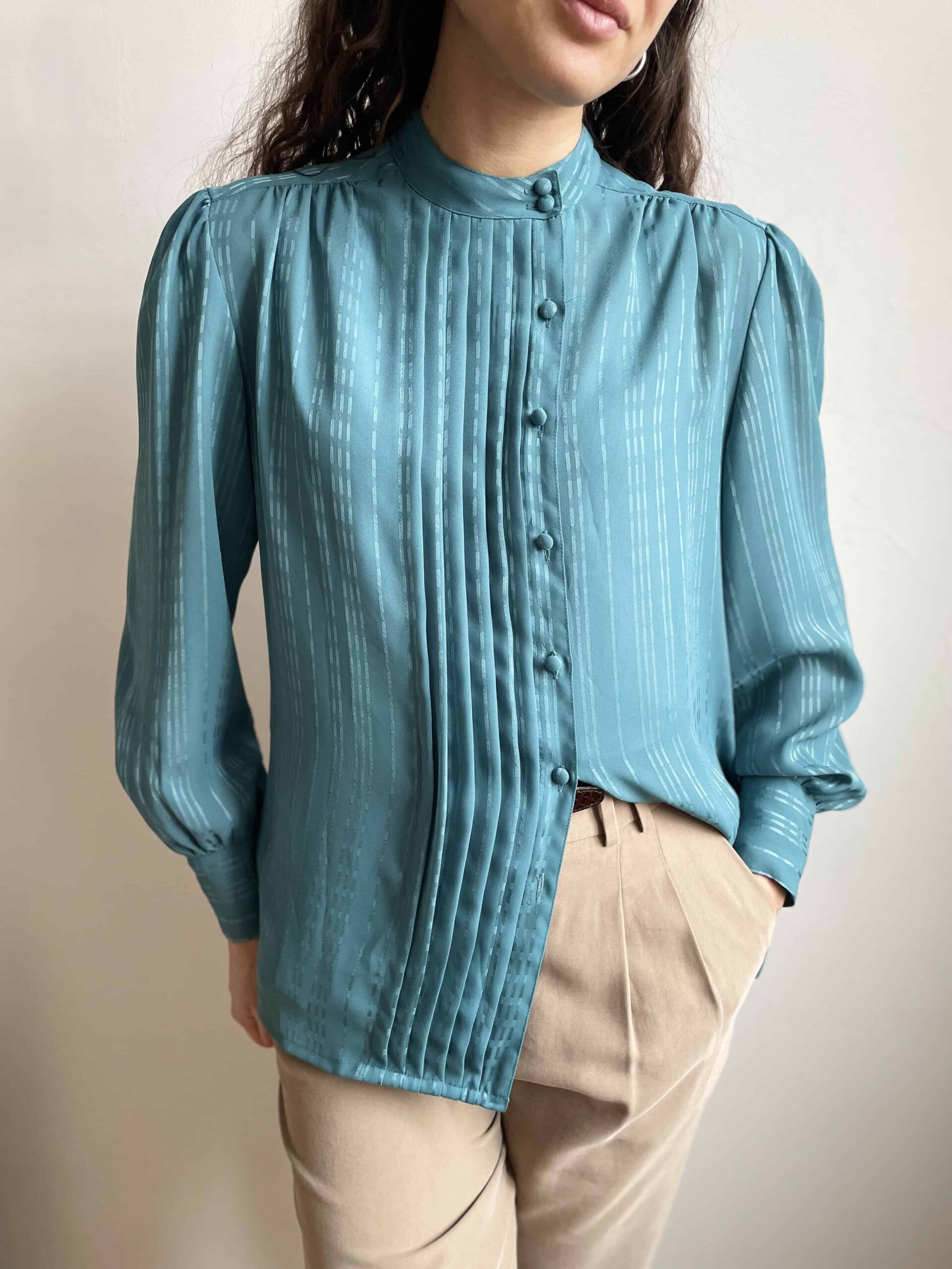Splendida ed elegante camicia vintage color verde acqua scuro/ottanio. Alta cura dei dettagli! Bellissima fattura con collo alla coreana e pieghe centrali. Tutti i bottoni non sono centrali ma leggermente laterali. Tutti i bottoni della camicia sono rivestiti in tessuto (questo è sempre un segno di qualità nei capi) e ci sono tre bottoni anche su ogni polsino! Tessuto leggero in poliestere vintage di ottima qualità (al tatto indistinguibile da una viscosa) con fantasia a piccole righe luminose. La consiglio ad una 42. Fate riferimento alle misure confrontandole con quelle di una vostra camicia: