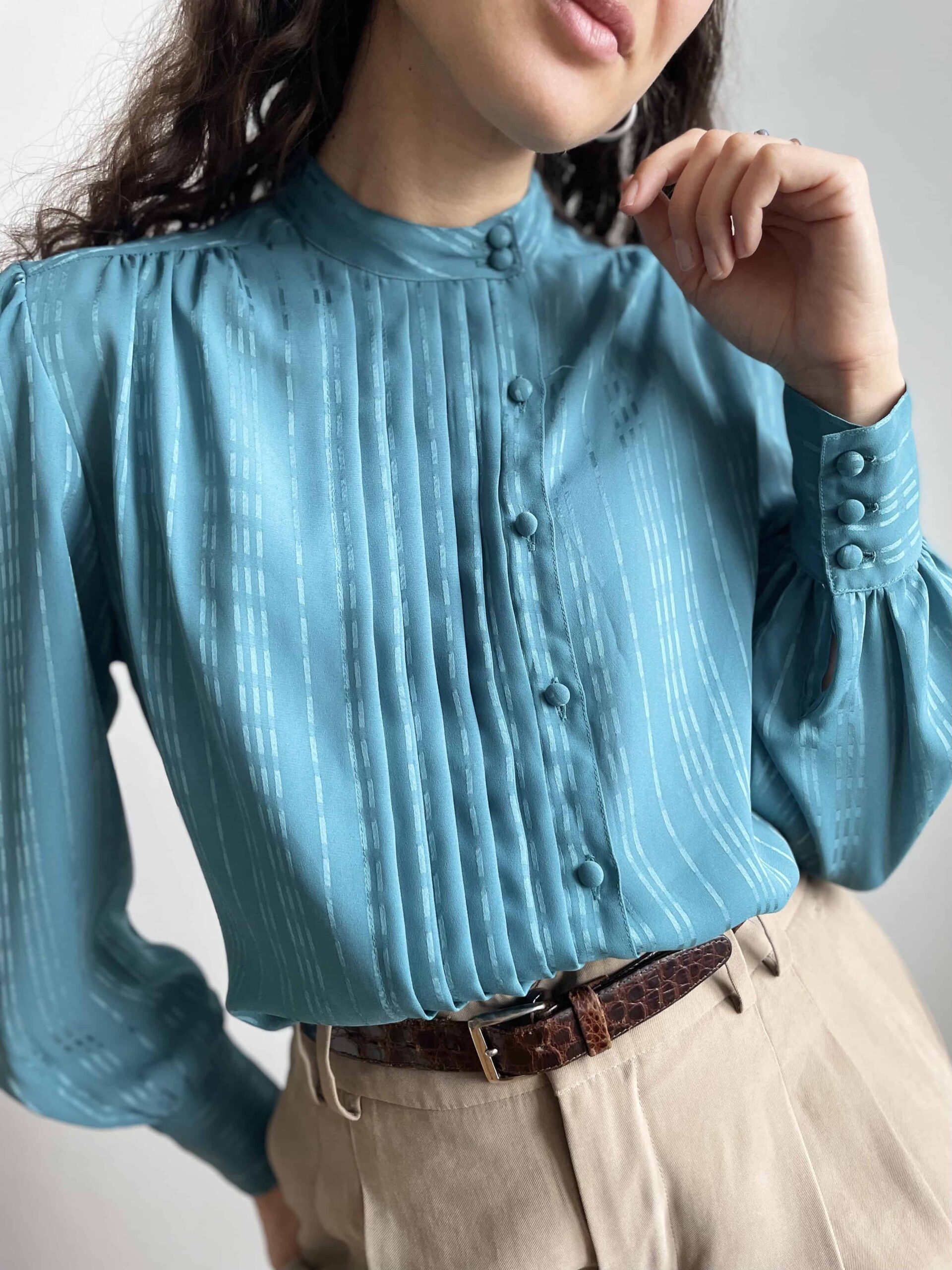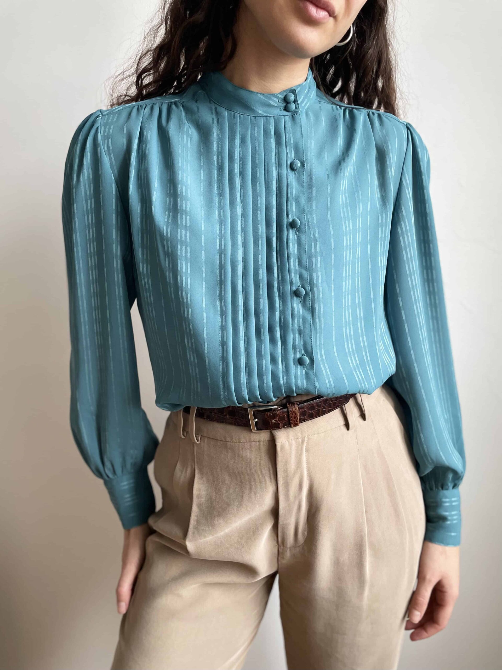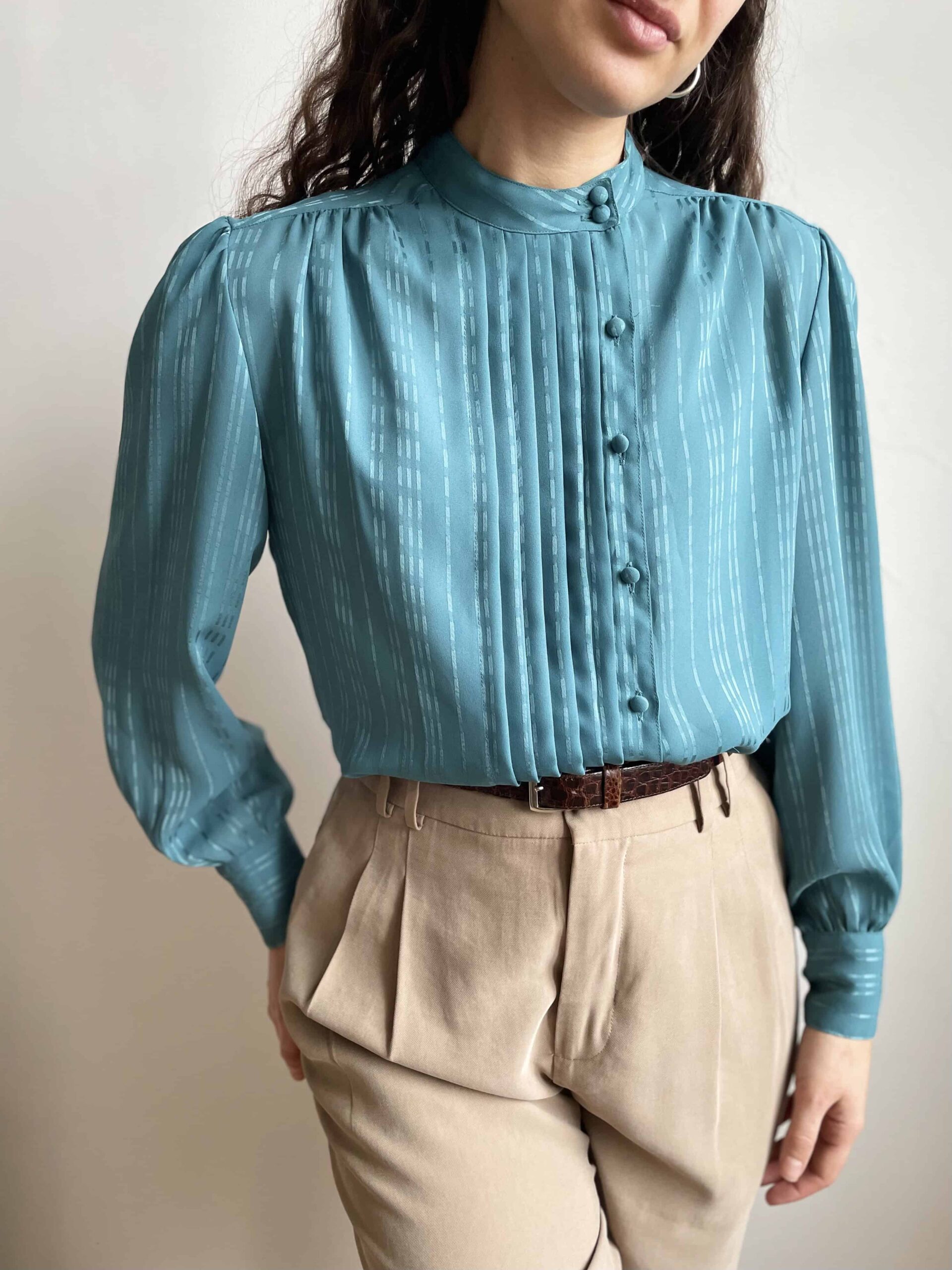 Splendida ed elegante camicia vintage color verde acqua scuro/ottanio. Alta cura dei dettagli! Bellissima fattura con collo alla coreana e pieghe centrali. Tutti i bottoni non sono centrali ma leggermente laterali. Tutti i bottoni della camicia sono rivestiti in tessuto (questo è sempre un segno di qualità nei capi) e ci sono tre bottoni anche su ogni polsino! Tessuto leggero in poliestere vintage di ottima qualità (al tatto indistinguibile da una viscosa) con fantasia a piccole righe luminose. La consiglio ad una 42. Fate riferimento alle misure confrontandole con quelle di una vostra camicia: