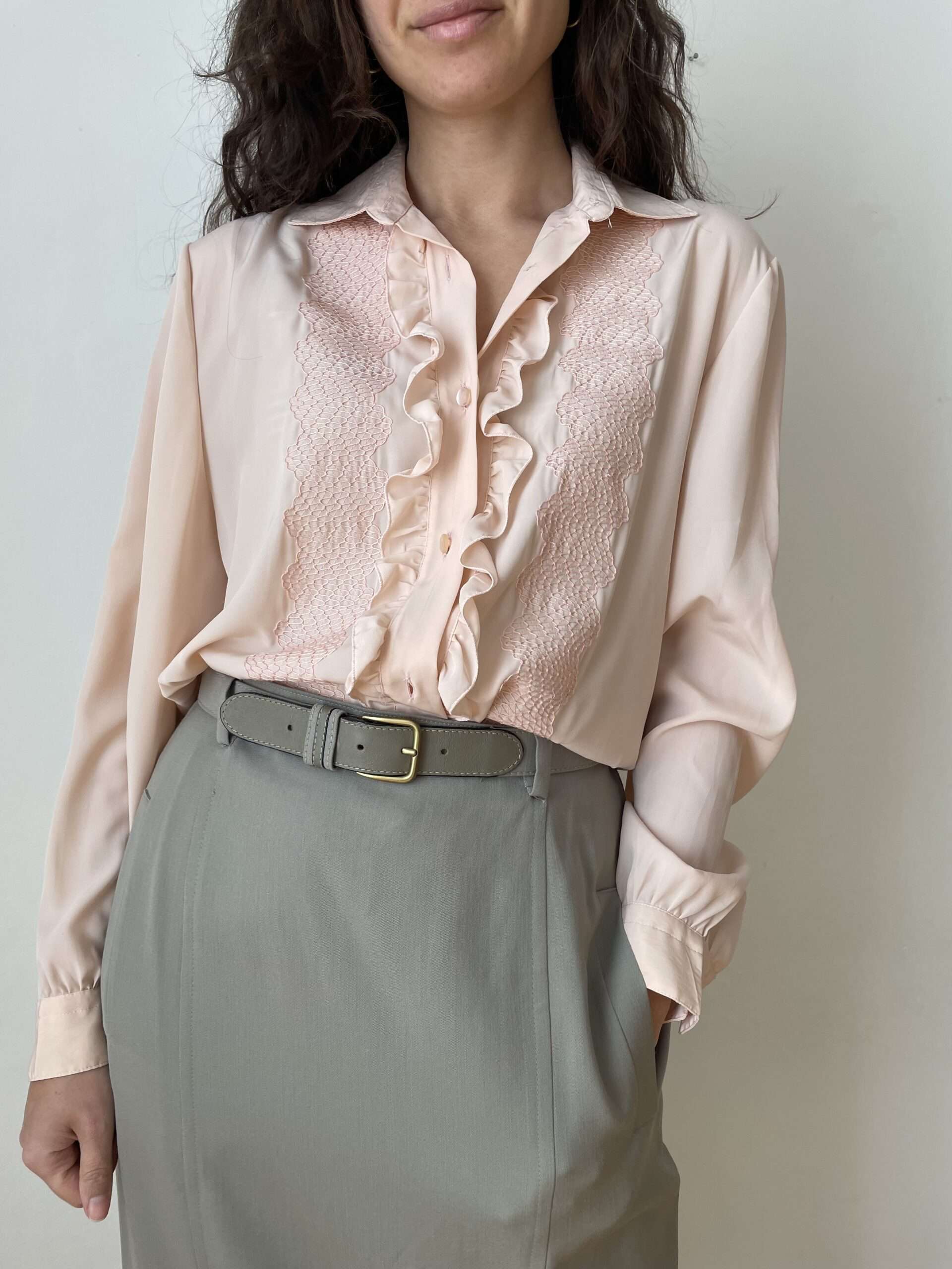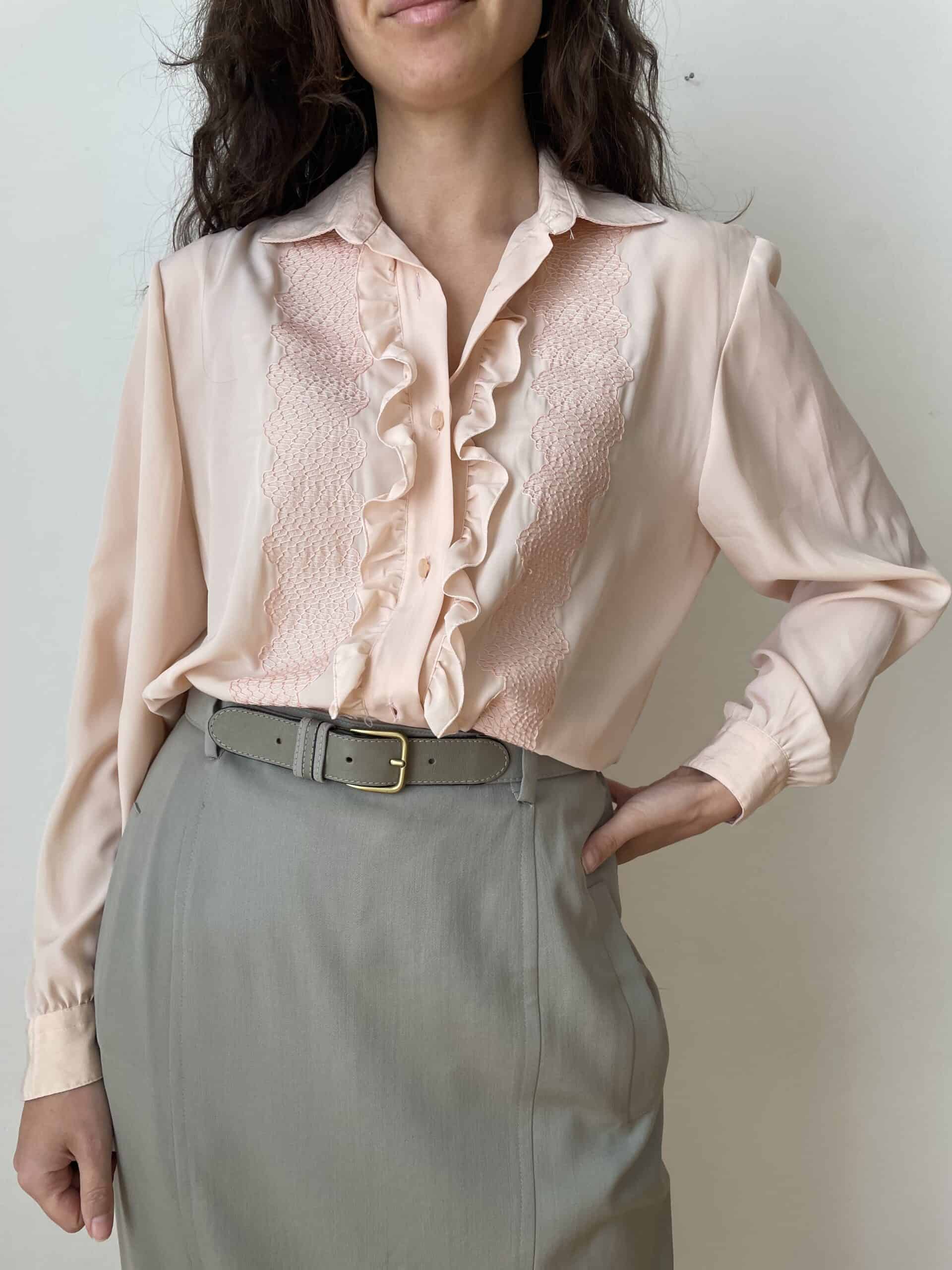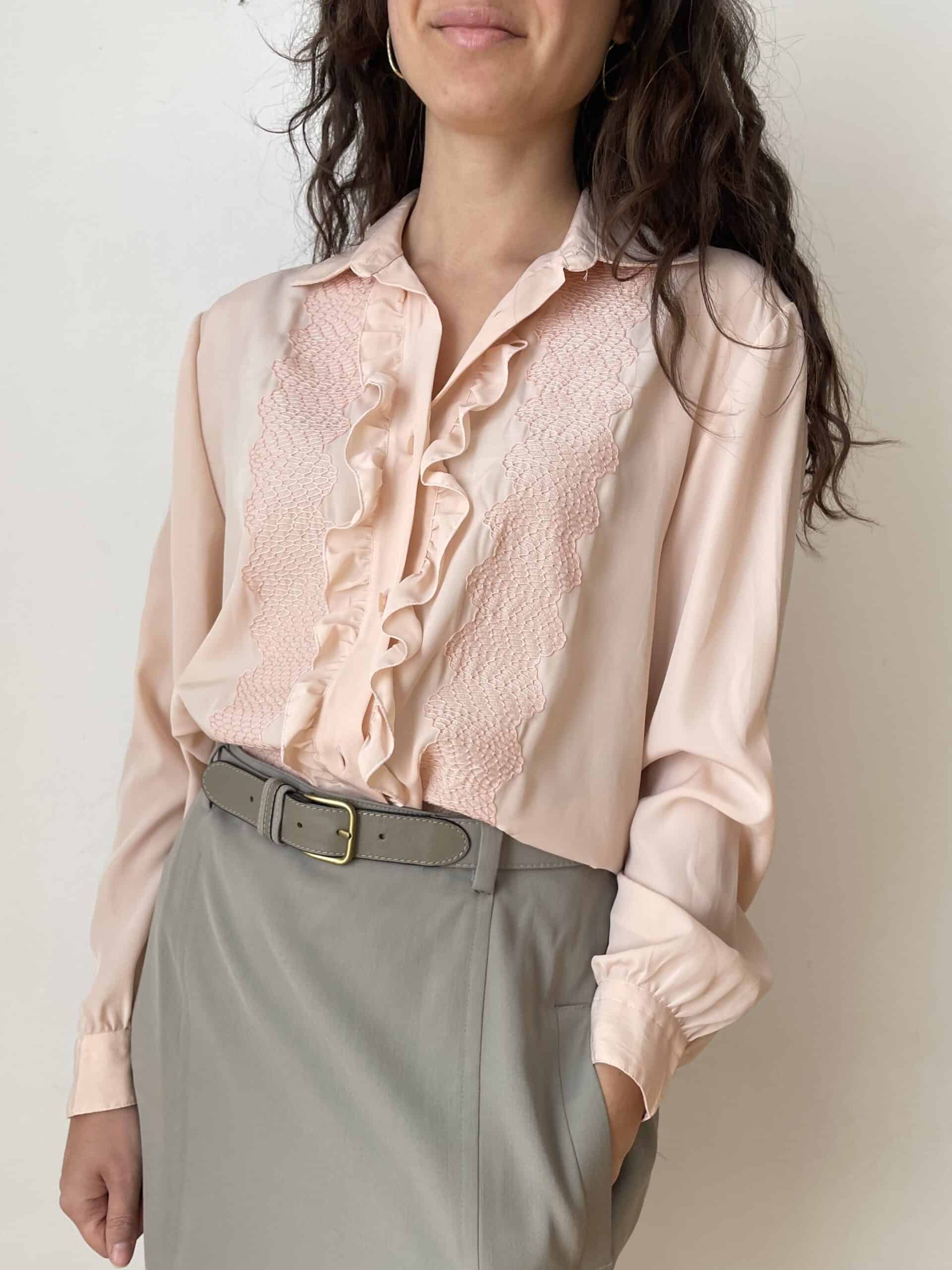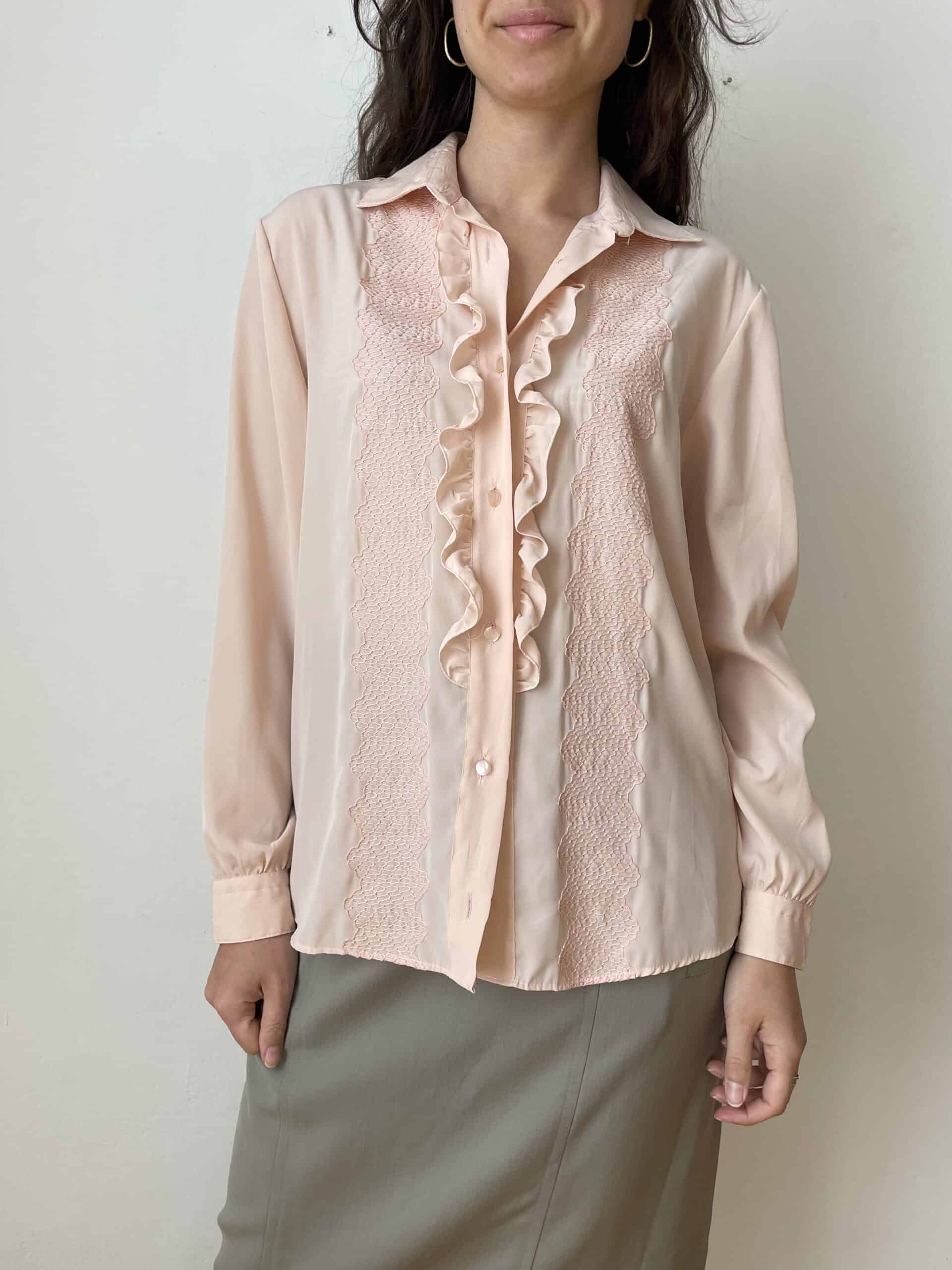 Camicia vintage di colore rosa pallido. Bellissimi ricami a forma di squamette sul petto e splendide rouches centrali. Tessuto leggero e fresco in poliestere di buona qualità, simile alla seta. Perfetta da indossare anche sotto ad una giacca aperta lasciando intravedere le rouches. Taglia indicativa 44, sta bene anche su taglie più piccole portata morbida, come in foto. Fate riferimento alle misure confrontandole con quelle di una vostra camicia: